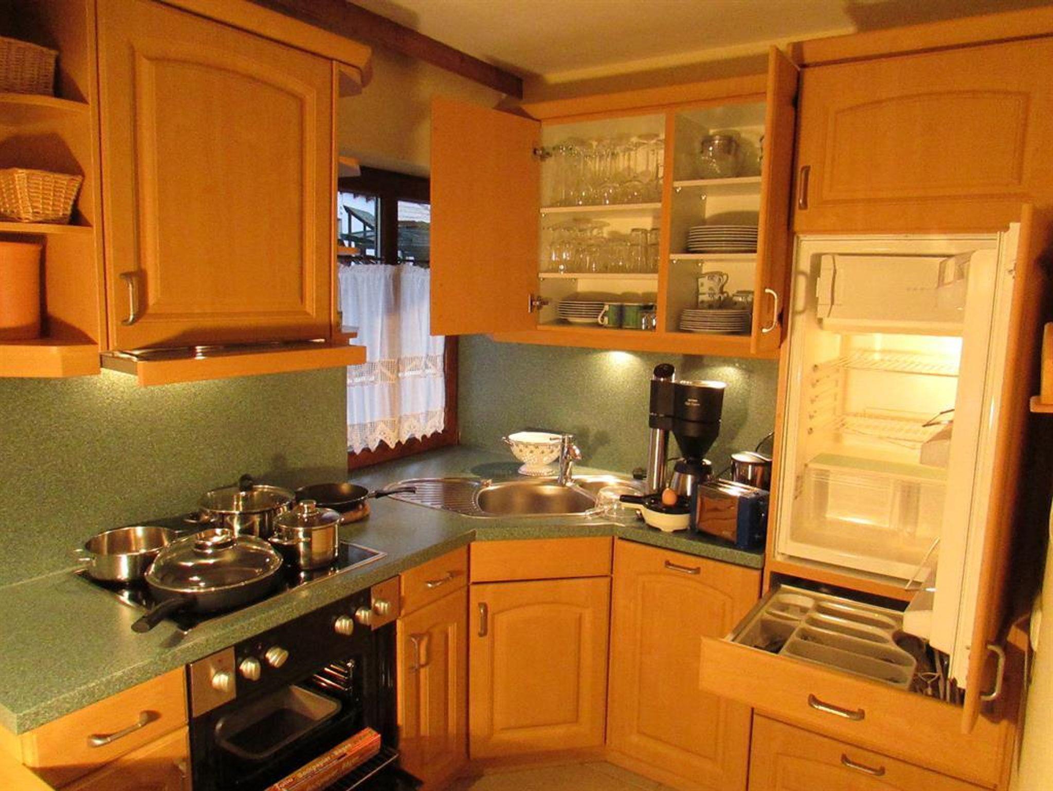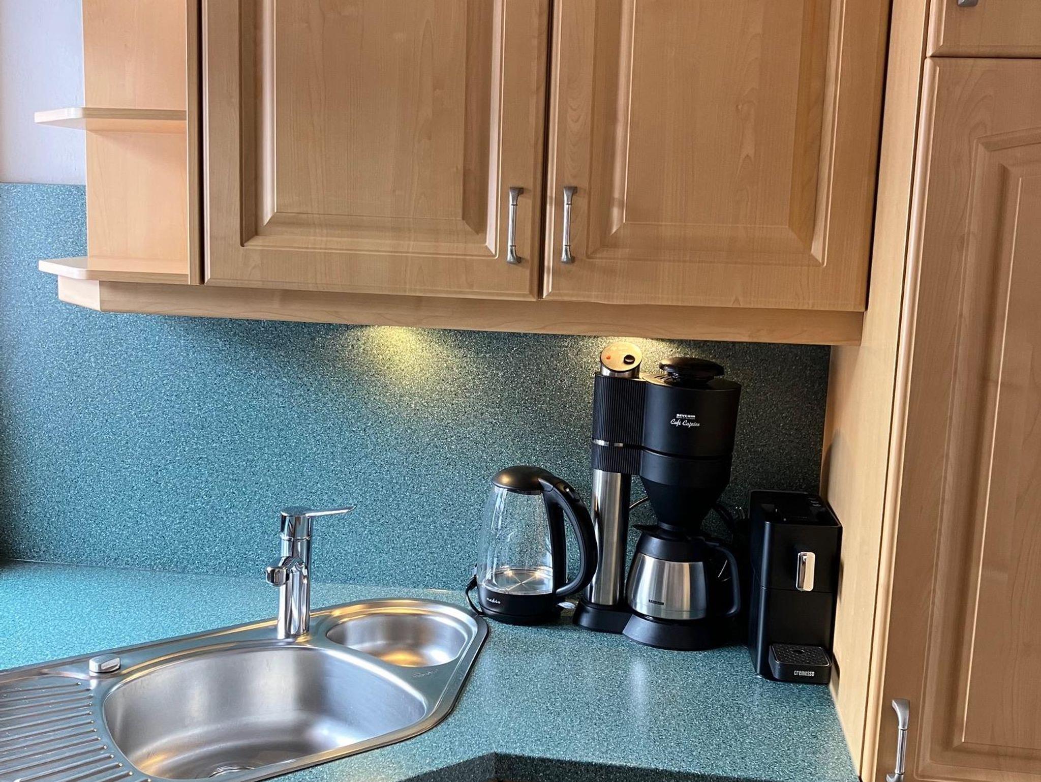 1 separater Schlafraum Doppelbett (1,80x2,00m), Wohnraum (Sofabett für 2 Personen) mit Esstisch, Küche: Ceran-Kochfeld, Backofen, Mikrowelle, Spülmaschine, Kühl-/Gefrierschrank, Kaffeemaschine, Eier-/Wasserkocher, Toaster