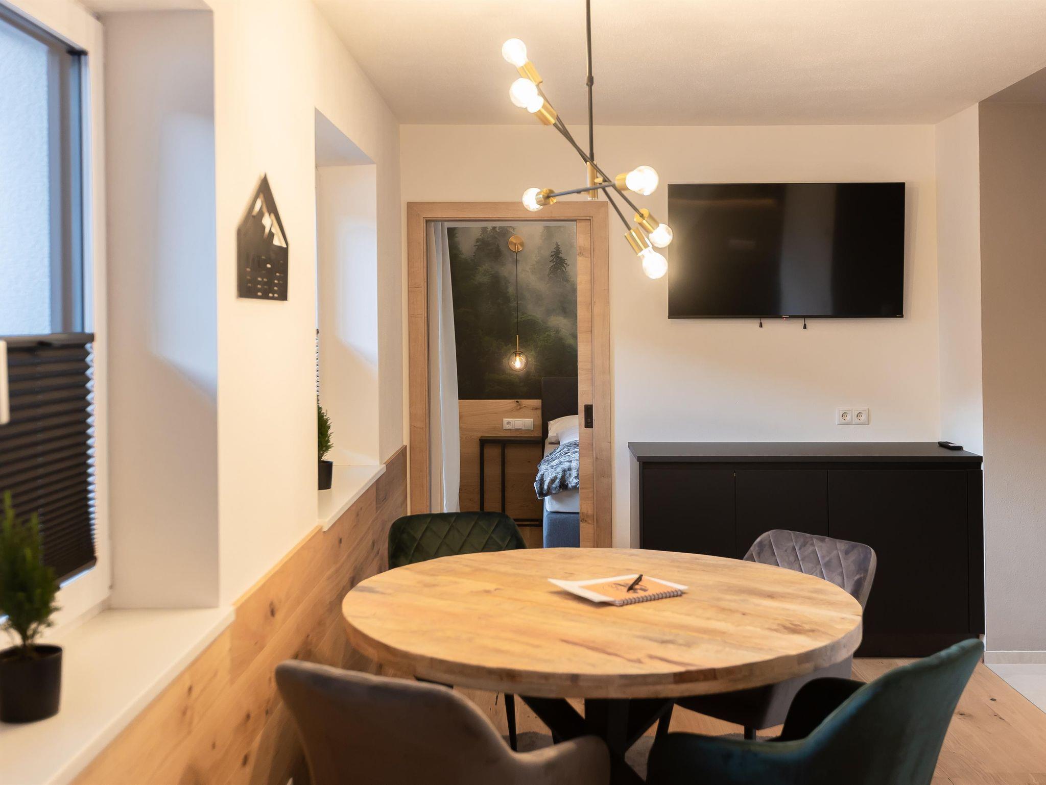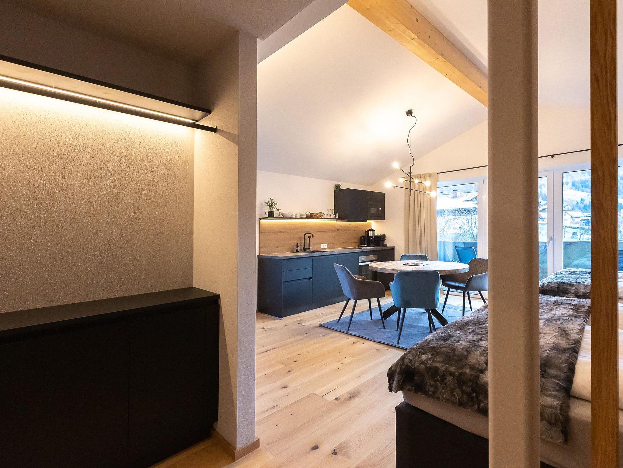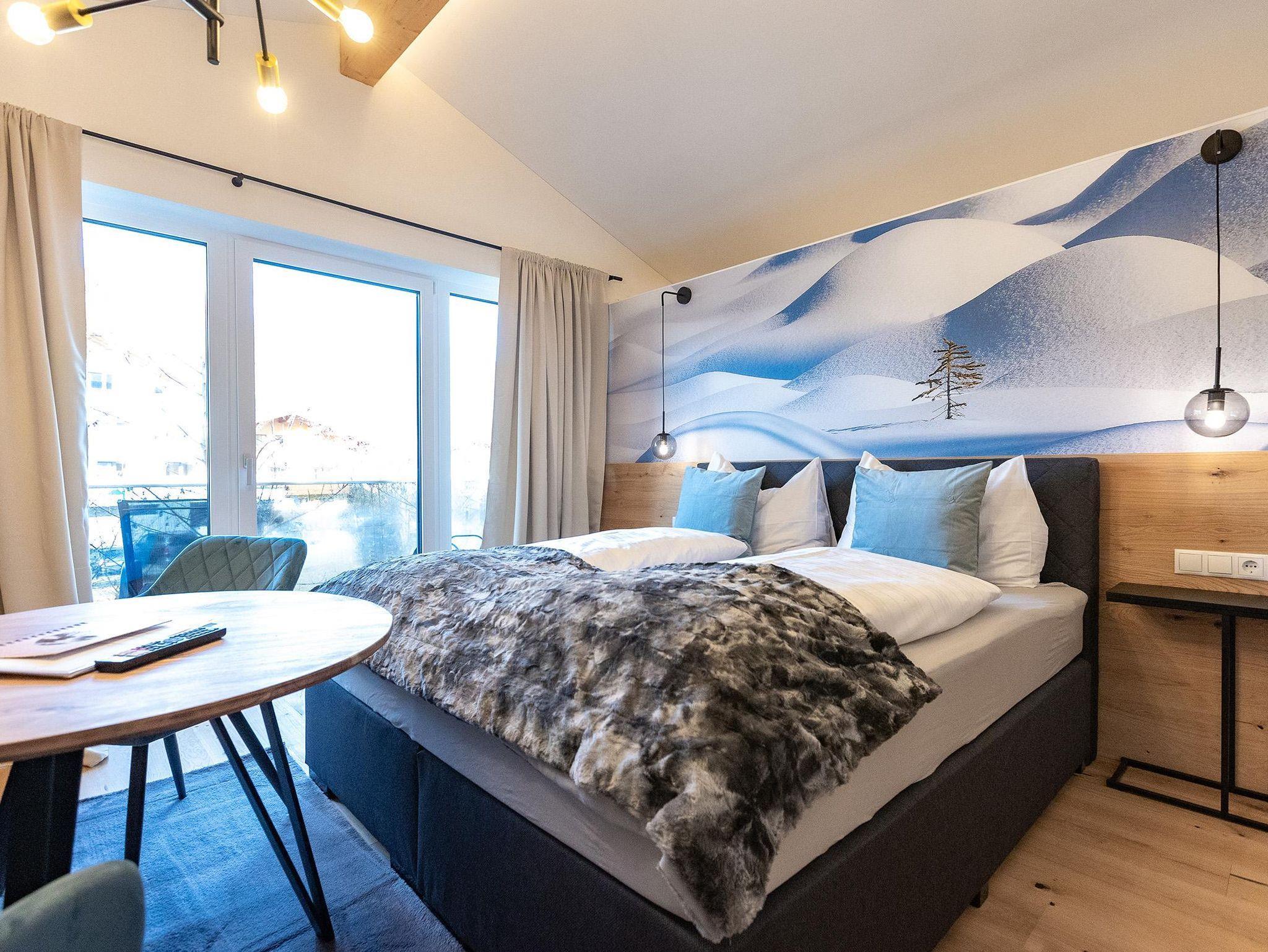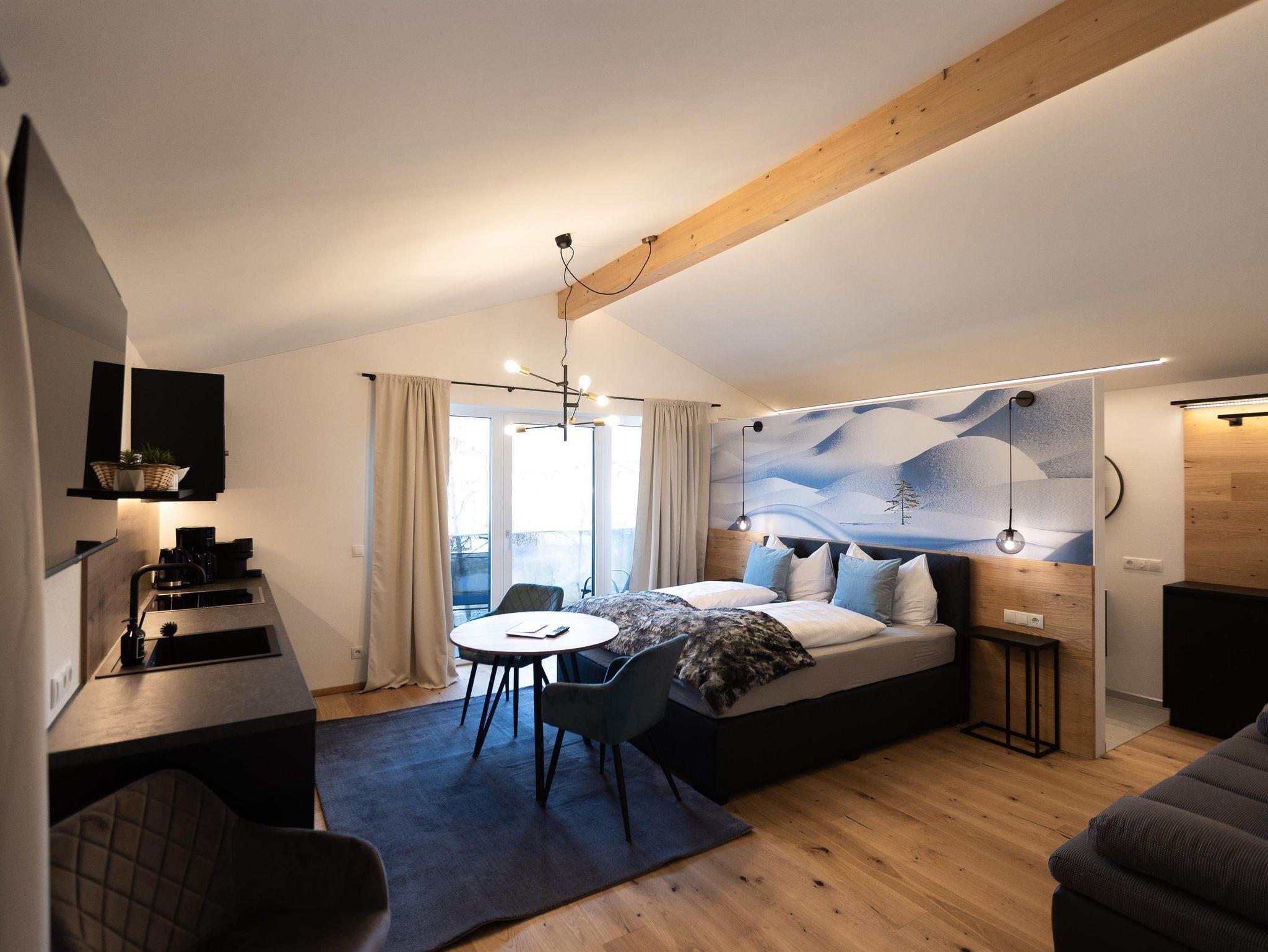 Unser Deluxe Apartment Snowy für 2-3 Personen verfügt über ein komfortables Boxspringbett, offens Badezimmer mit Regendusche, moderne eingerichtete Küchenzeile, Essbereich, Schlafcouch, Balkon, großer Smart TV, WIFI, seperates WC.