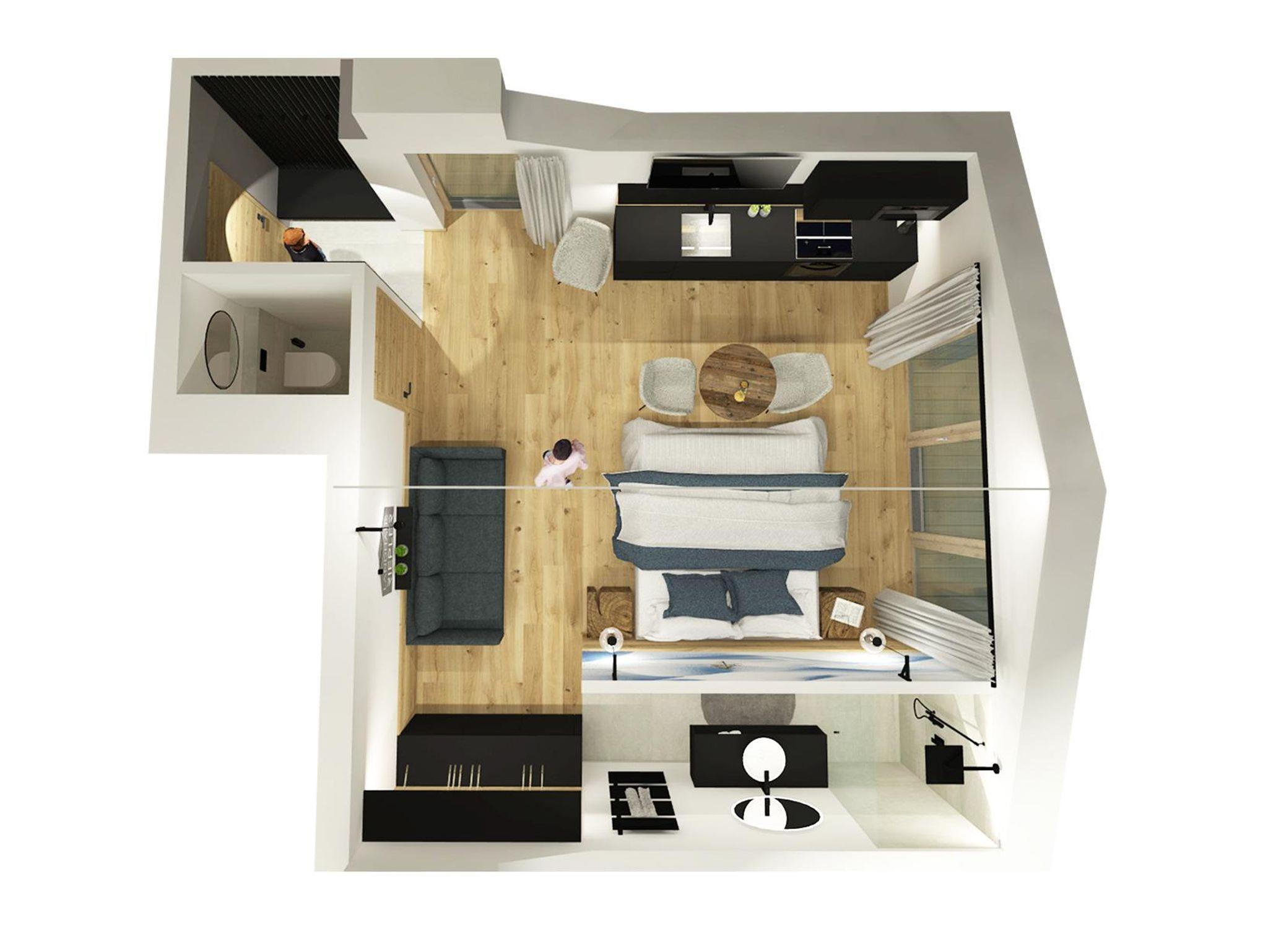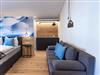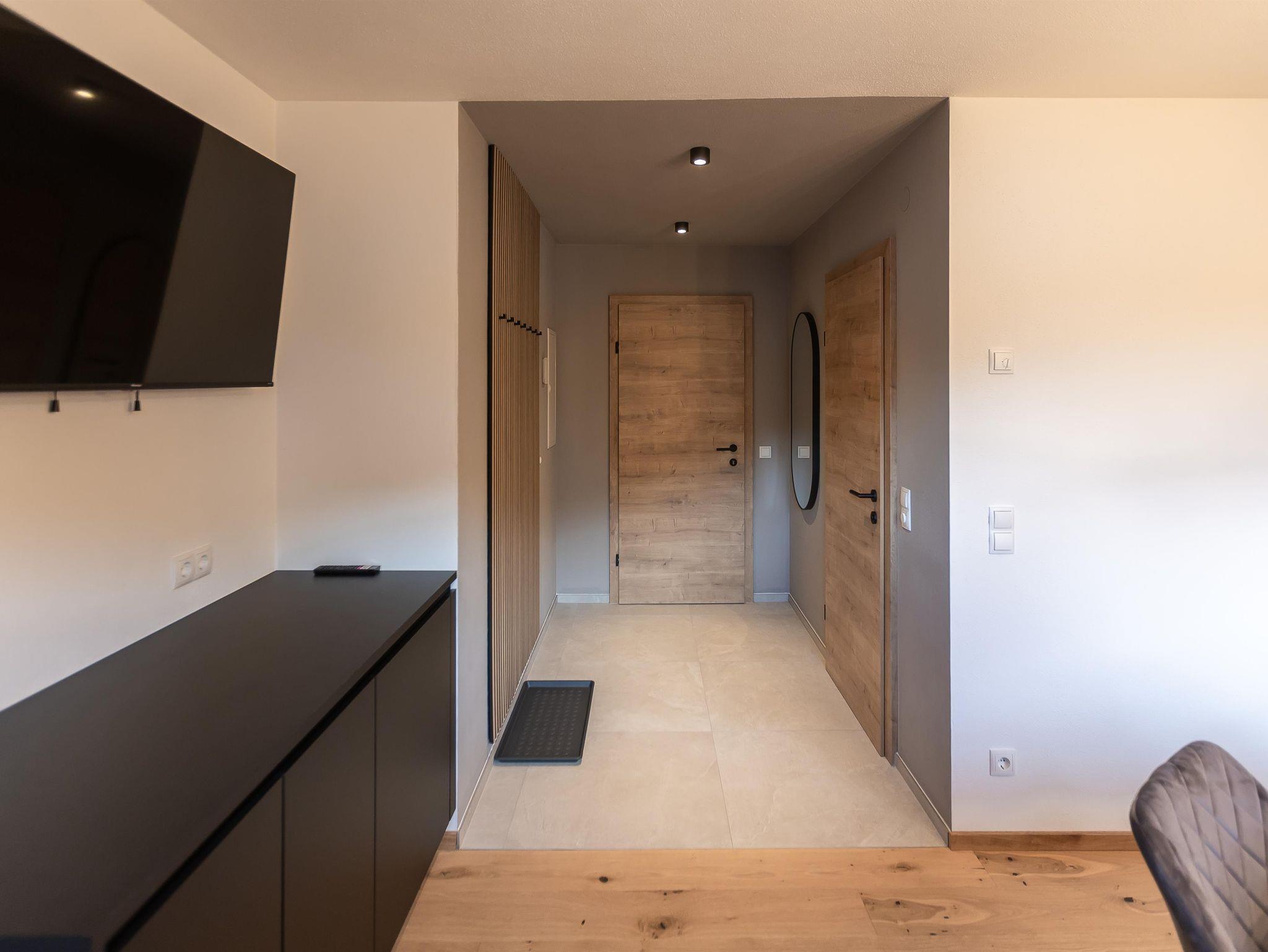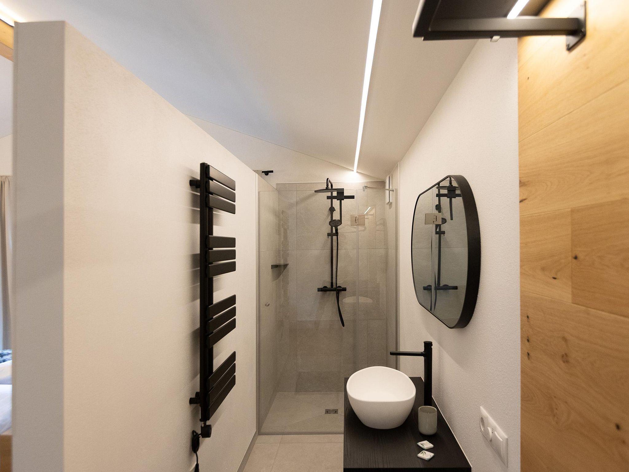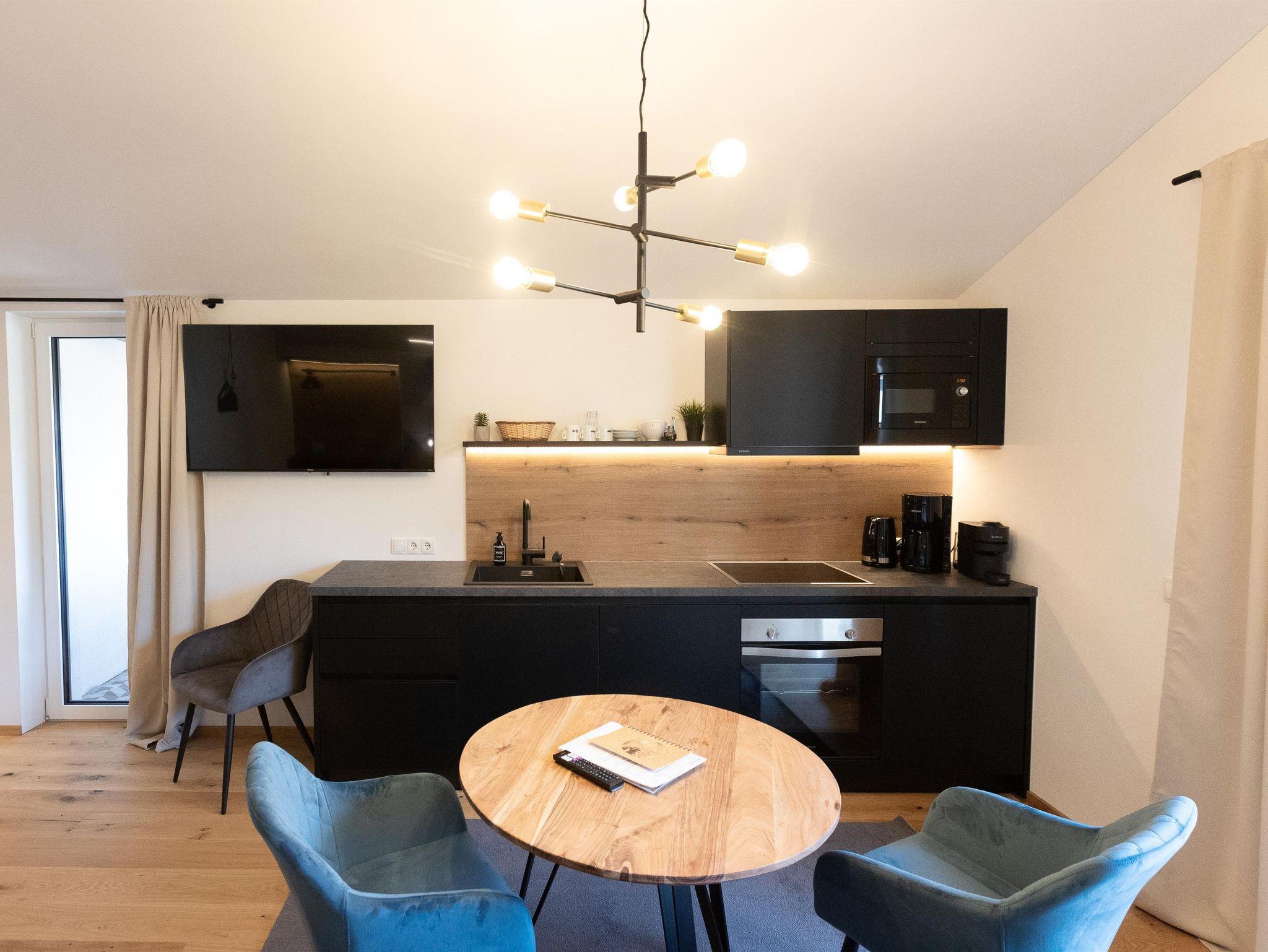 Unser Deluxe Apartment Snowy für 2-3 Personen verfügt über ein komfortables Boxspringbett, offens Badezimmer mit Regendusche, moderne eingerichtete Küchenzeile, Essbereich, Schlafcouch, Balkon, großer Smart TV, WIFI, seperates WC.