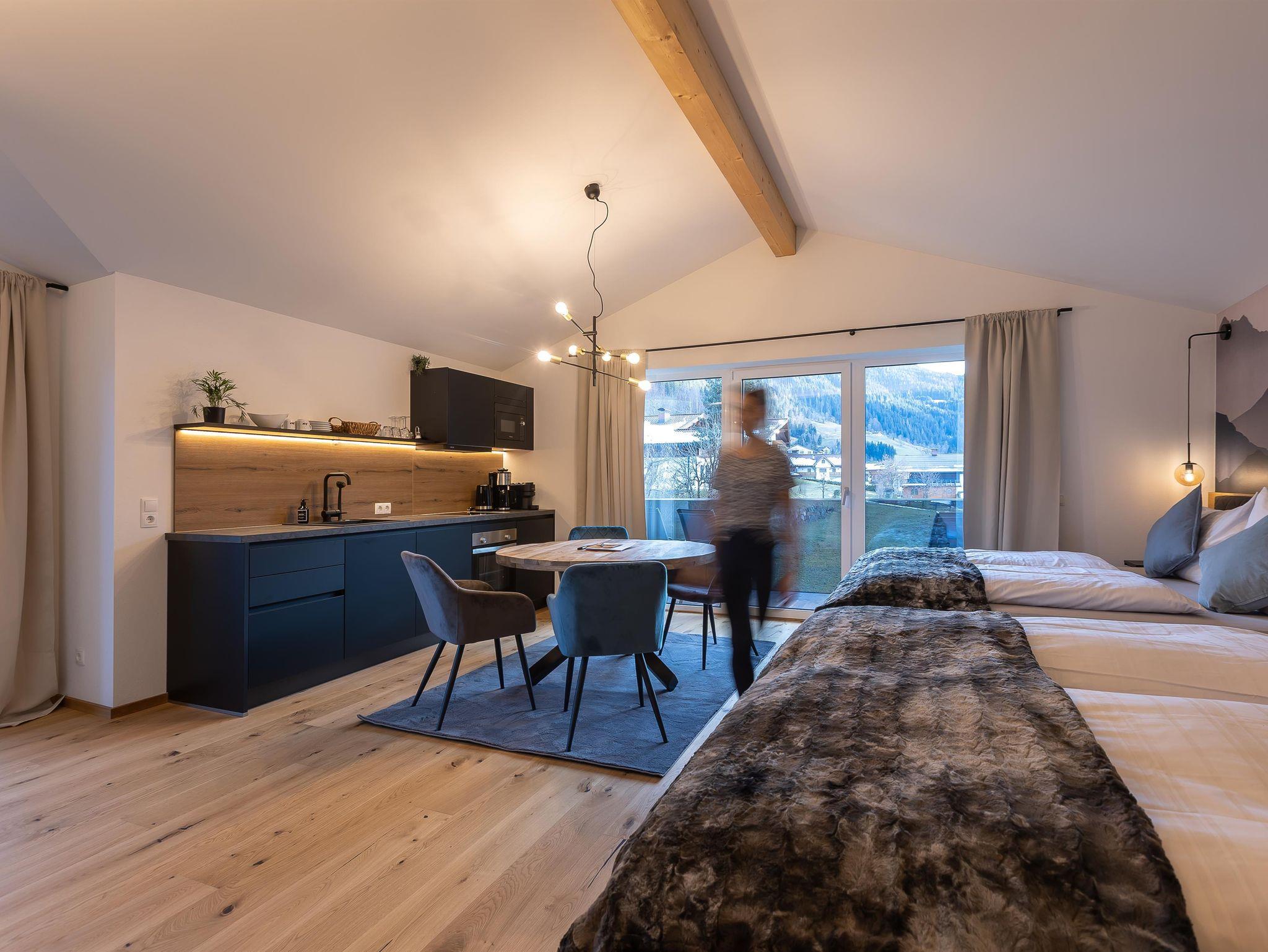Unser Mountainy - Apartment mit Bergblick ist ideal für Familien und Freunde, verfügt über 2 komfortable Boxspringbetten, 1 Bad mit Regendusche, 1 separates WC, moderne Küchenzeile, großer Essbereich, Balkon mit herrlichem Ausblick, WIFI.