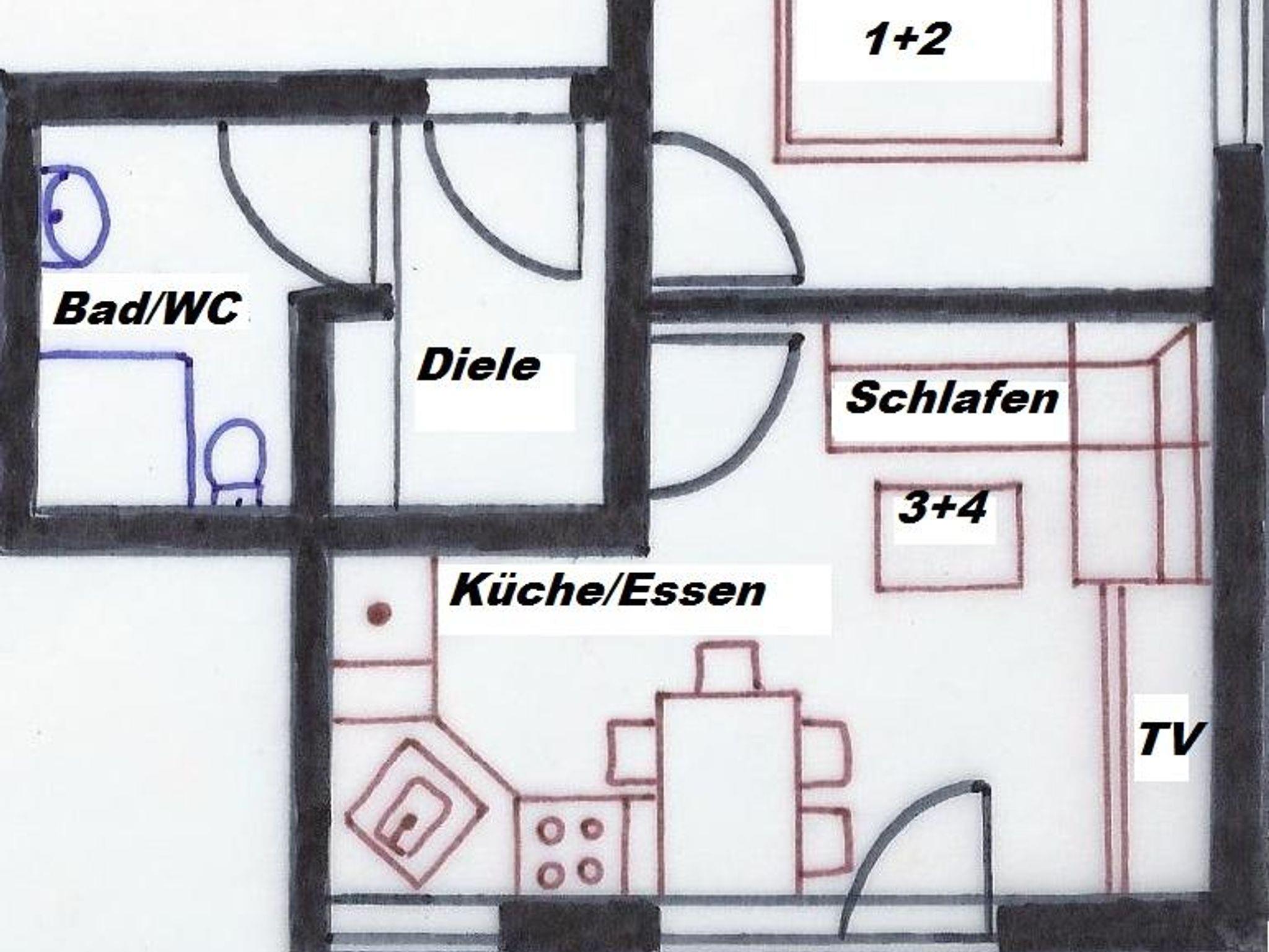 1 separater Schlafraum Doppelbett (1,80x2,00m), TV, Wohnen (Sofabett 2 Pers.), TV, Esstisch, Küche: Ceran-Kochfeld, Backofen, Mikrowelle, Spülmaschine, Kühl-/Gefrierschrank, Kaffeemaschine, Eier-/Wasserkocher, Toaster