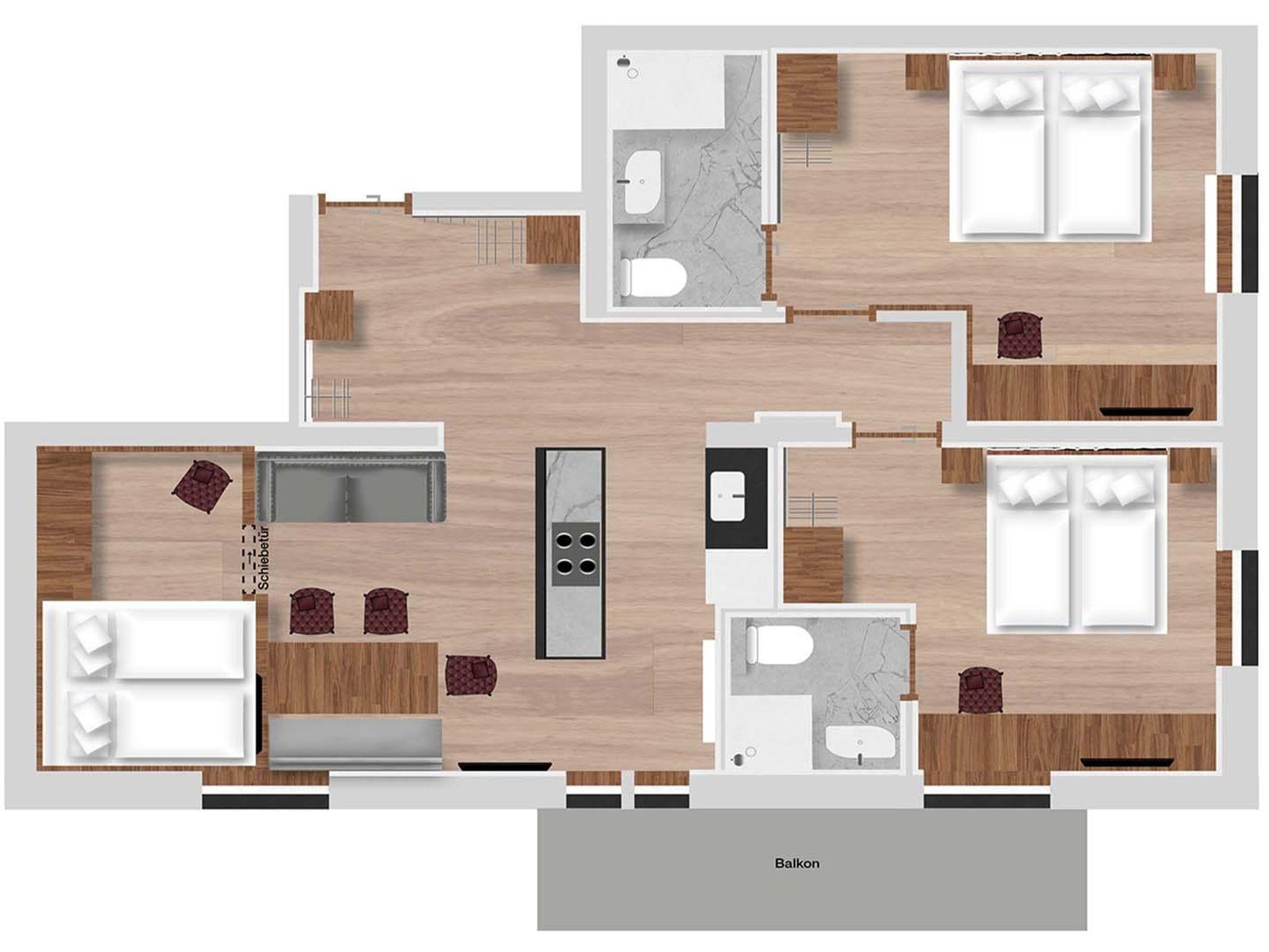 Dieses Trend Apartment bietet Ihnen 2 Schlafräume mit gemütlichen Boxspringbetten, eine Kinderkoje, eine große Wohnküche zum Kochen und Relaxen sowie einen Balkon (7m²). Lage: Nord/Straße, Balkon straßenseitig,