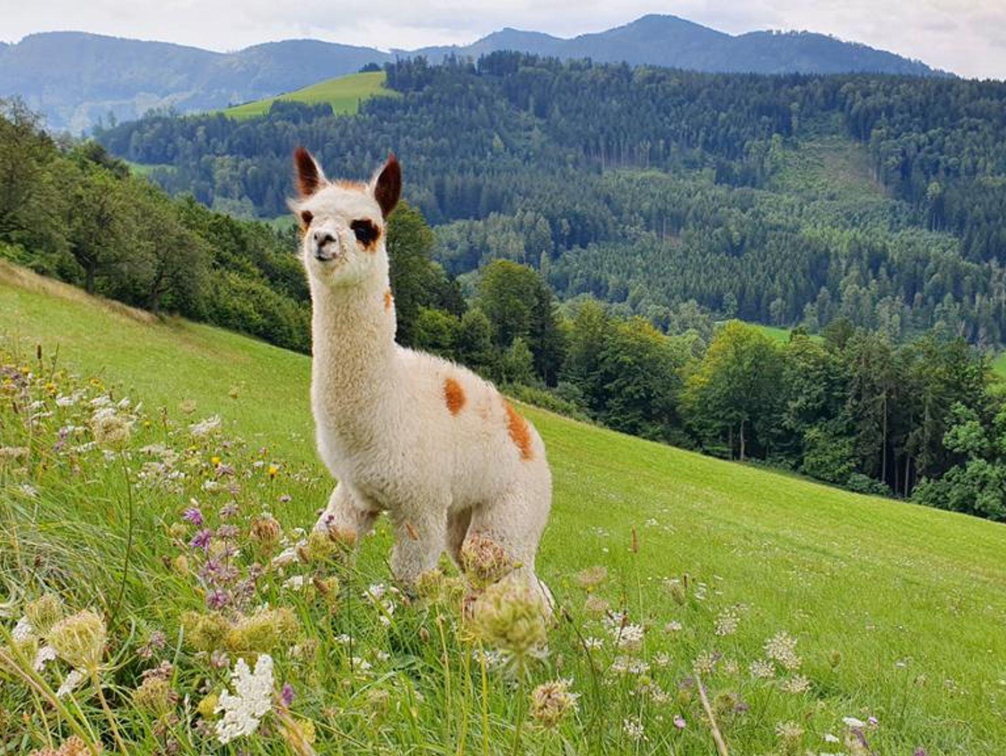 Sanftmütige Alpakas leben auf dem Hof und können bei geführten Wanderungen begleitet werden. Zudem sind hochwertige Alpakaprodukte wie Decken, Schuheinlagen und Wolle erhältlich.