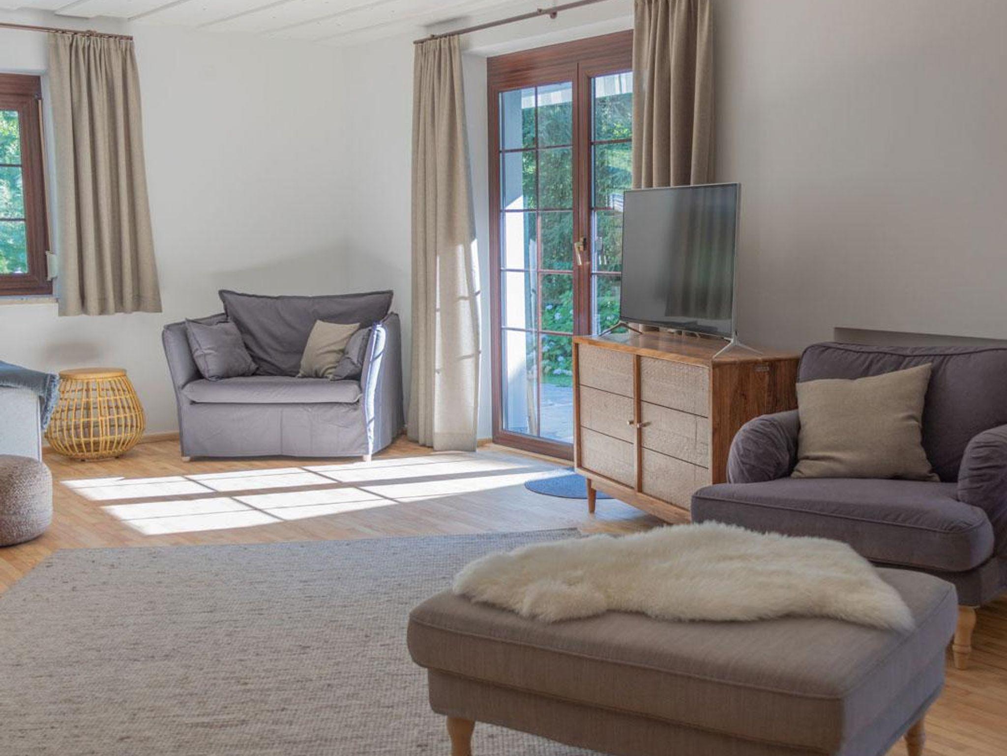 Der Eingangsbereich mit Gäste-WC führt in den großzügigen Wohnbereich, sowie in das Obergeschoss mit 4 Zimmern. Insgesamt verfügt das Haus über 5 Schlafzimmer und 4 Badezimmer. Vom Wohnzimmer und der Küche hast Du einen direkten Zugang auf die Terrasse mit diversen Sitz- und Liegemöglichkeiten samt Holzkohlegrill. Umrandet wird das Haus von einer weitläufigen Grünanlage, die zum Spielen und Entspannen einlädt. Direkt auf dem Grundstück befinden sich 4 kostenfreie Parkplätze und eine Garage, die als Abstellmöglichkeit für diverses Equipment (z.B. Fahrräder oder Ski) genutzt werden kann.