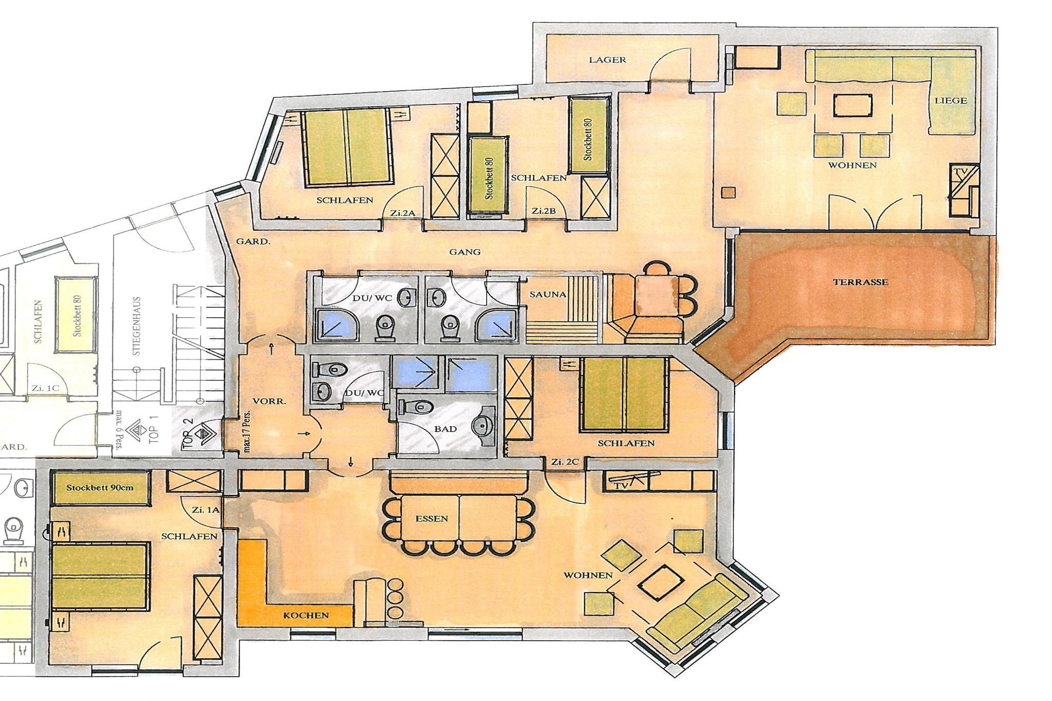 På 1. etage: (Stue(dobbeltsovesofa, Fjernsyn, spisebord, sofahjørne), åbent køkken(spisebord, sofahjørne, radio, kogeplade(Komfur med fire kogeplader, glaskeramisk), elkedel, kaffemaskine, ovn, mikrobølgeovn, opvaskemaskine , køleskab(+ fryser)), soveværelse(dobbeltseng), soveværelse(dobbeltseng), soveværelse(køjeseng, køjeseng), soveværelse(dobbeltseng, køjeseng), badeværelse(bruser, toilet), badeværelse(bruser, toilet), badeværelse(bruser, toilet), badeværelse(bruser, toilet), sauna, sauna) tørretumbler(deles med andre gæster, betalt), vaskemaskine(deles med andre gæster, betalt), balkon, terrasse, parkering, parkering, parkering, parkering, swimmingpool(deles med andre gæster)