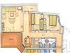 På 1. etage: (Stue(dobbeltsovesofa, Fjernsyn, sofahjørne), åbent køkken(spisebord, radio, kogeplade(Komfur med fire kogeplader, glaskeramisk), elkedel, kaffemaskine, ovn, mikrobølgeovn, opvaskemaskine , køleskab(+ fryser)), soveværelse(dobbeltseng), soveværelse(køjeseng, køjeseng), badeværelse(bruser, toilet), badeværelse(bruser, toilet), sauna) tørretumbler(deles med andre gæster, betalt), vaskemaskine(deles med andre gæster, betalt), balkon, terrasse, parkering, parkering, swimmingpool(deles med andre gæster)