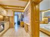 ca. 40m2 groß, Fußboden in Holzoptik, Vorraum mit Garderobe - Spiegel, voll ausgestattete Küchenzeile mit Ceranfeld, Badezimmer Walk in Dusche – Föhn – Seife usw., WC, Schlafzimmer Doppelbett 180x200cm – Nachtkästchen – großer Kleiderkasten - Safe, Wohnzimmer – Kabel TV mit TV Schrank - Eckbank – 2 Schlafcouchen 90x200cm – Balkon mit Bestuhlung Richtung Süden