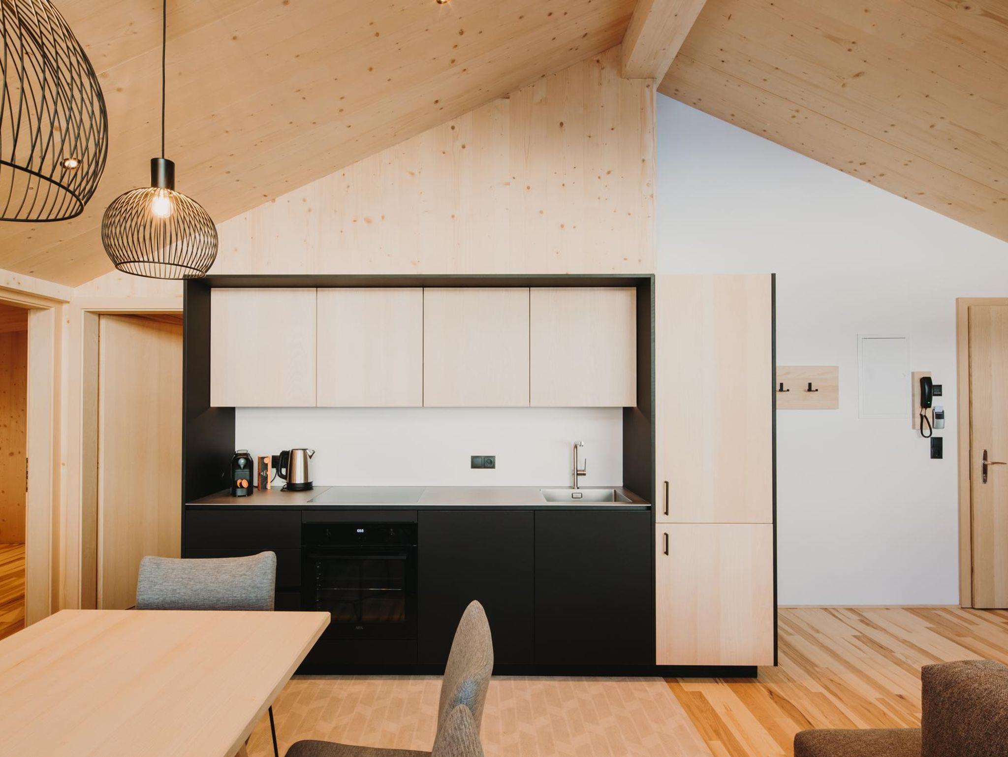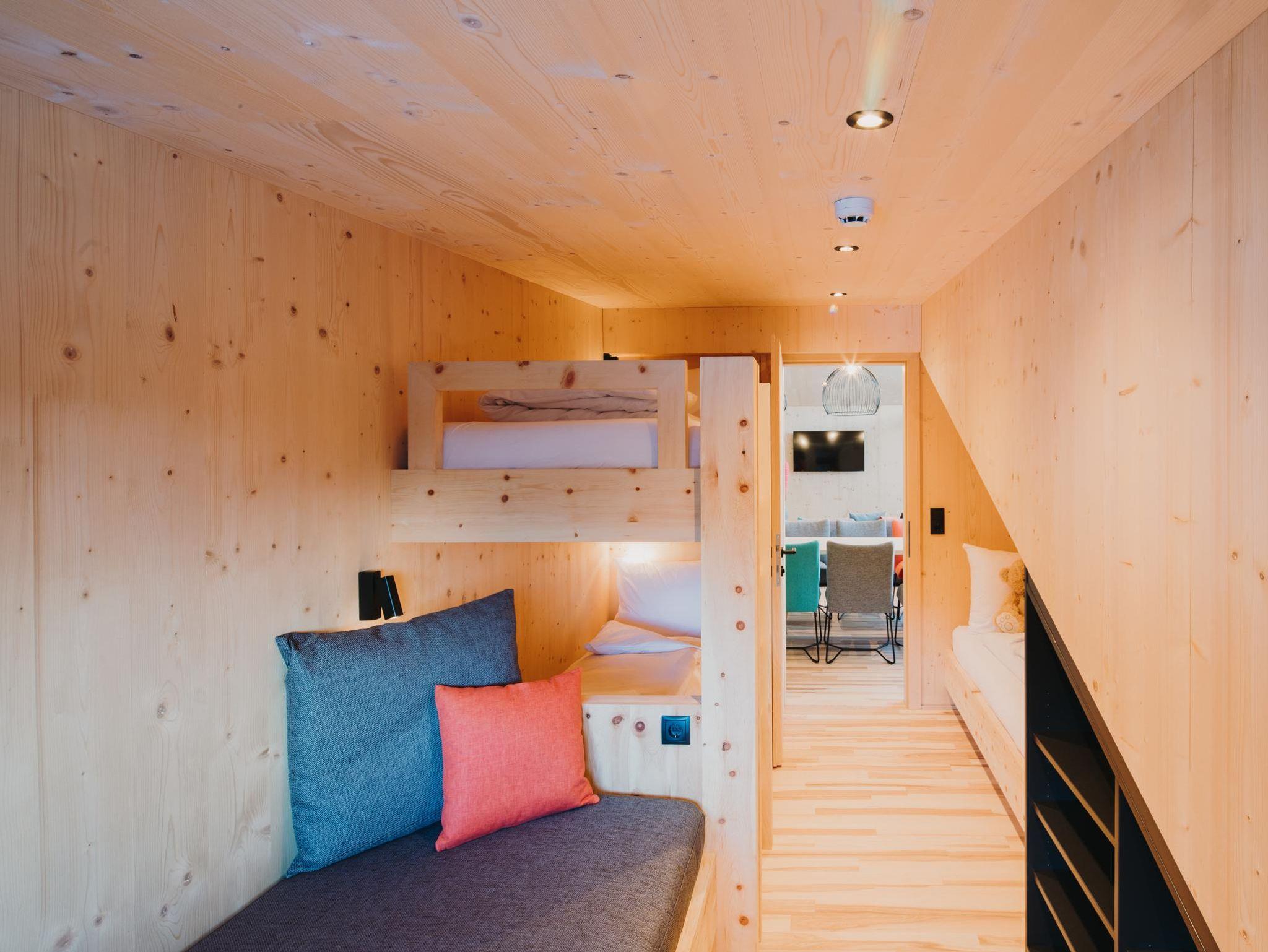 Eines unserer zwei Herzstücke, die Panoramasuite Mountain Alpin im Dachgeschoss, lässt Euer Herz höherschlagen und raubt Euch beim Ausblick auf die unverbaute Bergwelt sprichwörtlich den Atem. Großfamilien mit Oma und Opa im Gepäck oder eine Runde mit deinen Herzensmenschen, hier findet ihr Euer perfektes Urlaubsdomizil. Umgeben von Fichtenvollholz, eingerichtet mit natürlichen Materialien in Kombination mit dunklen Akzenten besticht diese Suite mit einer exklusiven Ausstattung. Drei separate Schlafzimmer, davon zweimal mit Doppelbetten und Glasfaser-TV eingerichtet, das dritte Zimmer bietet ein Stockbett und zwei Einzelbetten. Großzügiger und offen gestalteter Wohn-Essbereich mit vollausgestatteter Küche (ohne Mikrowelle), Glasfaser-TV und raumhohe Glasfronten. Zwei Badezimmer mit Walk-In Regendusche und WC’s. Telefon, Safe und kostenloses WLAN.