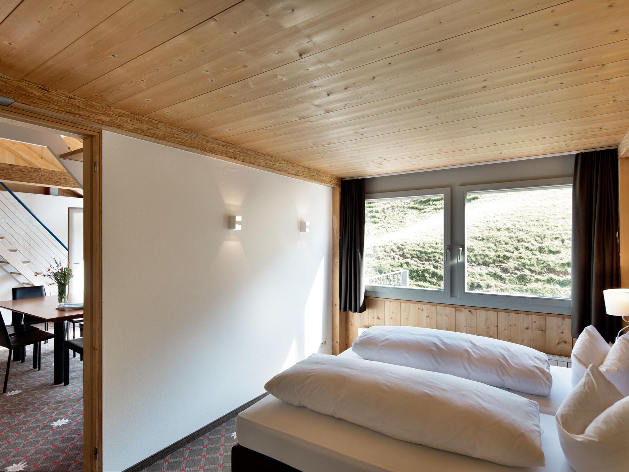 Dazu eine komplette Küche und Essbereich. SAT-TV mit Radio, Telefon, Safe, Haarfön, WLan. Alle Zimmer nach Süden mit Blick ins Skigebiet ausgerichtet. Somit sehr sonnig und hell. In den oberen Etagen alle mit großem Balkon, die unteren ebenerdig. Modernes Heizsystem mit kontrollierter Be- und Entlüftung, mit fassadenintegrierter Solaranlage.