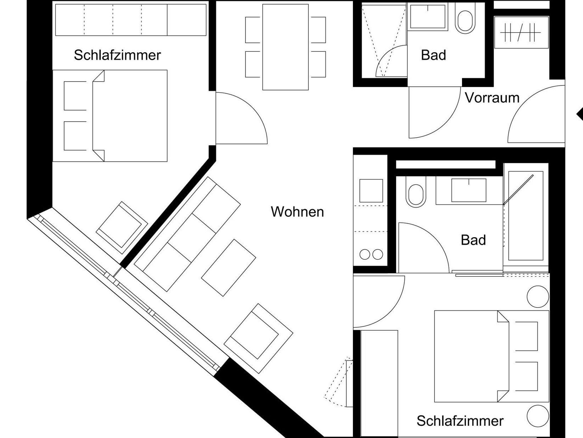 • 1 Schlafzimmer mit Bad, Badewanne, Dusche und WC
