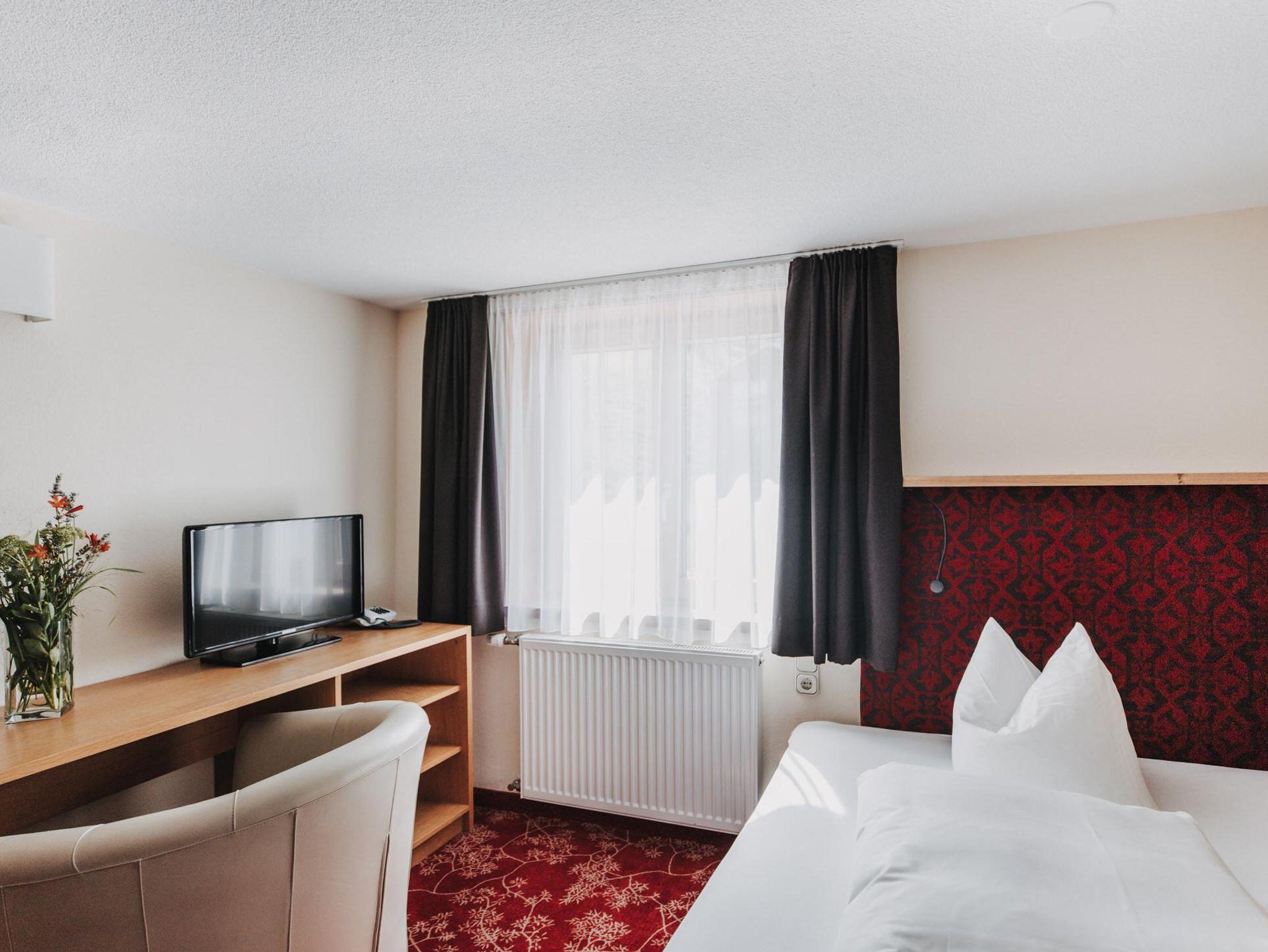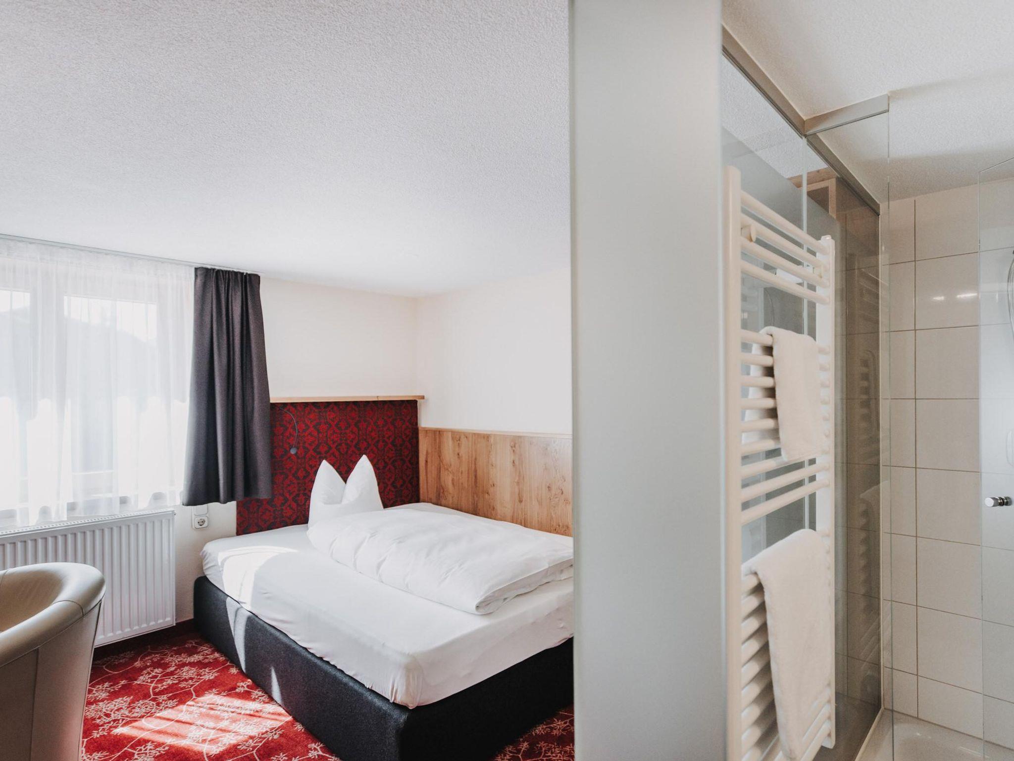 Ausgestattet mit einem Queensize Bett (140x200cm), Dusche/WC, TV/Radio, Hotelsafe, Wifi und Telefon. Alle Einzelzimmer befinden sich ruhig gelegen im 1. und 2. Obergeschoss vom Haupthaus mit Blick nach Westen, Norden und Süden