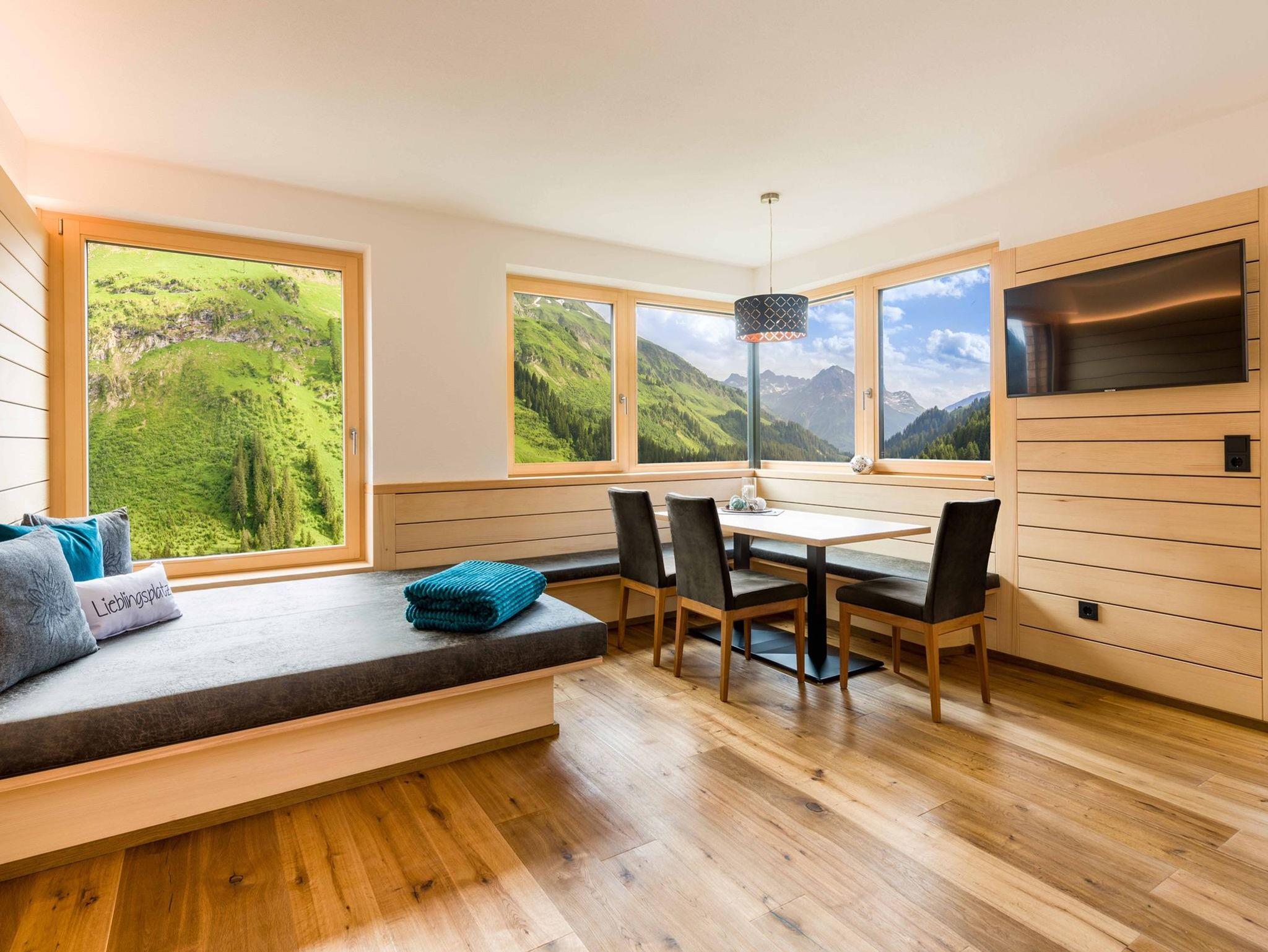 Unser modern eingerichtetes, neu eröffnetes Haus liegt mitten im Skigebiet Warth-Schröcken. Zentral aber in ruhiger Lage können Sie hier ausgiebig die Seele baumeln lassen und sind gleichzeitig nah dran an Natur, Action und Tradition. Jedes der drei Appartements hat zwei Schlafzimmer mit jeweils separatem Badezimmer. Sie eignen sich daher perfekt sowohl für junge Familien als auch für befreundete Paare, die zusammen reisen. Die großzügig geschnittenen Wohnungen verfügen außerdem über eine moderne, komplett ausgestattete Küche, eine große Terrasse mit Traumblick-Garantie und einen eigenen Wellnessbereich mit privater Sauna und Liegewiese mit Panoramafenster.