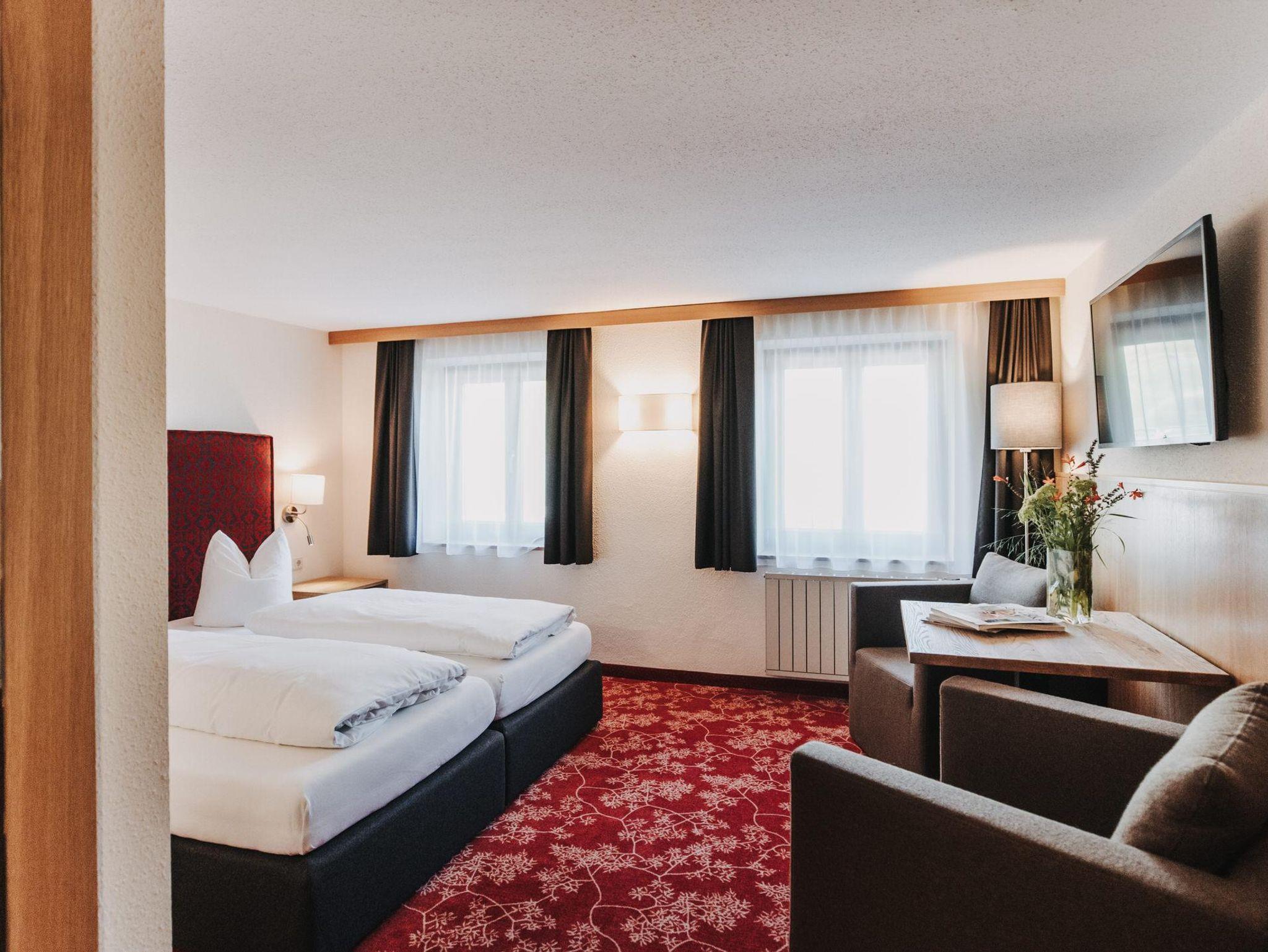 Ausgestattet mit einem Kingsize Bett (180x200cm), mit Dusche oder Badewanne und WC, TV/Radio, Hotelsafe, Wifi und Telefon. Alle Doppelzimmer befinden sich im Haupthaus in ruhiger Lage mit Blick auf die umliegenden Berge, aufgeteilt auf 3 Stockwerke