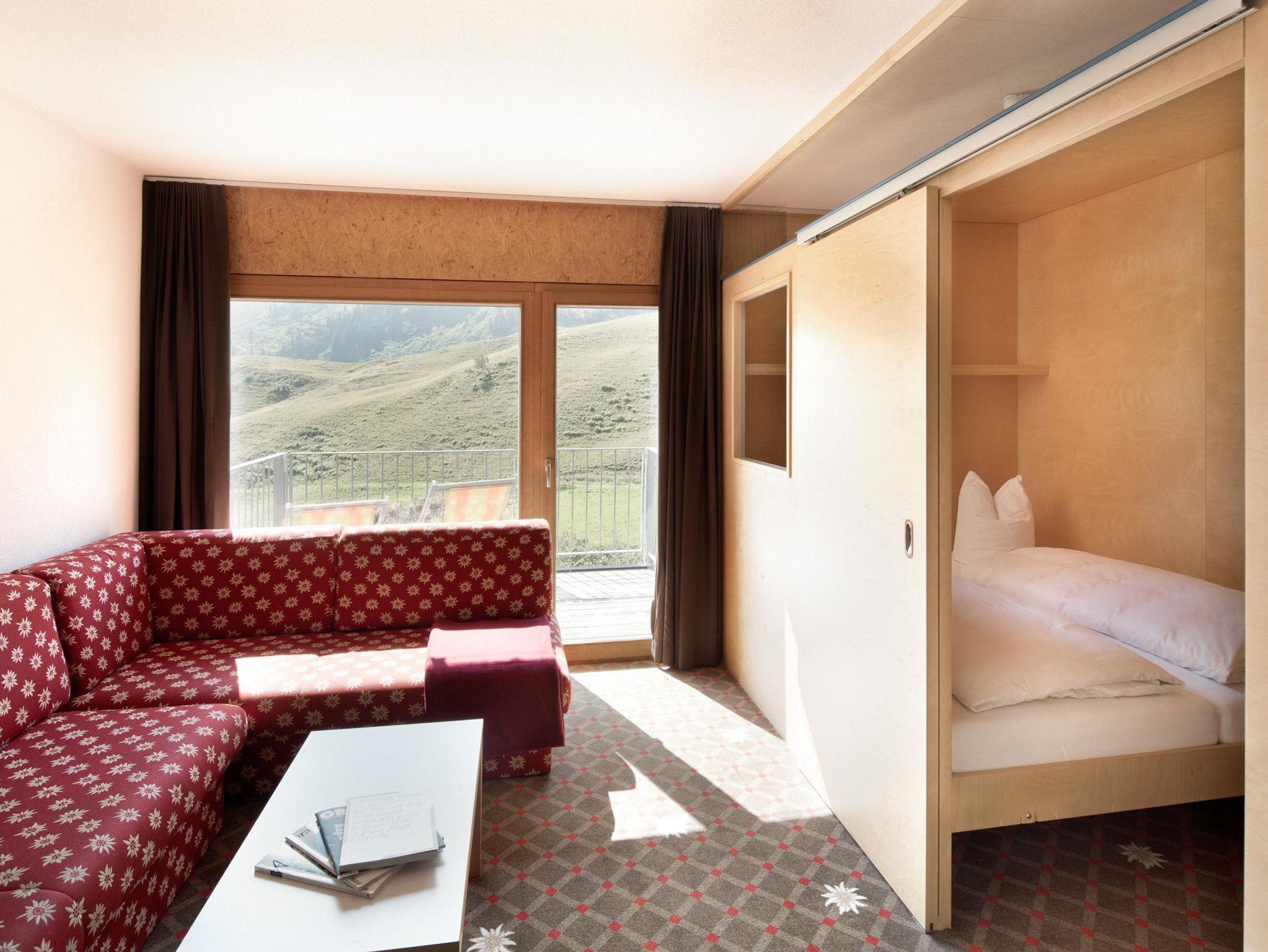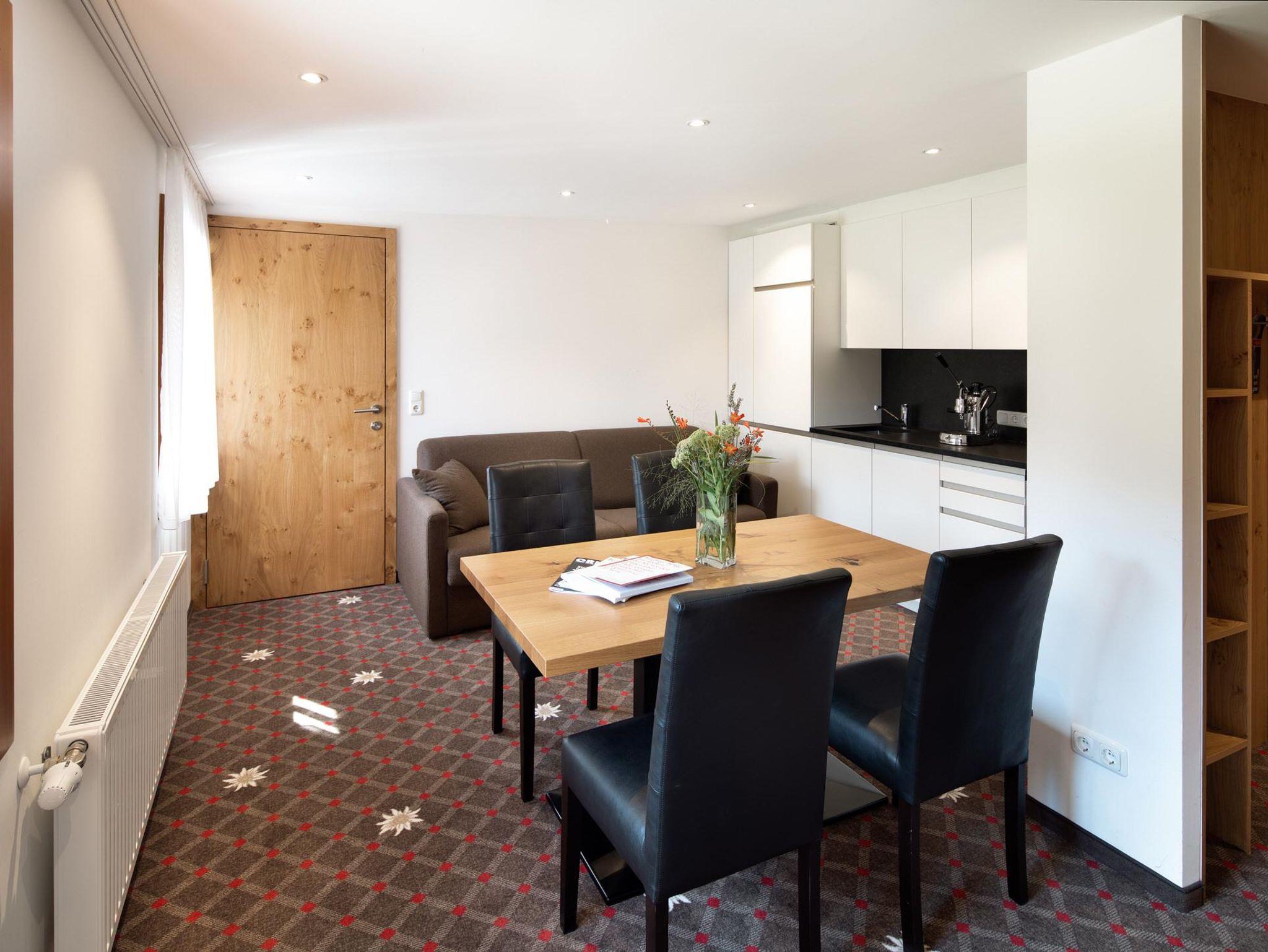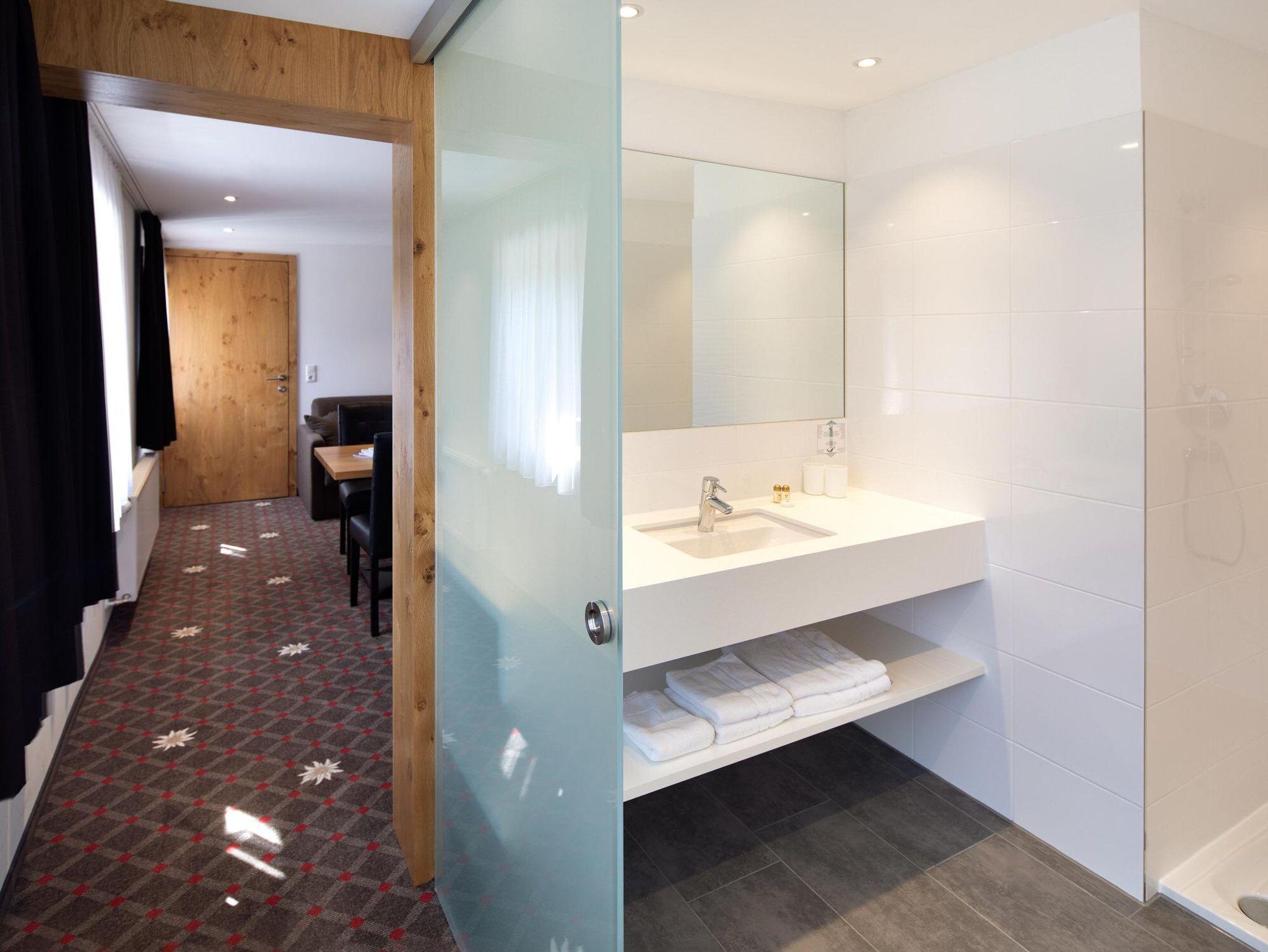 Ausgestattet mit einem Kingsize Bett (180x200cm) im Schlafzimmer, mit Doppelschlafcouch im Wohnbereich, Essbereich mit kompletter Küche, Badezimmer mit Dusche oder Badewanne und WC, 2x TV/Radio, Hotelsafe, Wifi und Telefon. Die Hotelsuiten befinden sich in ruhiger Lage im 1. und 2. Obergeschoss vom Haupthaus, mit Blick auf die Berge