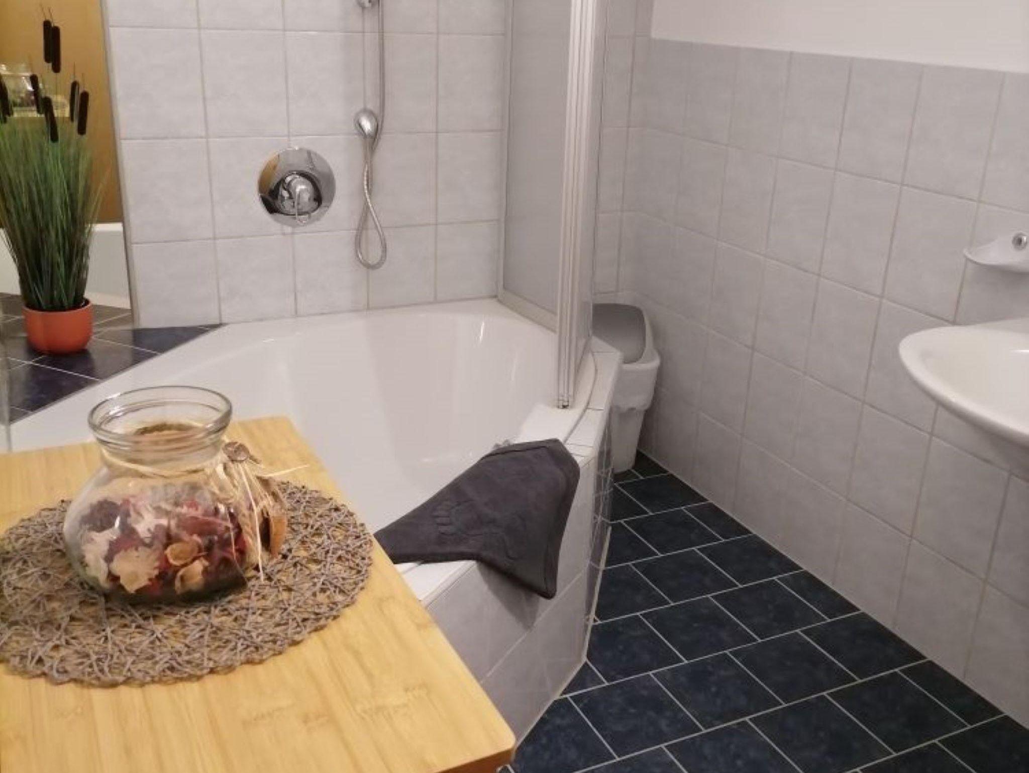 Das Appartment verfügt über eine kleine Wohnküche ( Kaffeemaschine, Wasserkocher,Mikrowelle), einem Schlafzimmer mit TV und einem großen Badezimmer mit Eckwanne und WC (inkl. Hand-Badetücher).