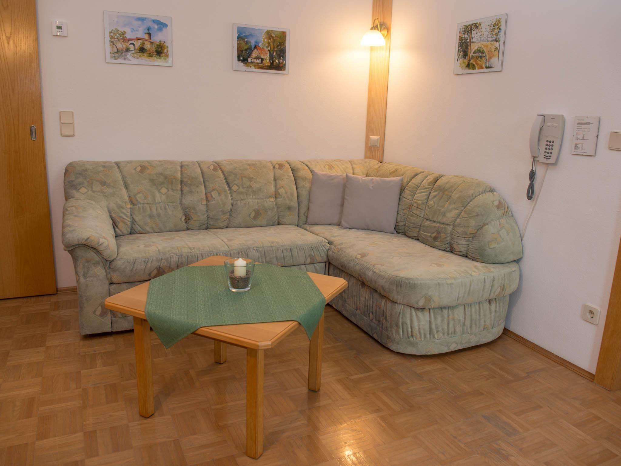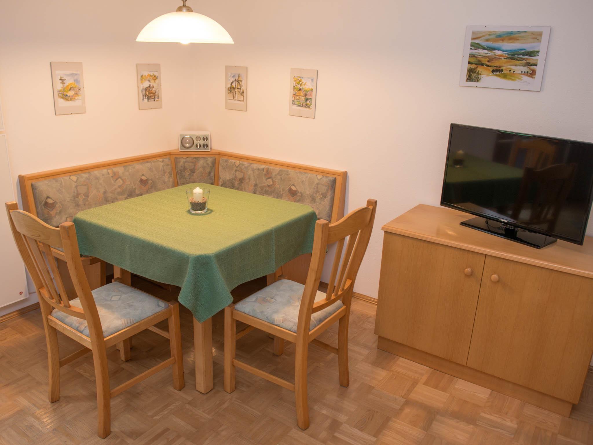 Ferienwohnung mit 55 m² für 2-4 Personen Lage: 2. Stock, Südseite mit Blick zum Garten Wohnzimmer mit Essecke Schlafzimmer mit Doppelbett Kinderzimmer mit 2 Betten kleine Küche mit Spülmaschine Vorraum Badezimmer mit Dusche WC Balkon