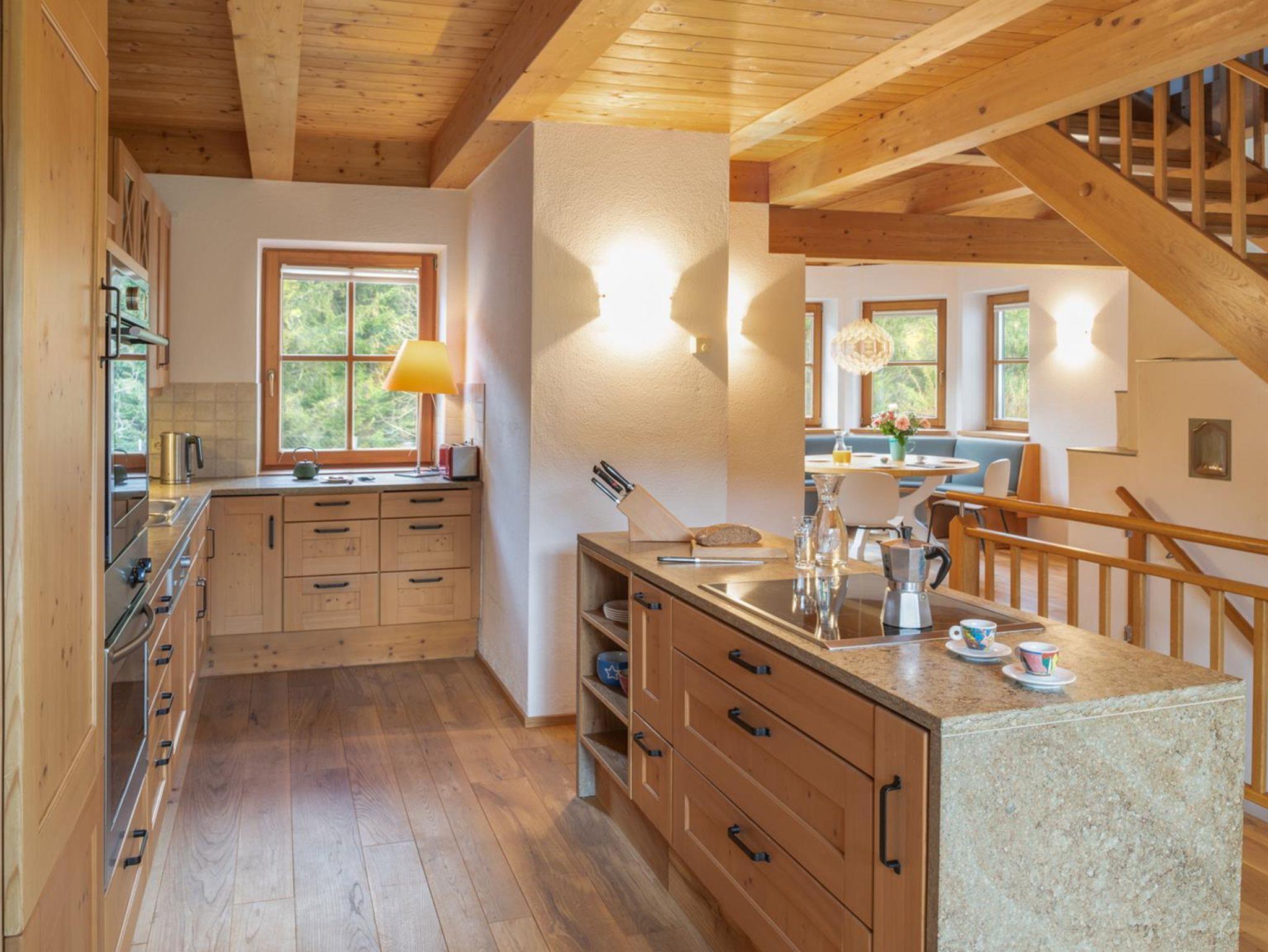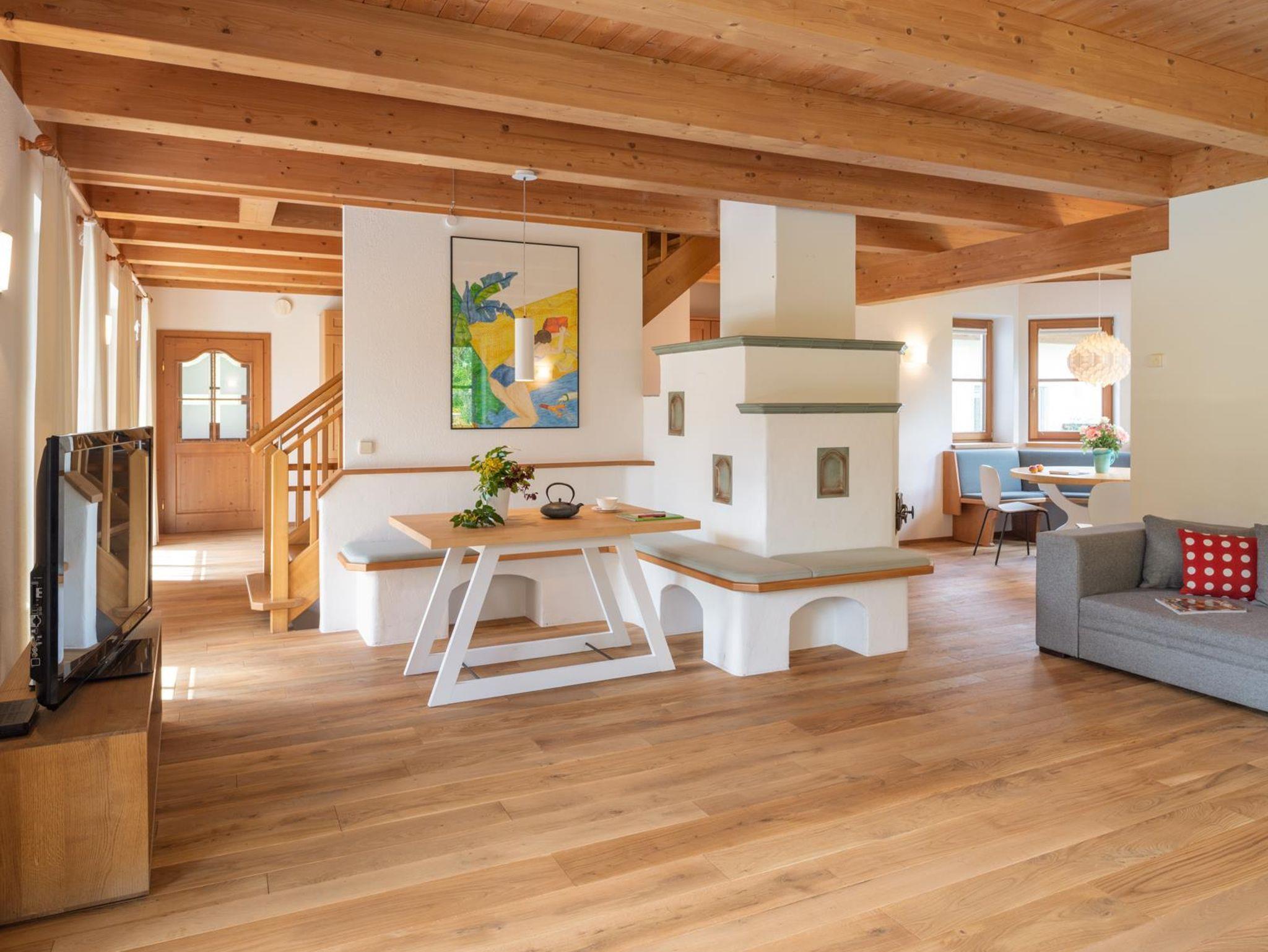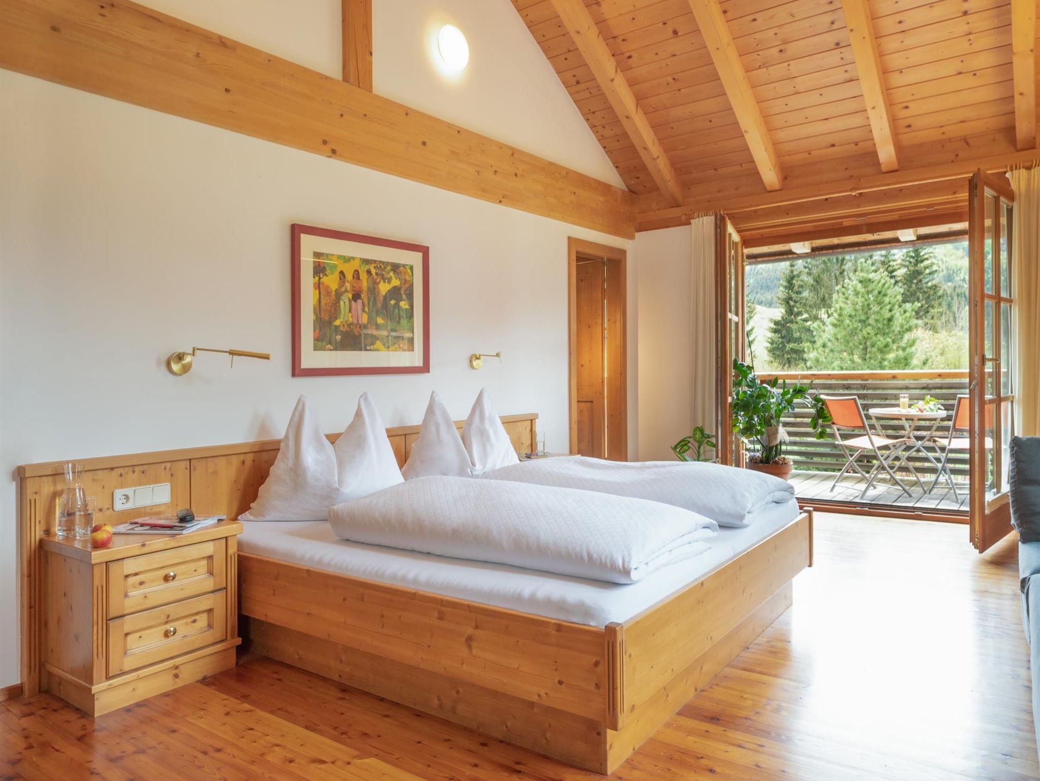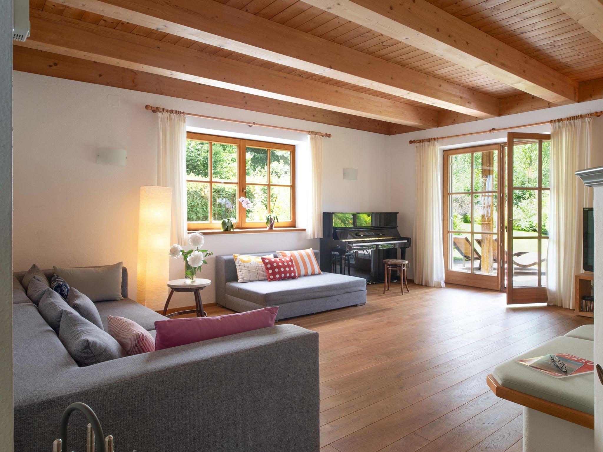 Das große, komplett offen gestaltete Erdgeschoß bietet eine gut ausgestattete Küche mit Küchenblock (G), einen großen Wohnraum mit zentralem Kamin (H), eine Panorama-Sitzecke (I) und einen weiteren Esstisch am Kamin. Eine gemütliche Sofalandschaft fehlt natürlich auch nicht. Für Seminare steht der 45?m2 große Gruppenraum mit wunderbarem Blick auf die umliegenden Wiesen und Wälder und getrenntem Eingang zur Verfügung (J).Es besteht aus einem großen Schlafzimmer mit Doppelbett, eigenem geräumigen Bad mit Wanne und Duschkabine (A & B), einem Schlafzimmer mit zwei Einzelbetten (C), einem Schlafzimmer mit Doppelbett (D) und einem gemeinsamen Bad (E). Alle Schlafzimmer haben direkten Zugang zum großen Balkon. Zweifellos das Highlight für Kids ist die „Zwergenstube“ - ein kleines Zimmer mit Dachschräge und zwei Kinderbetten (F).