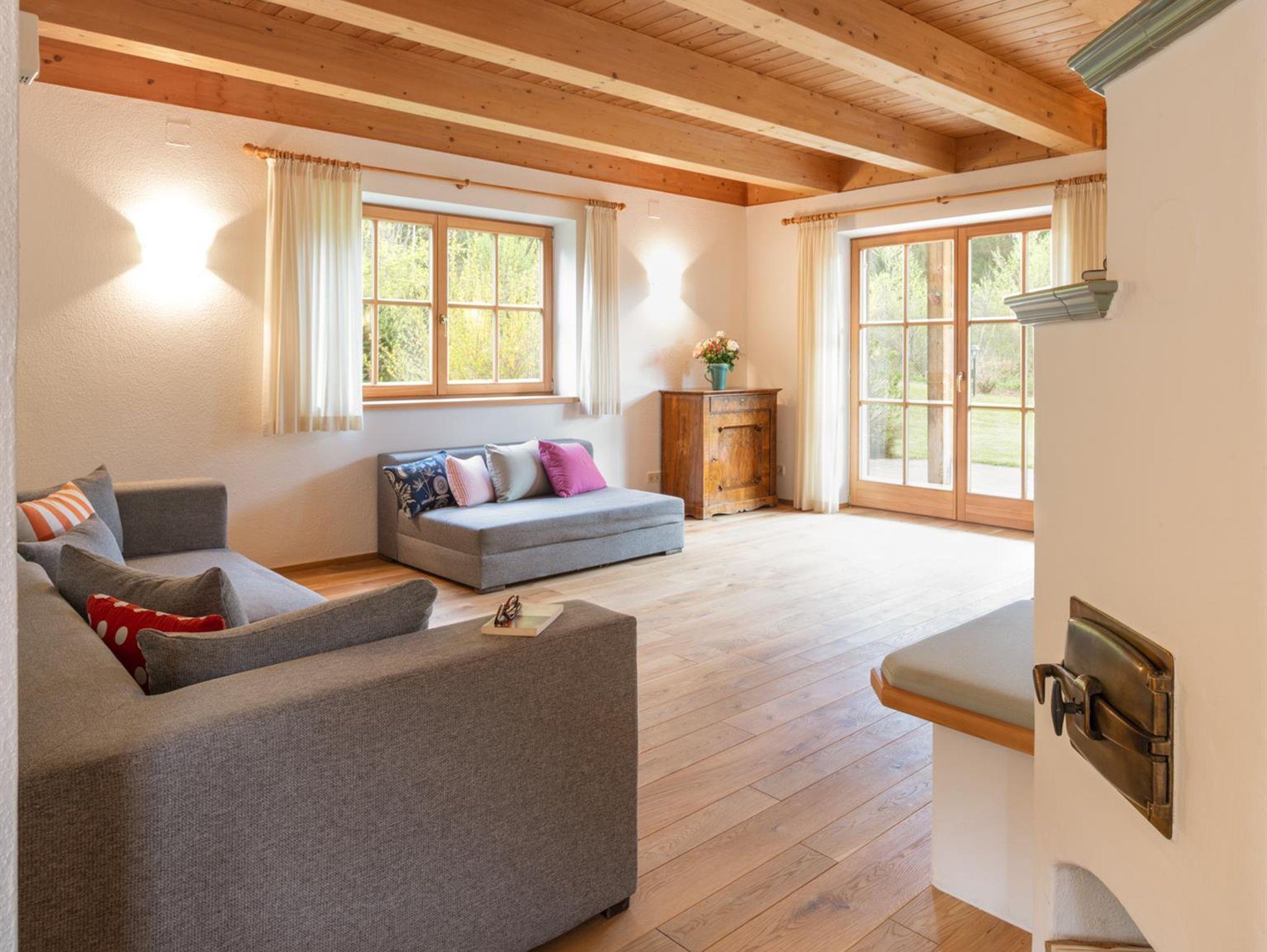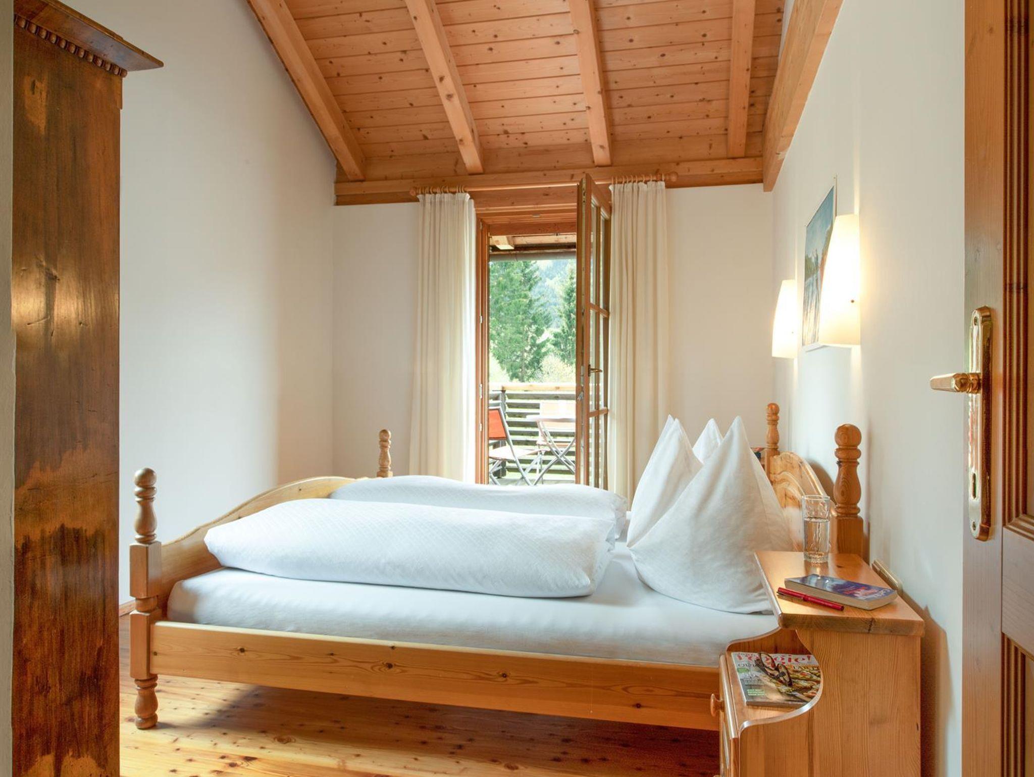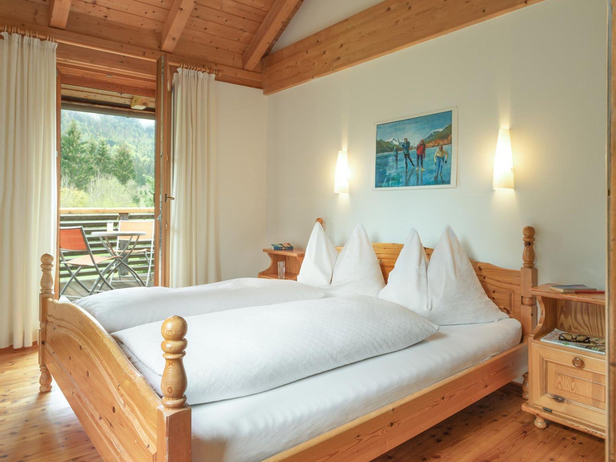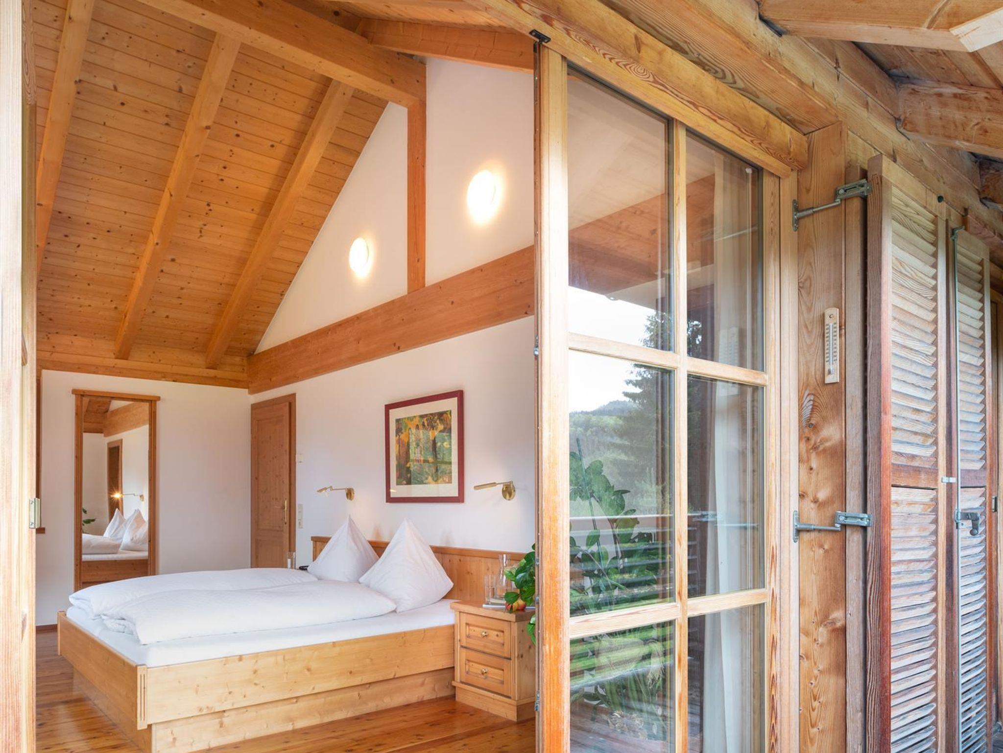 Das große, komplett offen gestaltete Erdgeschoß bietet eine gut ausgestattete Küche mit Küchenblock (G), einen großen Wohnraum mit zentralem Kamin (H), eine Panorama-Sitzecke (I) und einen weiteren Esstisch am Kamin. Eine gemütliche Sofalandschaft fehlt natürlich auch nicht. Für Seminare steht der 45?m2 große Gruppenraum mit wunderbarem Blick auf die umliegenden Wiesen und Wälder und getrenntem Eingang zur Verfügung (J).Es besteht aus einem großen Schlafzimmer mit Doppelbett, eigenem geräumigen Bad mit Wanne und Duschkabine (A & B), einem Schlafzimmer mit zwei Einzelbetten (C), einem Schlafzimmer mit Doppelbett (D) und einem gemeinsamen Bad (E). Alle Schlafzimmer haben direkten Zugang zum großen Balkon. Zweifellos das Highlight für Kids ist die „Zwergenstube“ - ein kleines Zimmer mit Dachschräge und zwei Kinderbetten (F).