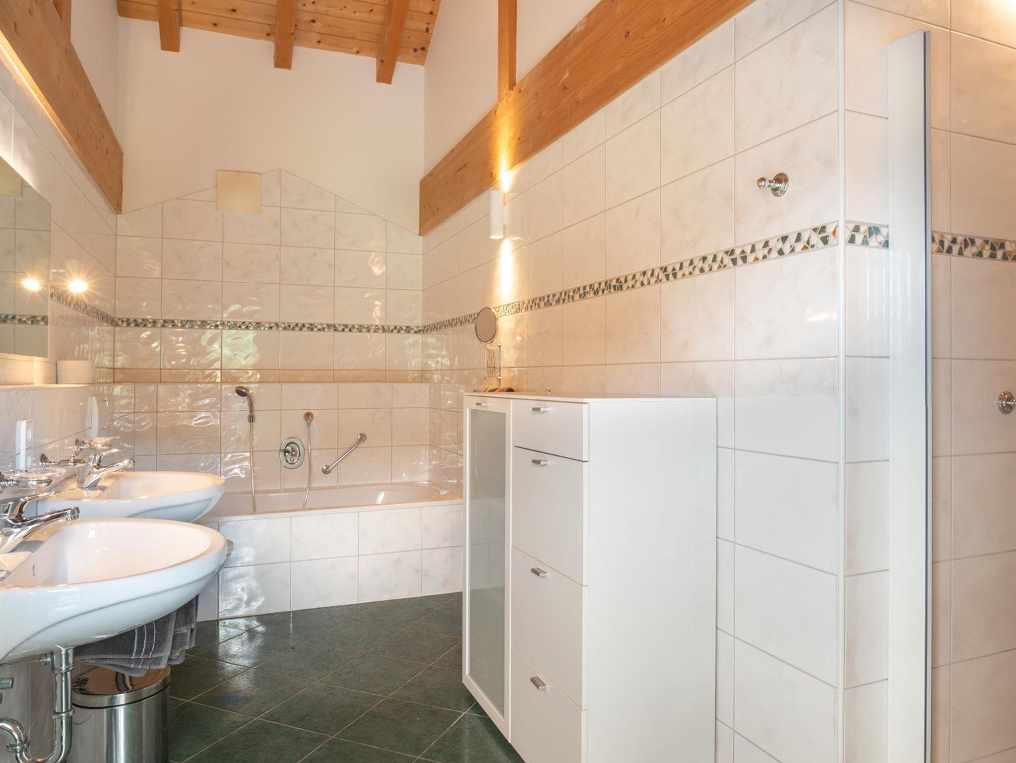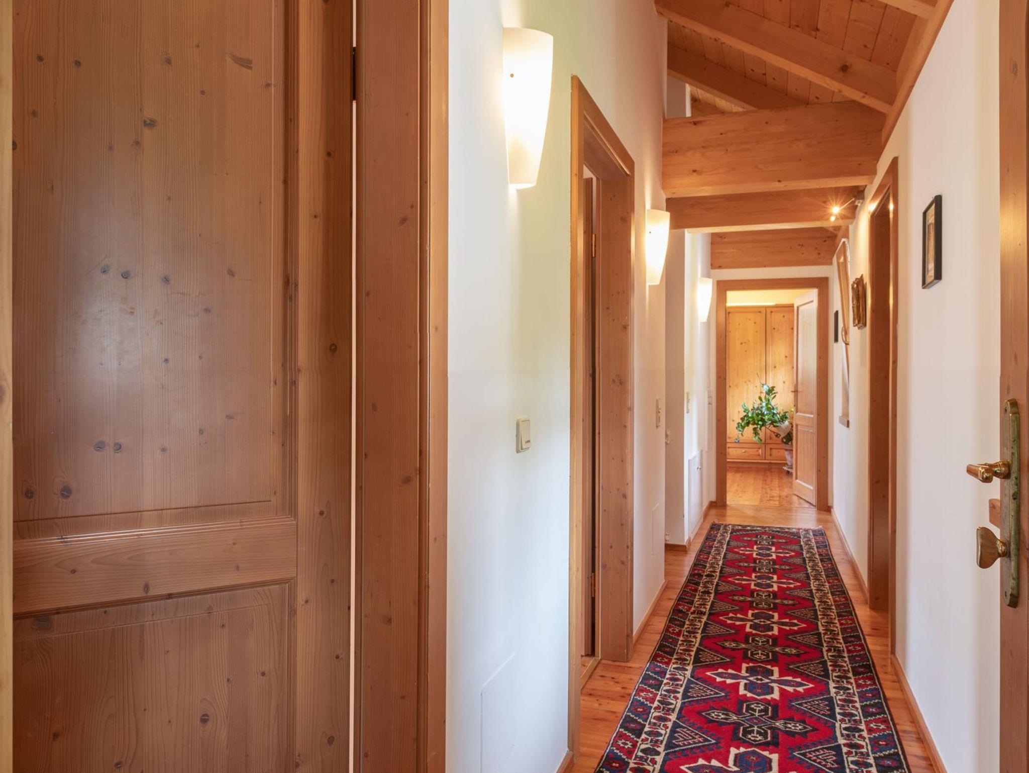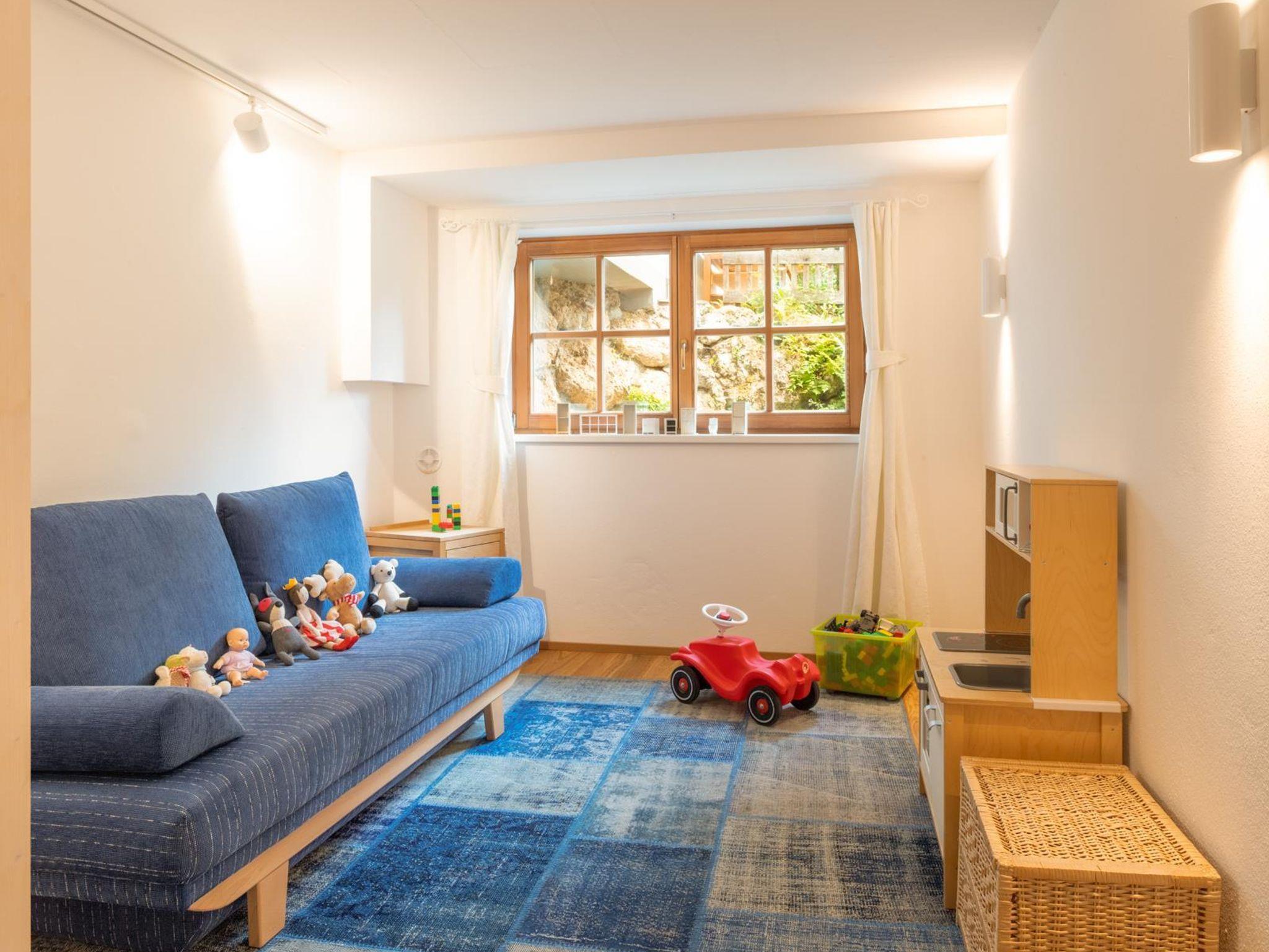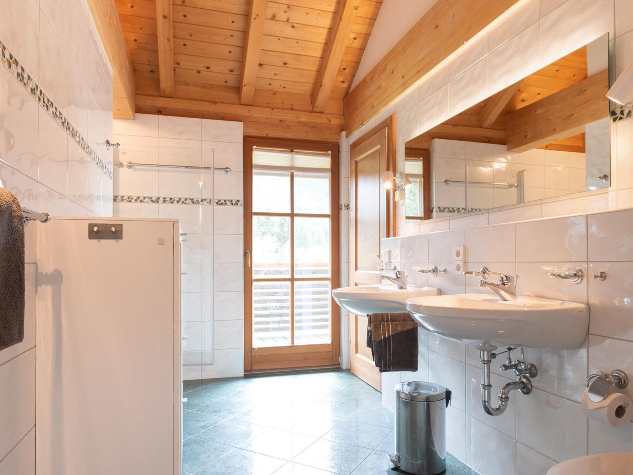 Das große, komplett offen gestaltete Erdgeschoß bietet eine gut ausgestattete Küche mit Küchenblock (G), einen großen Wohnraum mit zentralem Kamin (H), eine Panorama-Sitzecke (I) und einen weiteren Esstisch am Kamin. Eine gemütliche Sofalandschaft fehlt natürlich auch nicht. Für Seminare steht der 45?m2 große Gruppenraum mit wunderbarem Blick auf die umliegenden Wiesen und Wälder und getrenntem Eingang zur Verfügung (J).Es besteht aus einem großen Schlafzimmer mit Doppelbett, eigenem geräumigen Bad mit Wanne und Duschkabine (A & B), einem Schlafzimmer mit zwei Einzelbetten (C), einem Schlafzimmer mit Doppelbett (D) und einem gemeinsamen Bad (E). Alle Schlafzimmer haben direkten Zugang zum großen Balkon. Zweifellos das Highlight für Kids ist die „Zwergenstube“ - ein kleines Zimmer mit Dachschräge und zwei Kinderbetten (F).