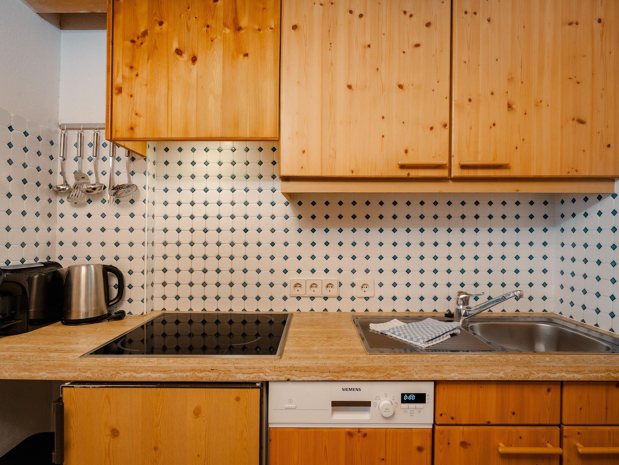 Eine gemütliche Ferienwohnung (55 m²) für 2-4 Personen, Wohnzimmer mit Ausziehcouch, Tel, Flat-TV, Safe, gratis Internet, abgeschlossene Schlafgalerie mit Doppelbett (und Schlafsessel, Vorraum mit Kochnische, Dusche mit Doppelwaschbecken, WC, großer Balkon zum See.