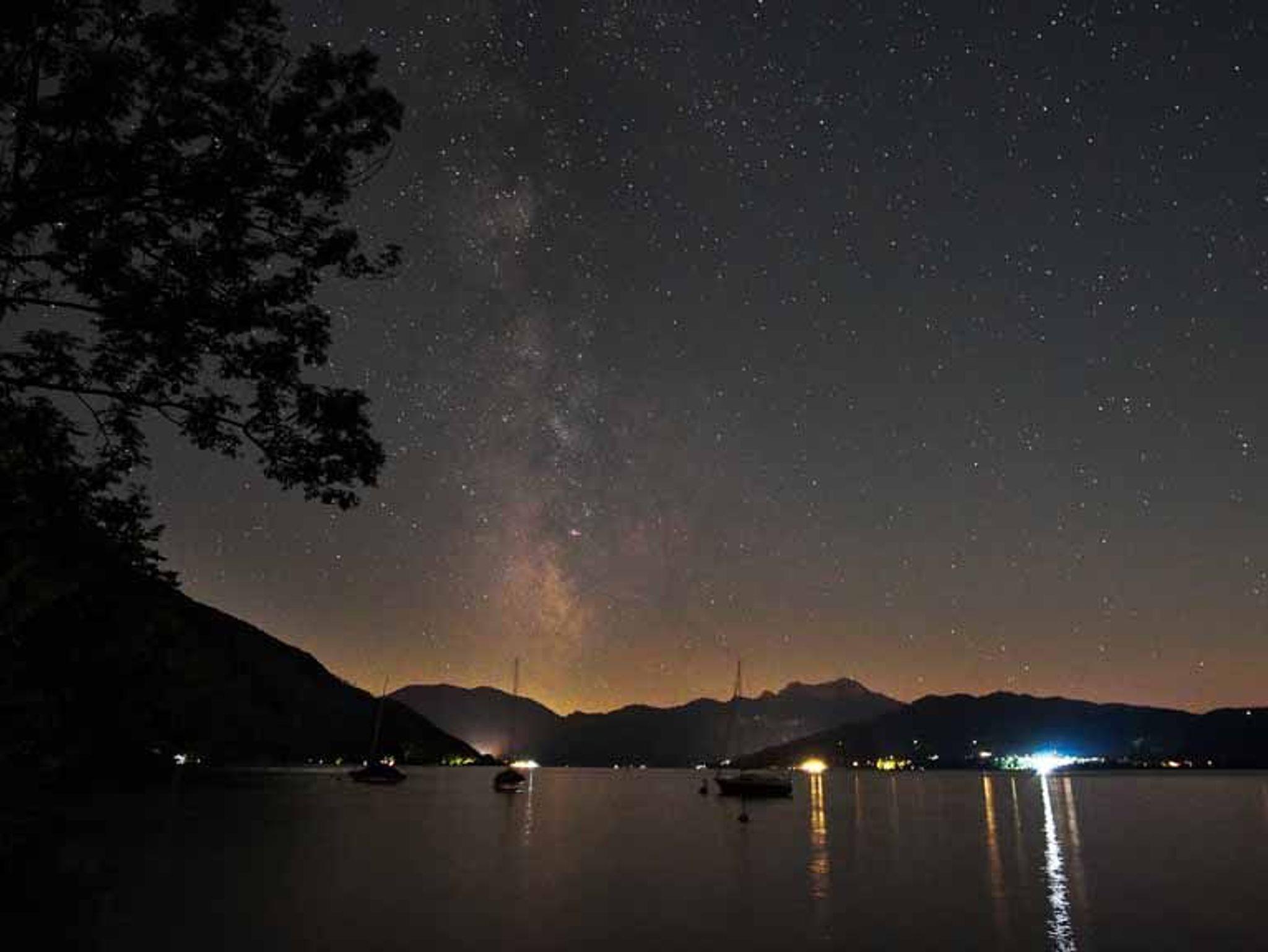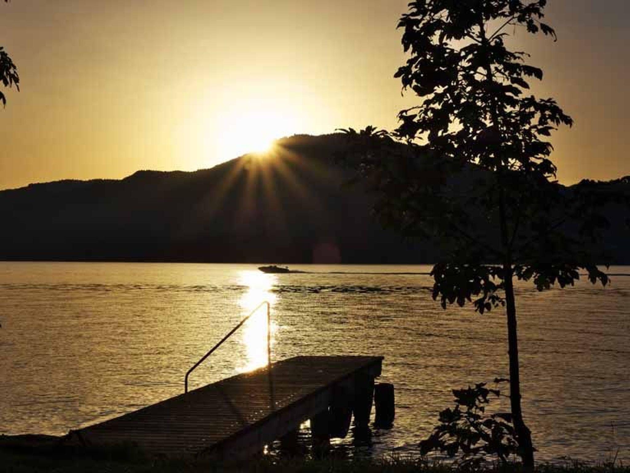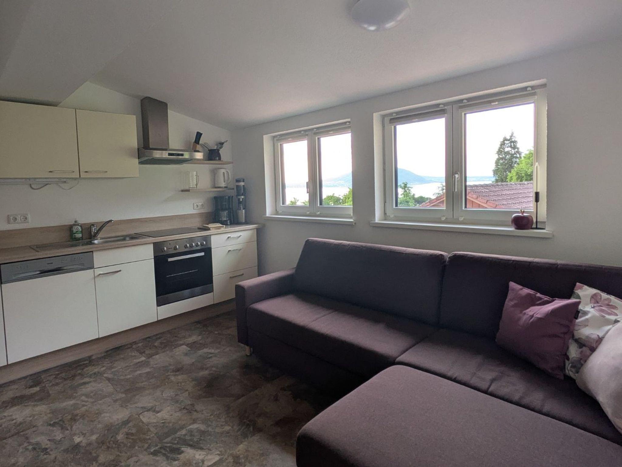 Entdecken Sie unsere gemütliche Ferienwohnung im 2 Stock, die Ihnen eine unvergleichliche Aussicht auf den schimmernden See und den dahintergelegenen Buchberg bietet.