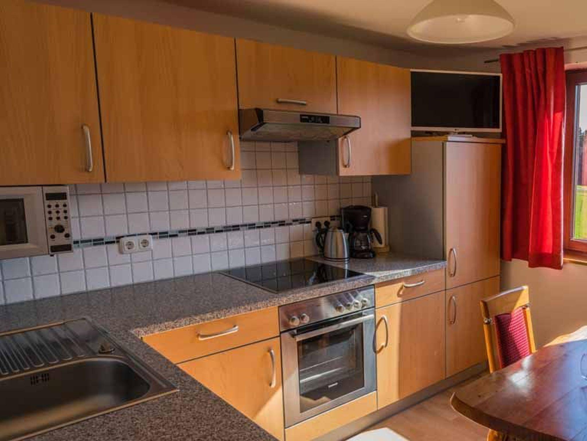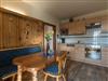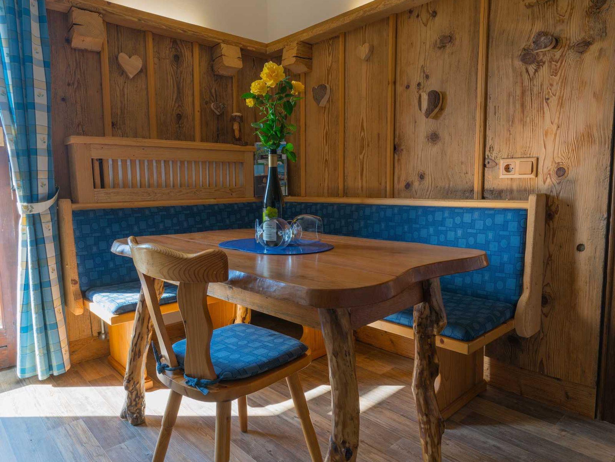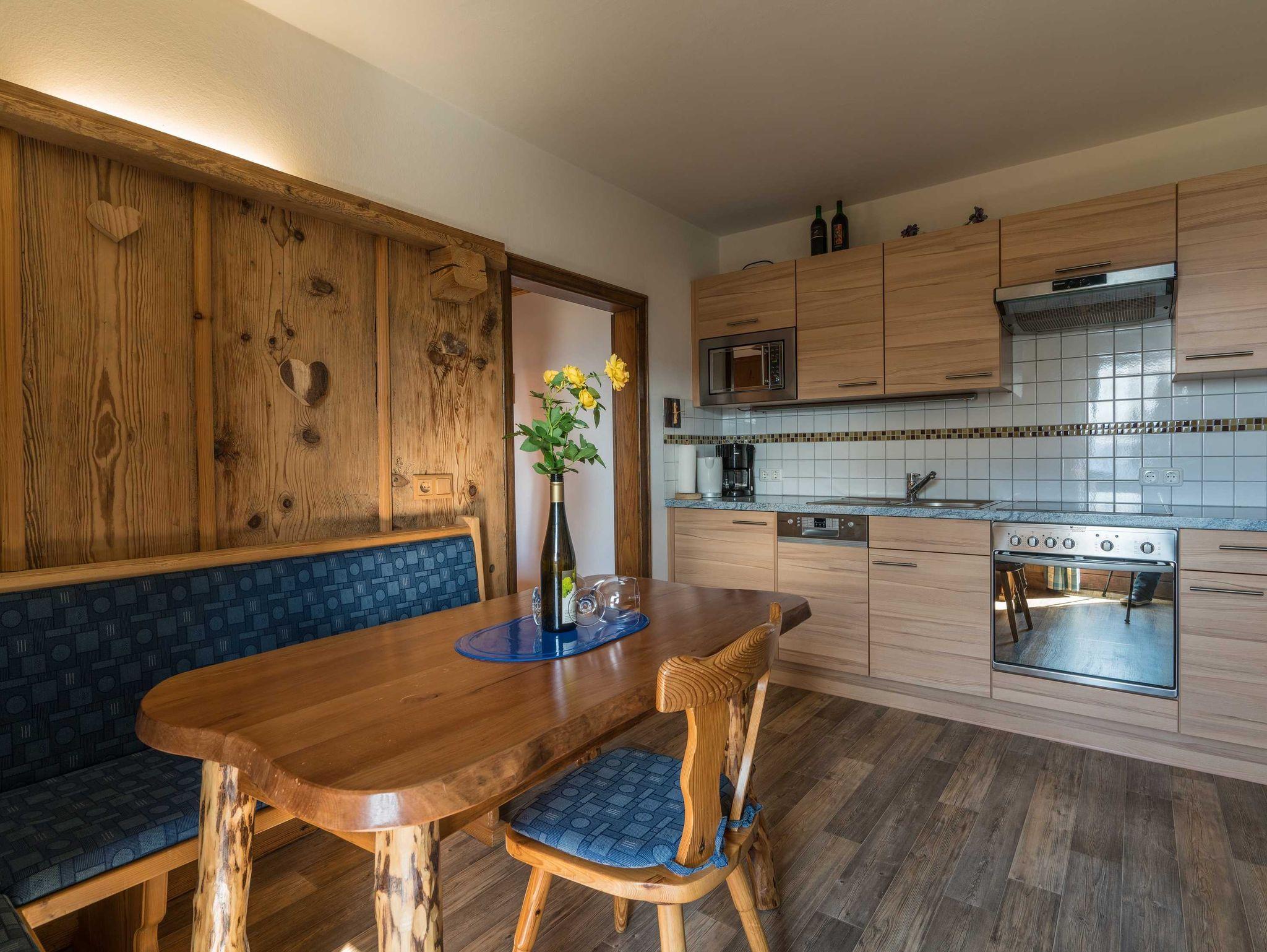 Die Wohnküche bietet einen Essbereich mit uriger Eckbank zum gemütlichen Zusammensitzen. Außerdem findet sich dort ein Fernseher, eine bequeme Couch mit Topper und der Zugang zum Balkon.