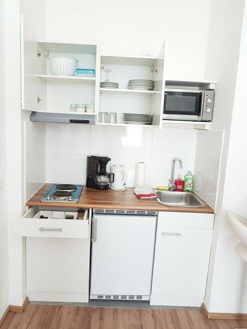 Die kleine Küche ist für einen Urlaub mit allem Notwendigen ausgestattet. Überdies gibt es in der Wohnung auch eine Waschmaschine.