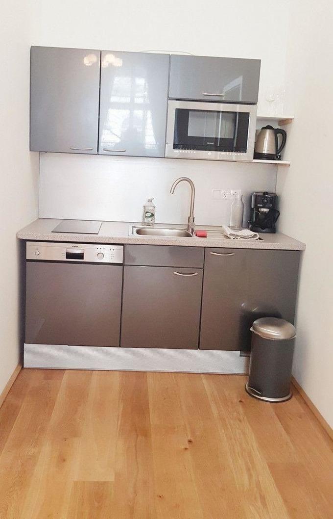 Weiters bietet das Apartment neben dem Badezimmer mit bodentiefer Dusche eine vollausgestattete Küche mit Herd, Mikrowelle, Kaffeemaschine und auch Geschirrspüler.