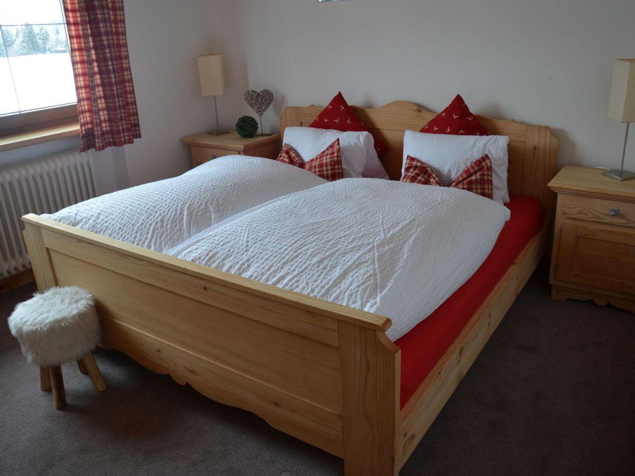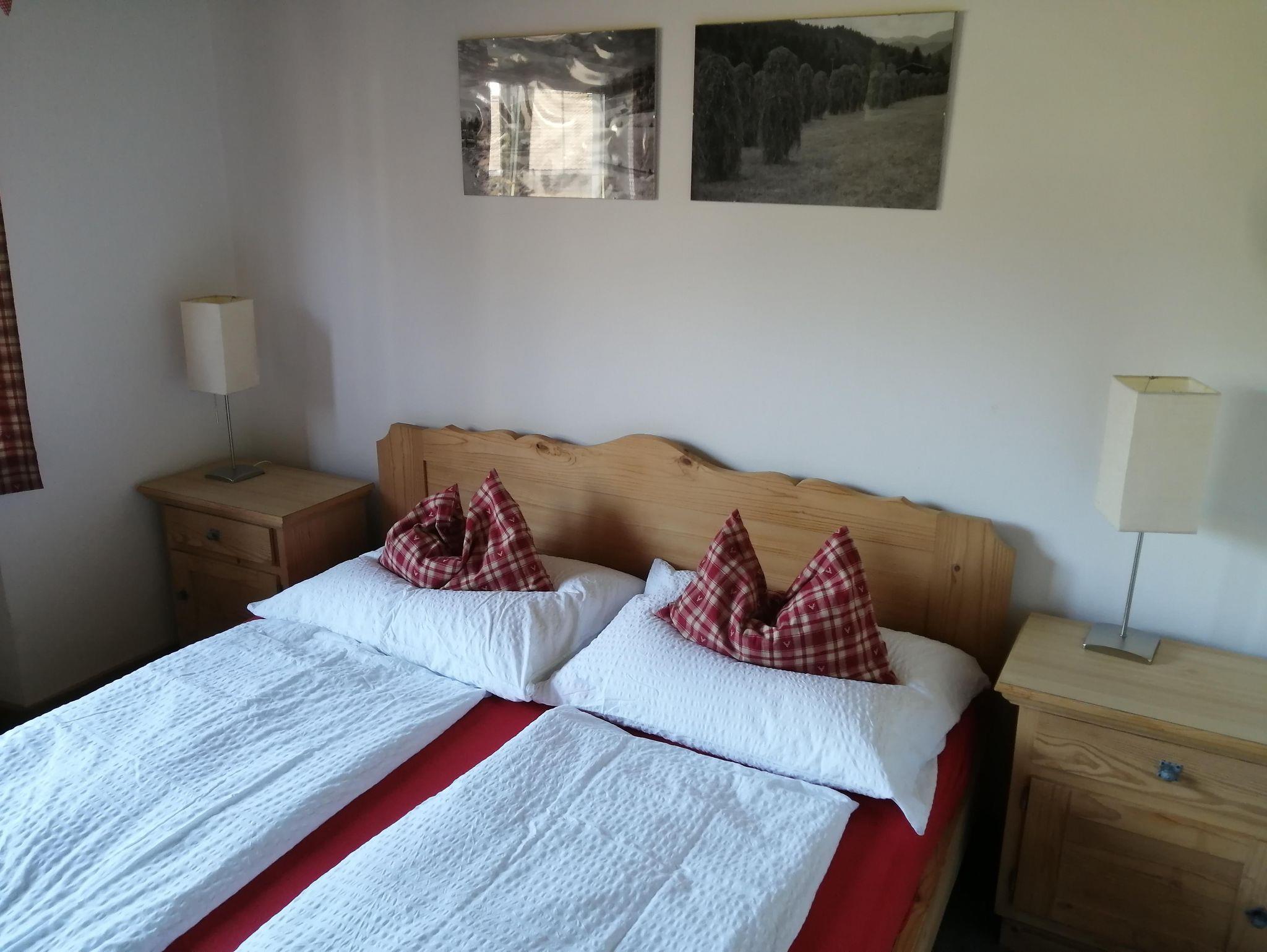 Über einen separaten Aufgang gelangt man in die 80m² Ferienwohnung im 1. Stock. Sie besitzt ein großes Wohnzimmer mit großem Esstisch, stilvoll eingerichtete Küche mit Kühlschrank mit Gefrierfach, Vorraum für Skischuhe und Bekleidung. 2 Schlafzimmer mit insgesamt 4 Betten, Badezimmer mit Dusche und WC. Ein großzügiger Gang verbindet alle Räume miteinander. Süd-West ausgerichteter