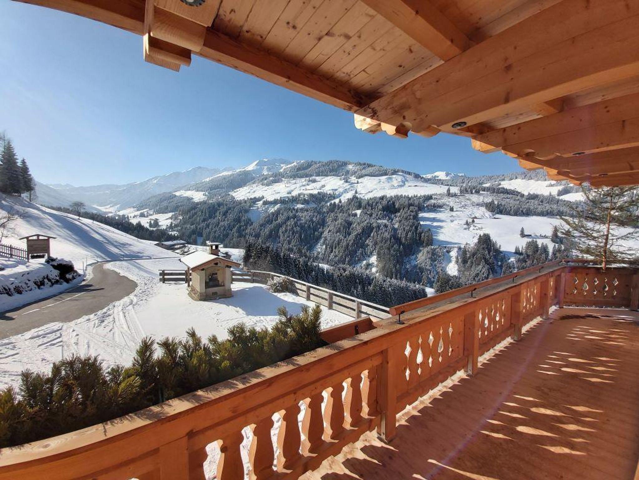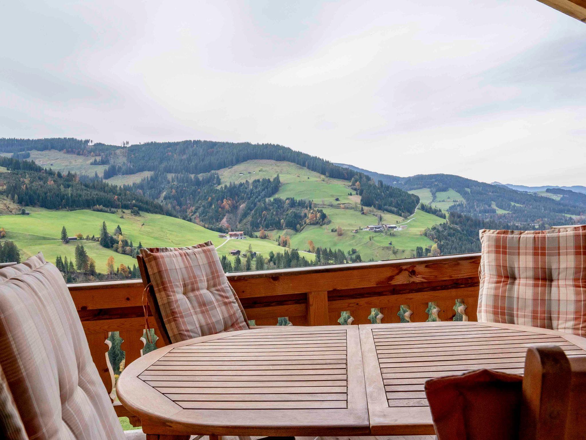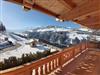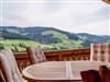 Zum Entspannen, der große Balkon und die Terrasse mit Holzmöbel und Panoramablick.