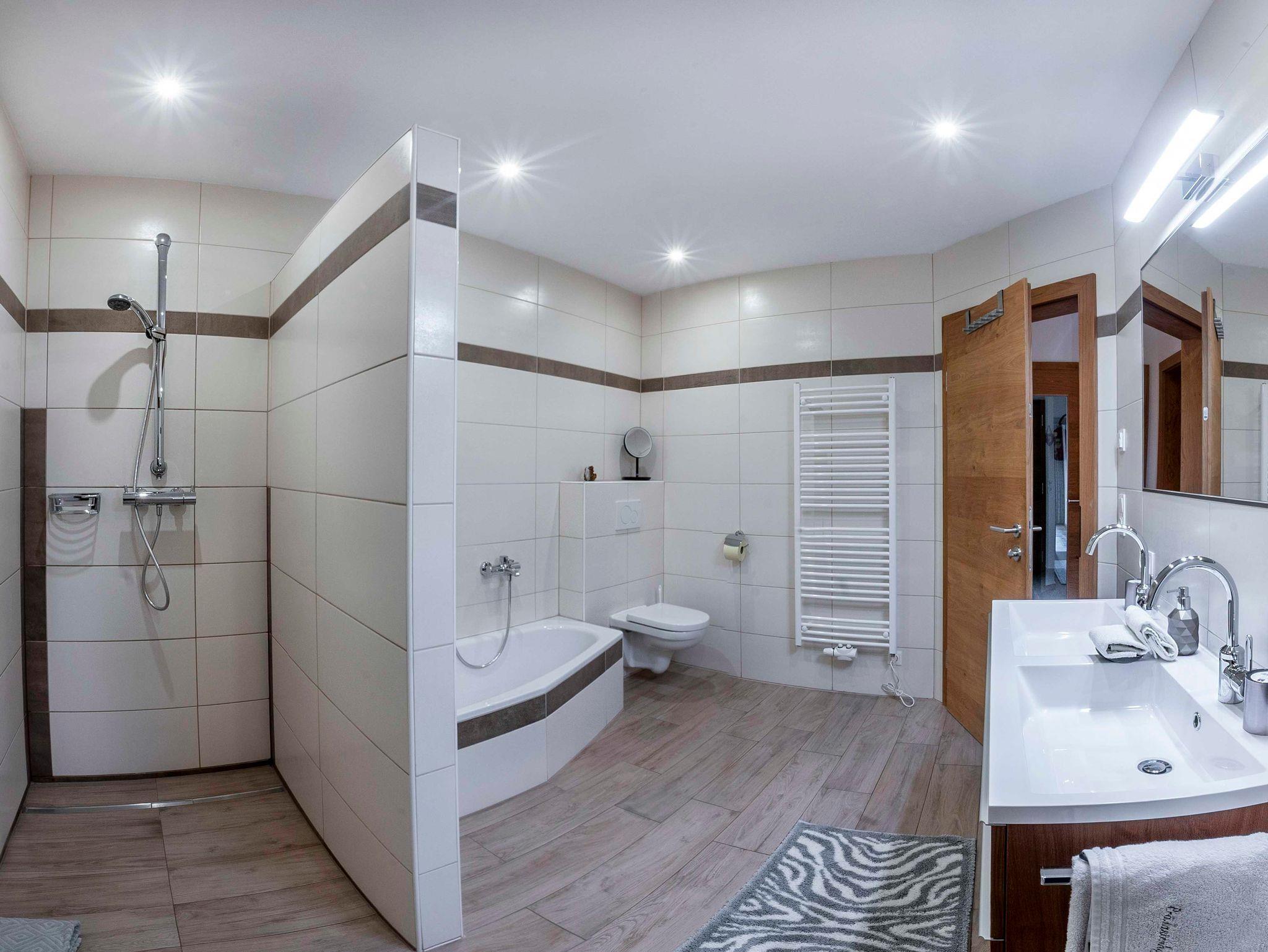 Das Bad ist ausgestattet mit einem Doppelwaschtisch, einer begehbaren Dusche, einer Eckbadewanne und einem WC. Haarföhn und Kosmetikspiegel sind vorhanden.