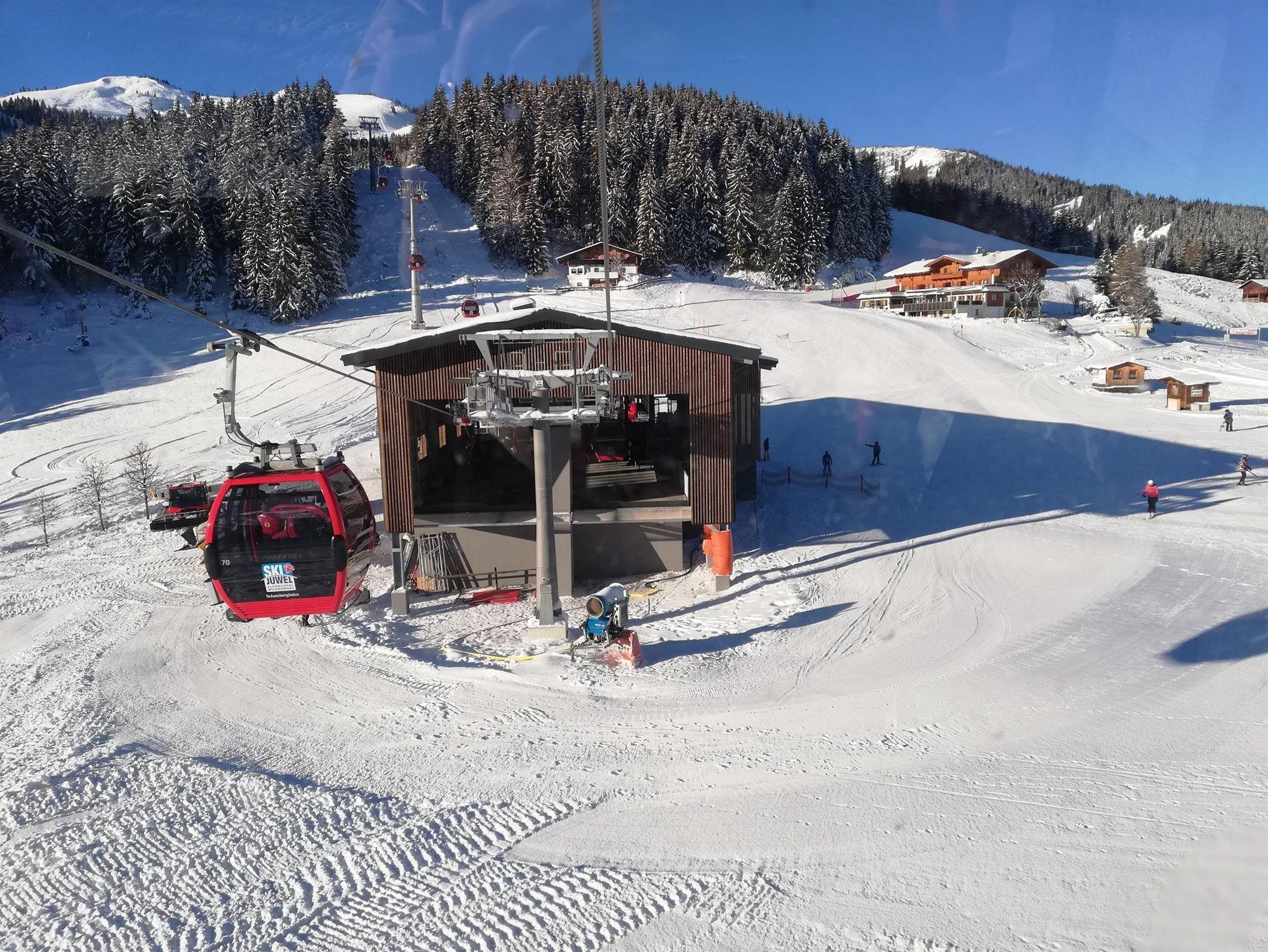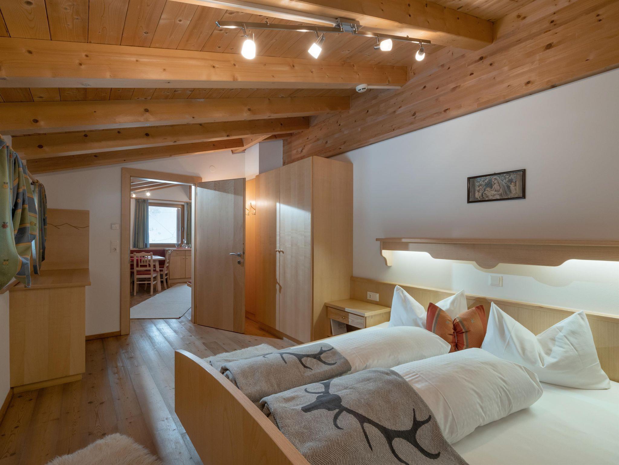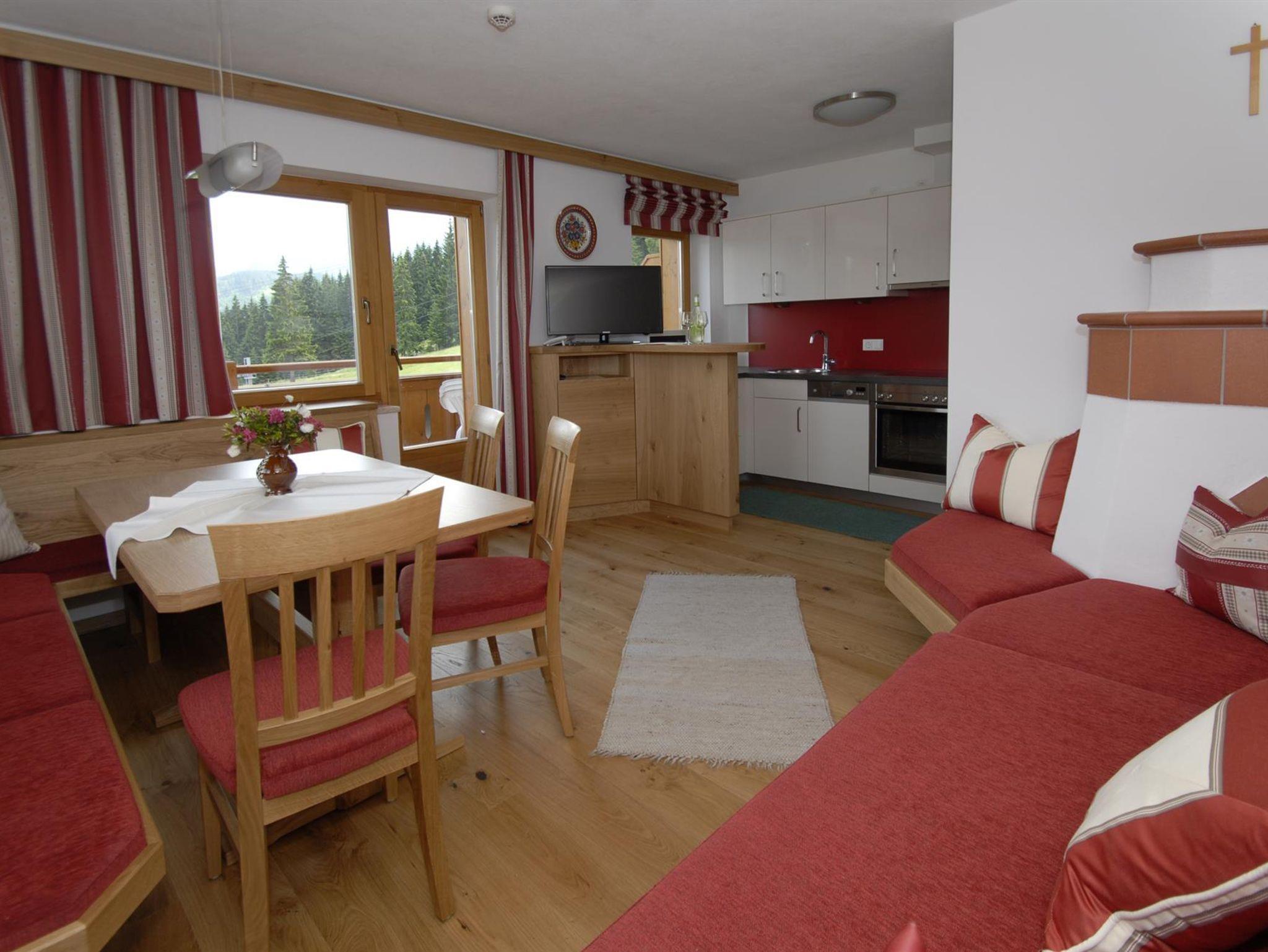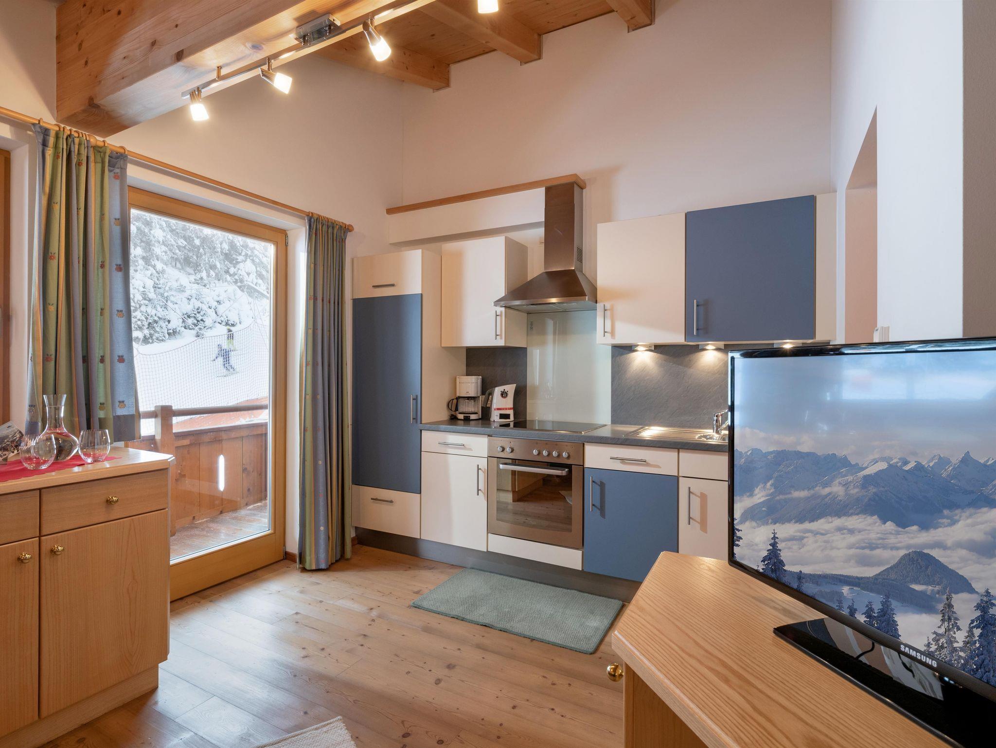 Schlafzimmer in Zirbenholz-Ausführung, Balkon gegen Süden mit Blick zur Gondel, Wohnküche komplett ausgestattet, alles Holzböden, Kachelofen, Bad mit Dusche und WC, Handtücher und Bettwäsche vorhanden.