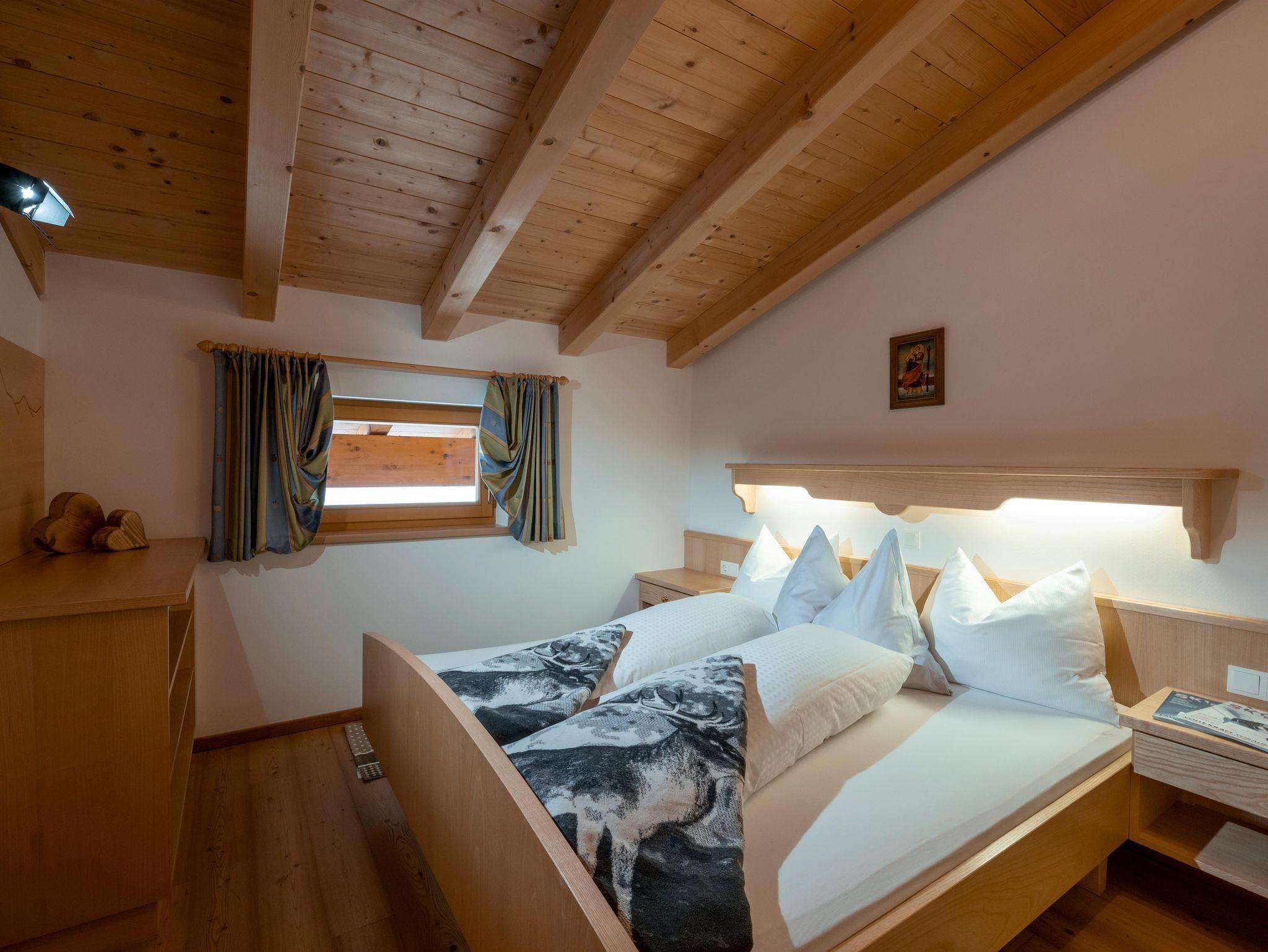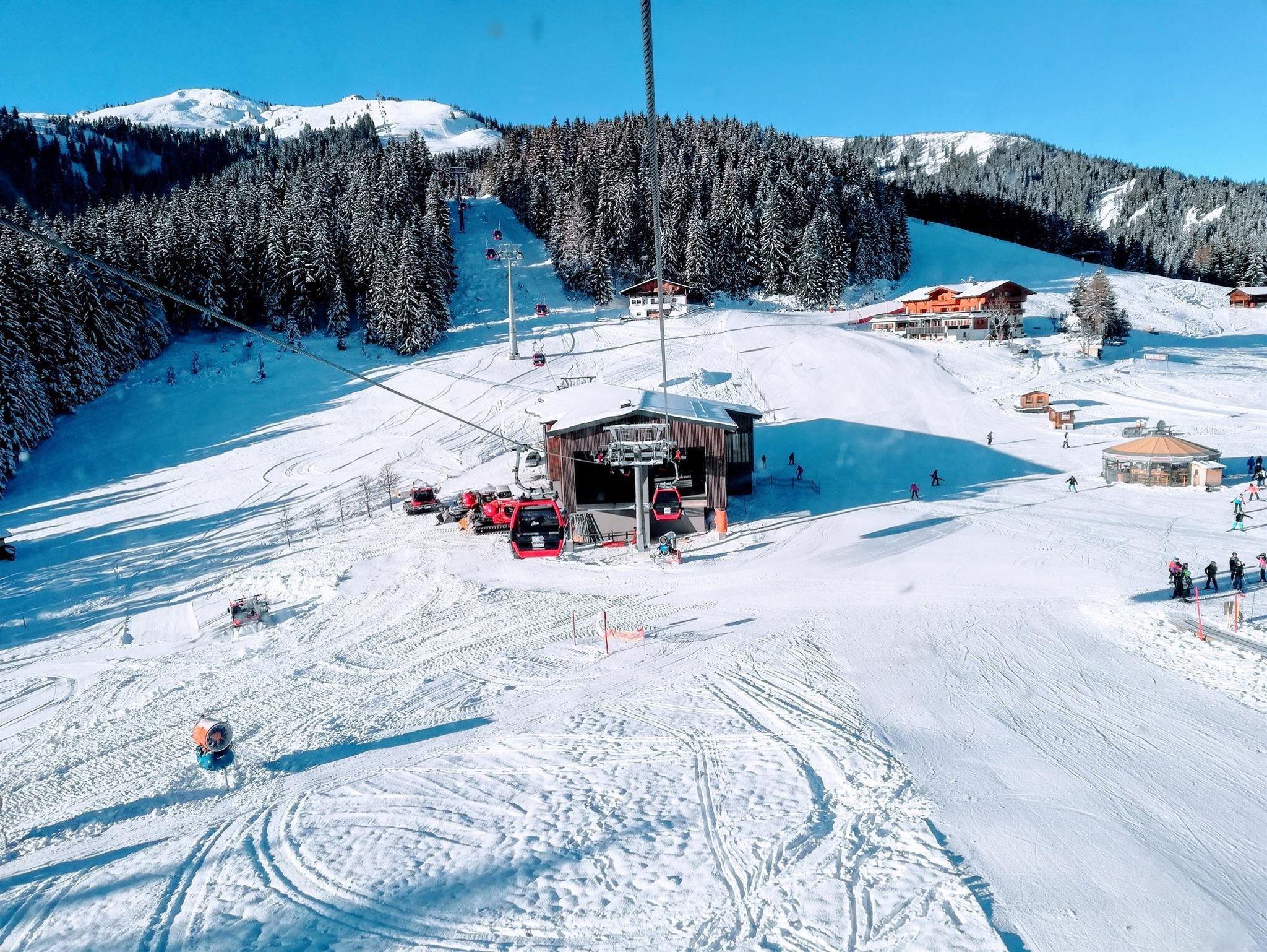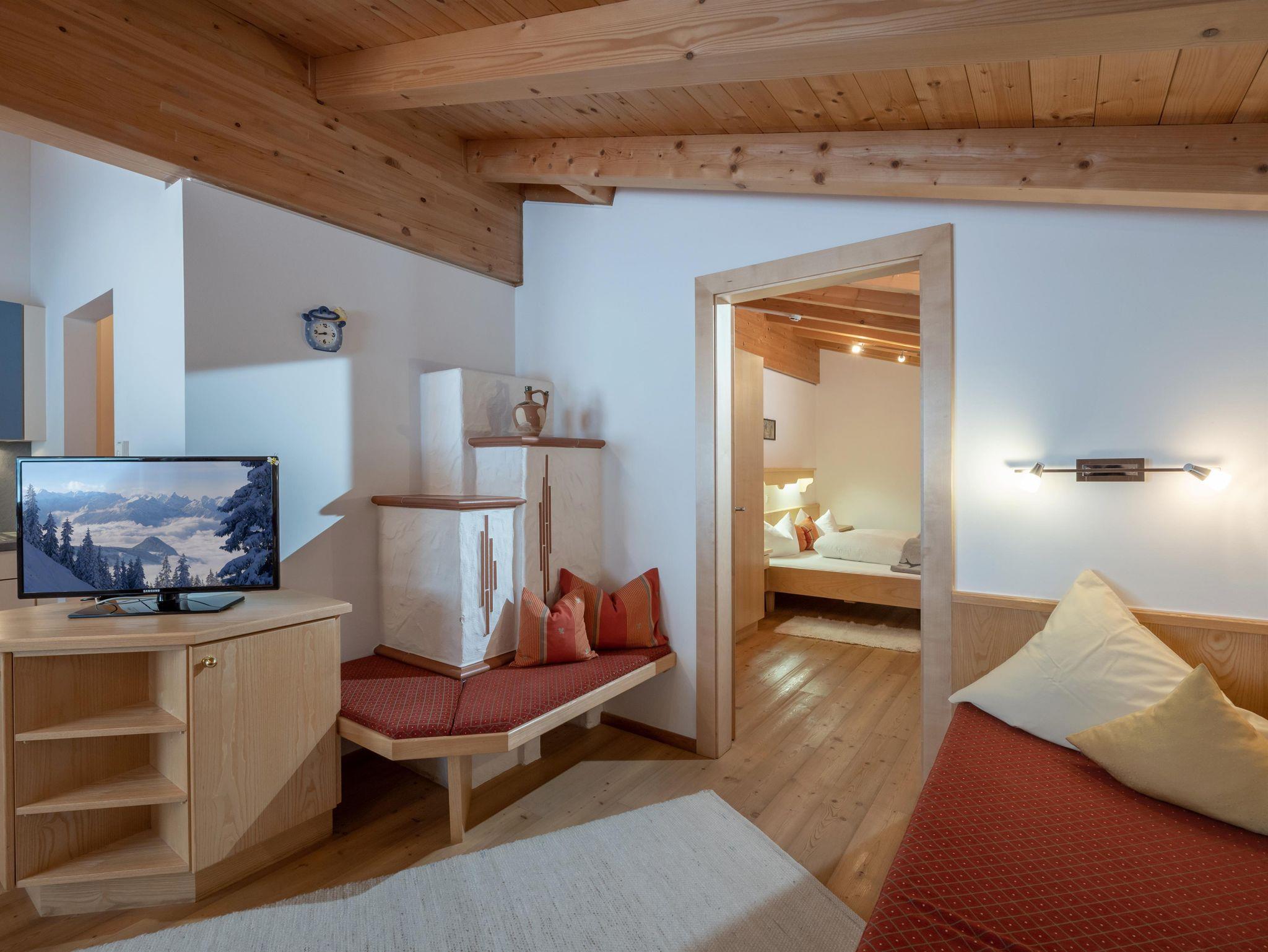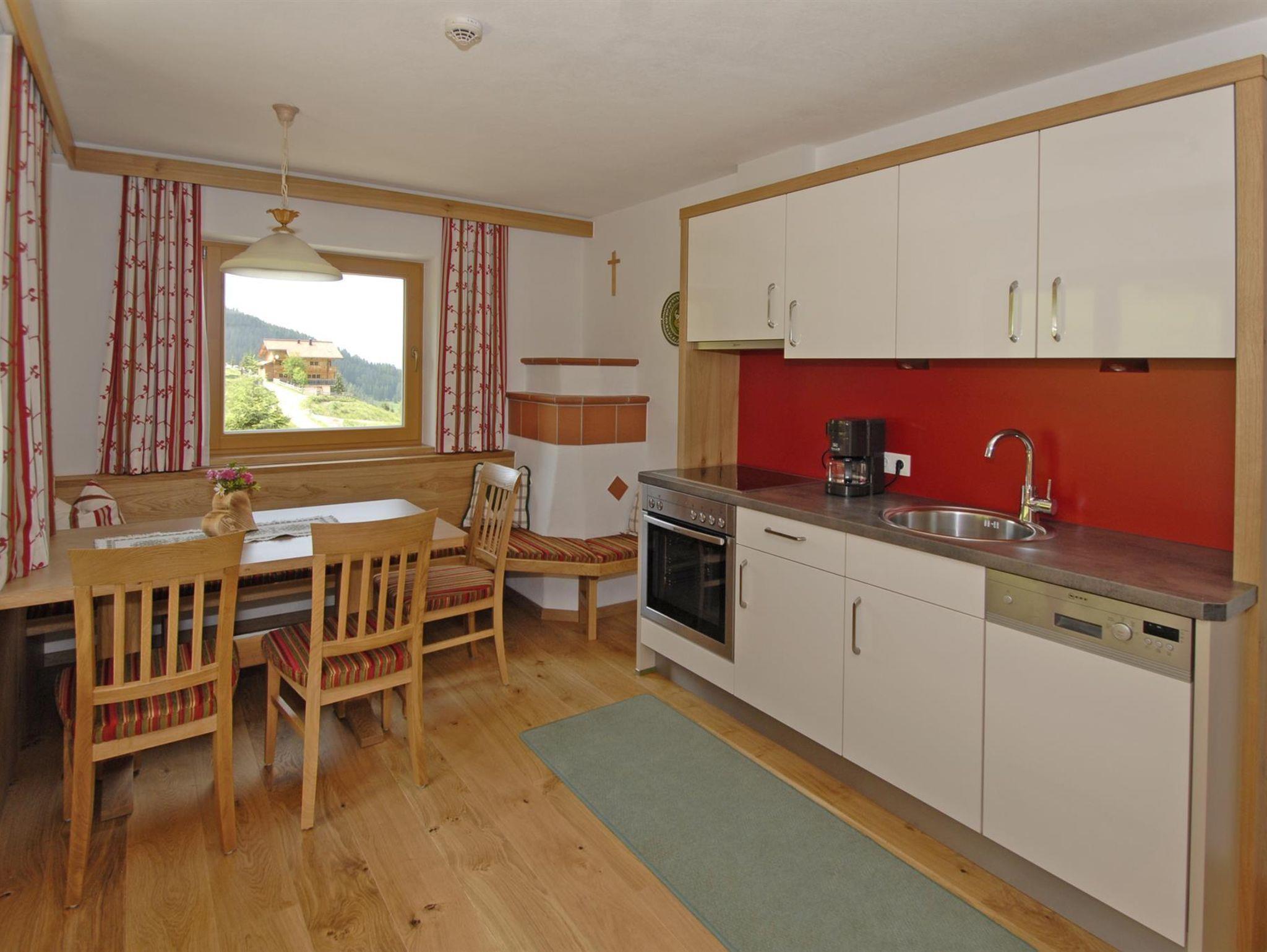 Schlafzimmer in Zirbenholz-Ausführung, Balkon gegen Süden mit Blick zur Gondel, Wohnküche komplett ausgestattet, alles Holzböden, Kachelofen, Bad mit Dusche und WC, Handtücher und Bettwäsche vorhanden.