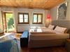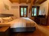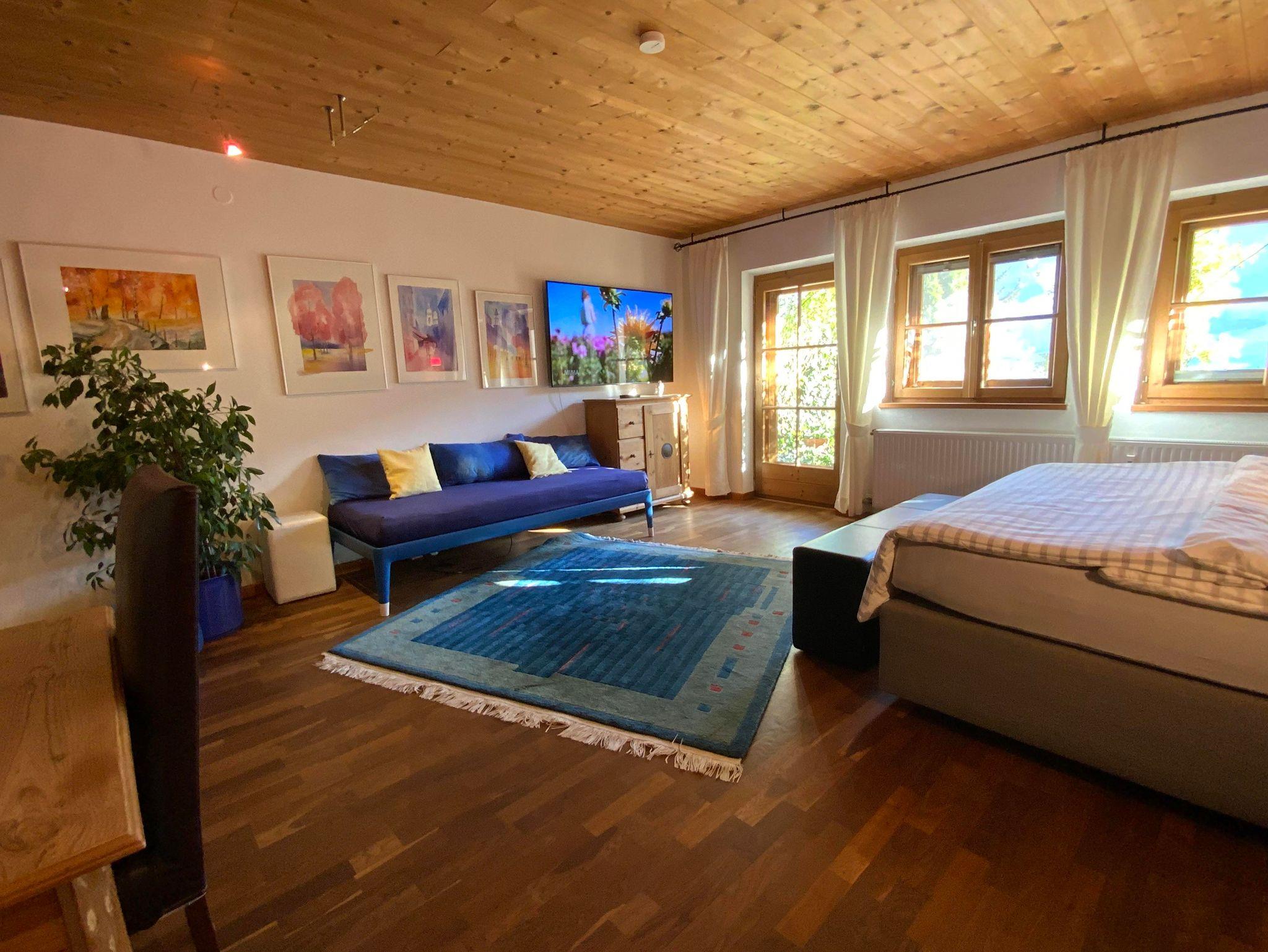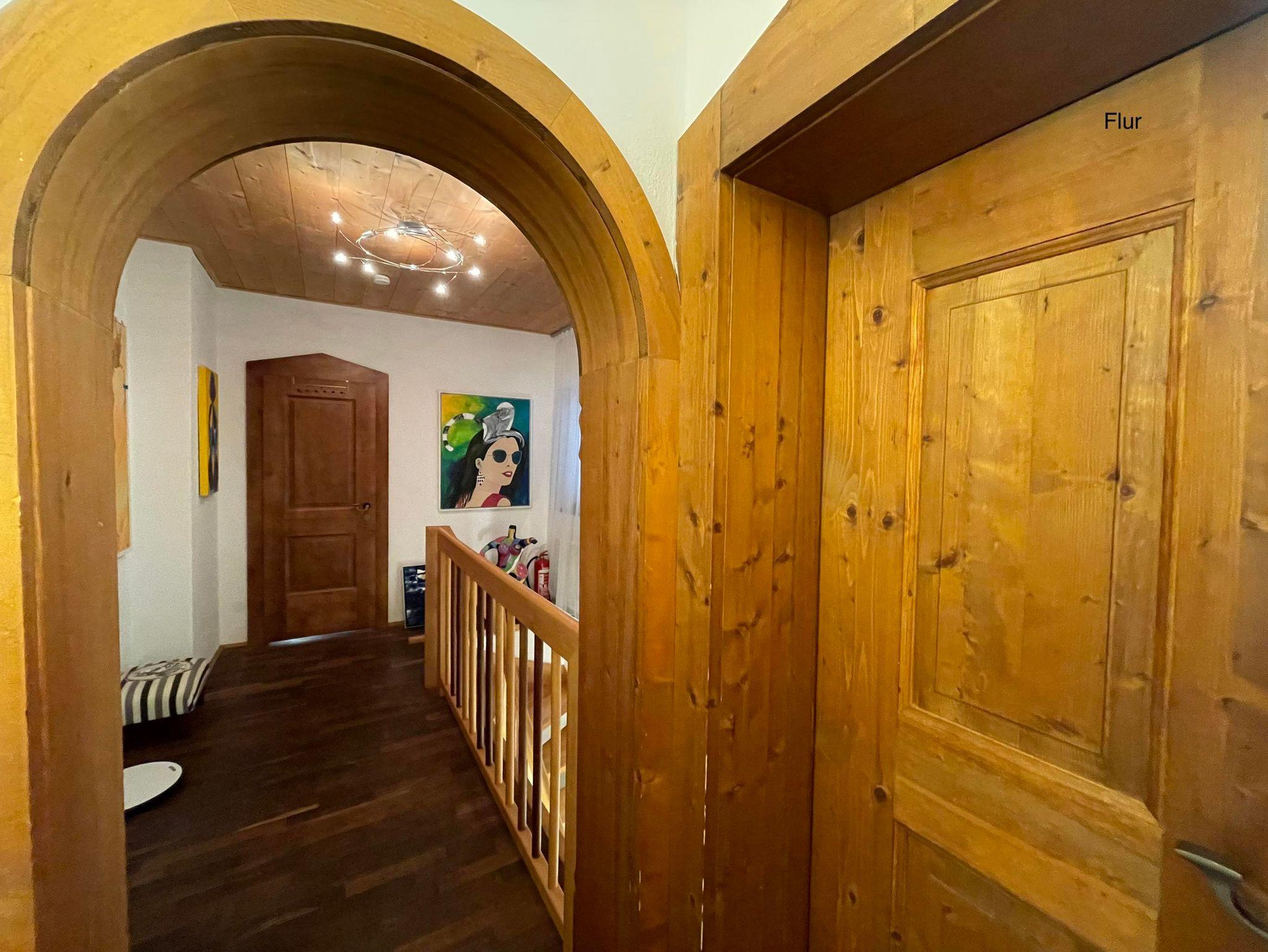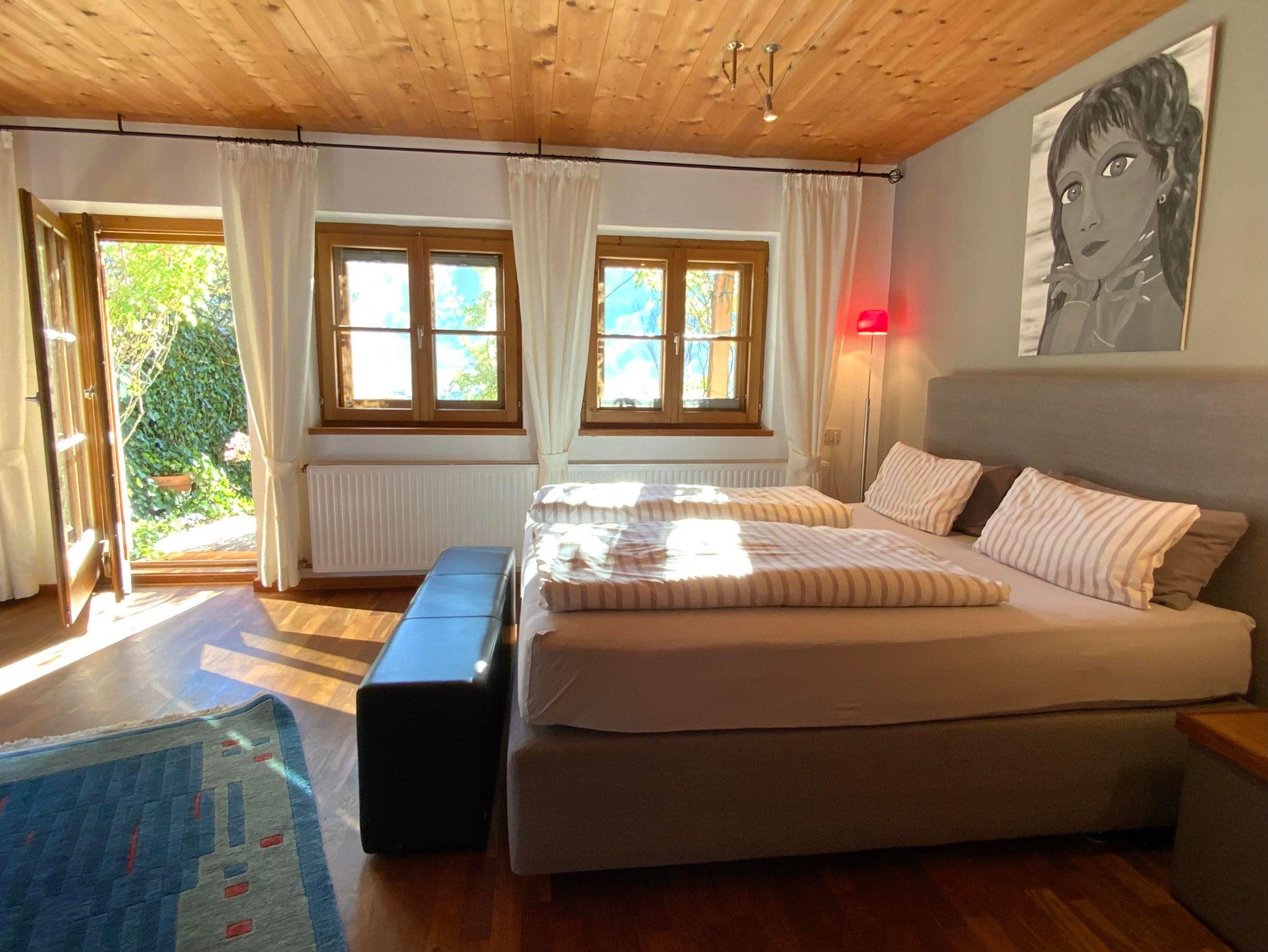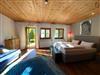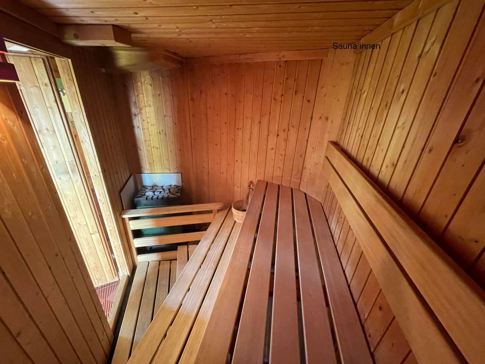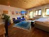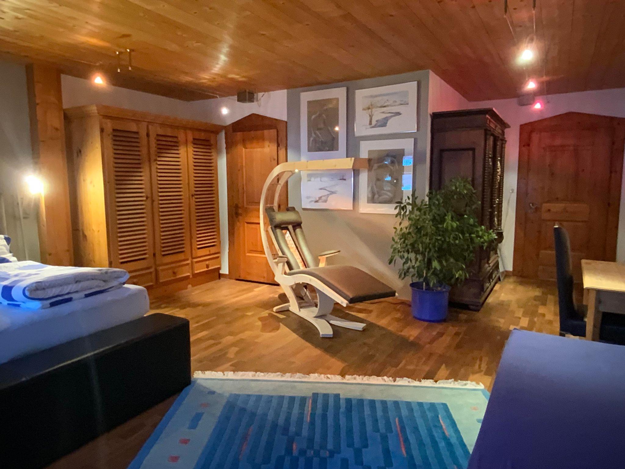 Das Chalet mit 3 Wohnebenen umfasst ein sehr großzügiges Schlafzimmer (Luxusbett 180/200 cm, Daybett 90/200 cm, TV, Infrarot-Wellness-Liege...), angrenzendes Badezimmer, ein weiteres Schlafzimmer ( Bett 160/200 cm ), ein Extra-WC, eine Wohnküche mit Kochinsel und großer Tischgruppe, Ecksofa und TV, einen Schrankraum mit Waschmaschine, Flur. Auf dem angrenzenden Balkon befindet sich auch eine große Tischgruppe. In der oberen Wohnebene befindet sich ein drittes Schlafzimmer, zwei weitere Badezimmer und ein sehr großes Wohnzimmer mit Zugang zur Dachterrasse.Der Garten incl. Außensauna ( 2 Abende pro Woche gratis ) stehen zur alleinigen Nutzung. Unter den Arkaden befindet sich der umfangreiche Fitnessbereich.Die Polsterbetten in Boxspringoptik sind mit hochwertigen Naturlatexzonenmatratzen und Naturbettwaren sowie Baumwollbettwäsche ausgestattet. In das große Schlafzimmer kann auf Wunsch ein Babybett (70/140 cm) gestellt werden. Im gesamten Haus gibt es farbenfrohe, originale Bilder.