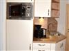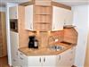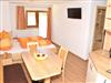 Im Wohnraumschlafraum ist ein Tisch mit Sitzbank und 2 Sesseln, ein Doppelbett, TV, und eine Küche mit Kühlschrank, Wasserkocher, Kaffeemaschine, 2 Herdplatten, Mikrowelle und Minibackofen.