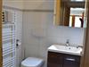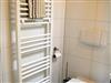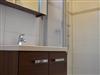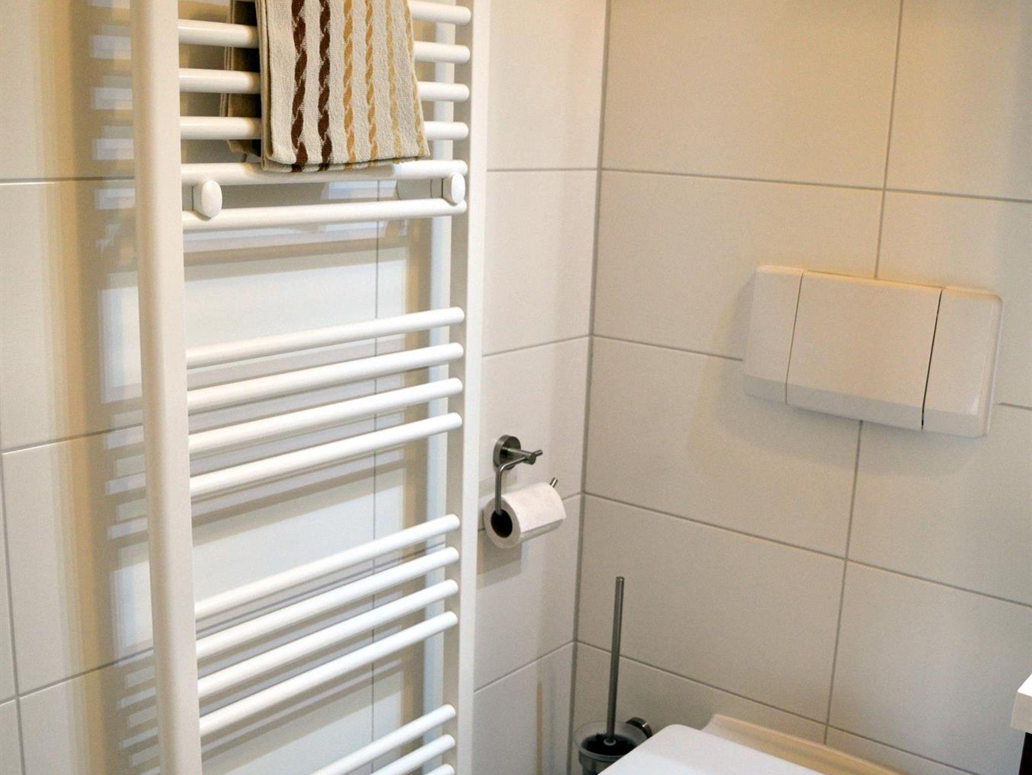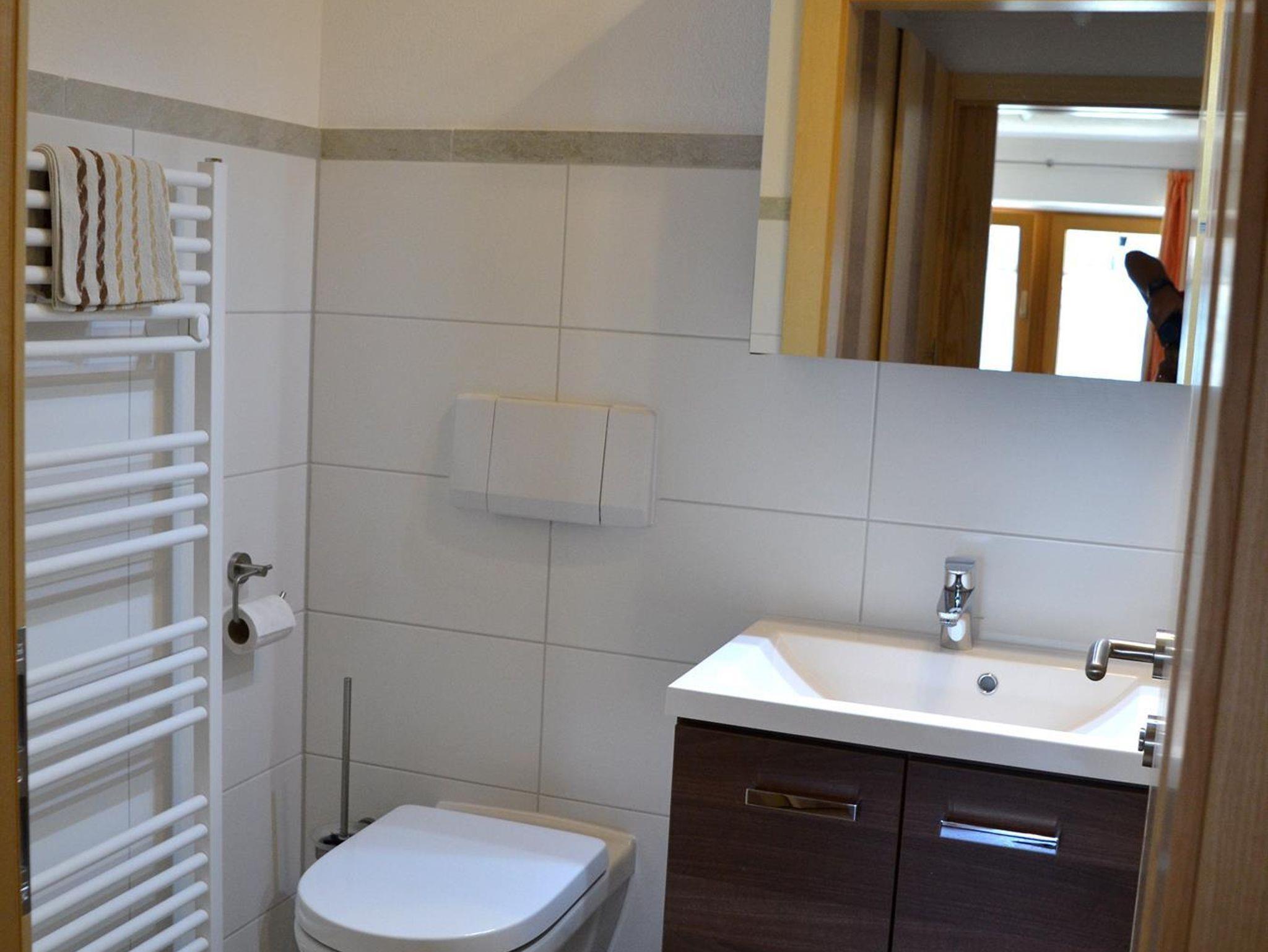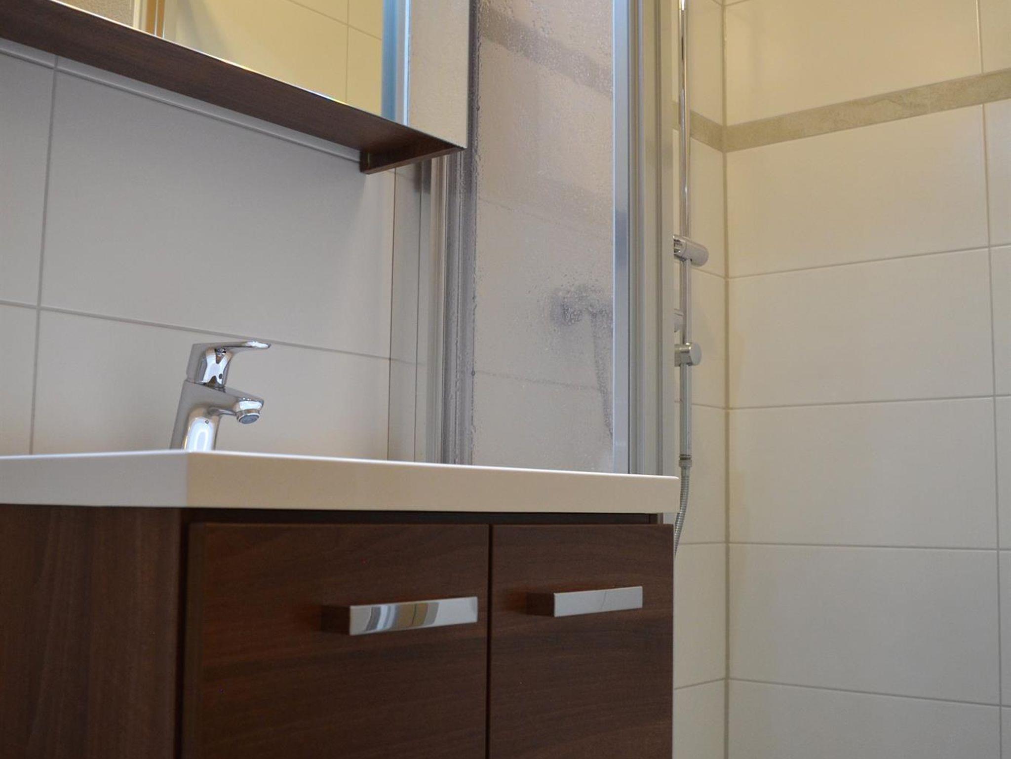 Im Bad befindet sich eine Dusche, Waschbecken und WC.