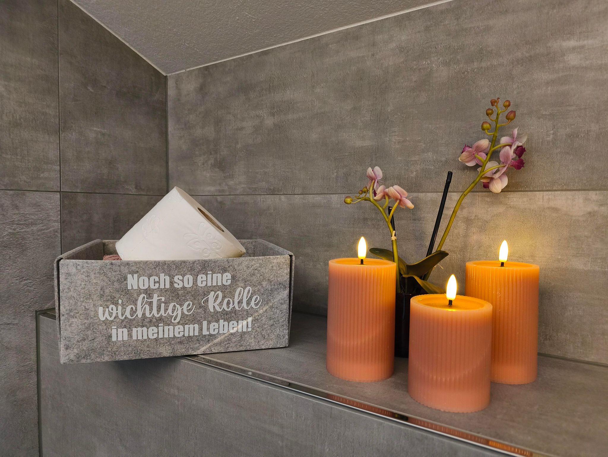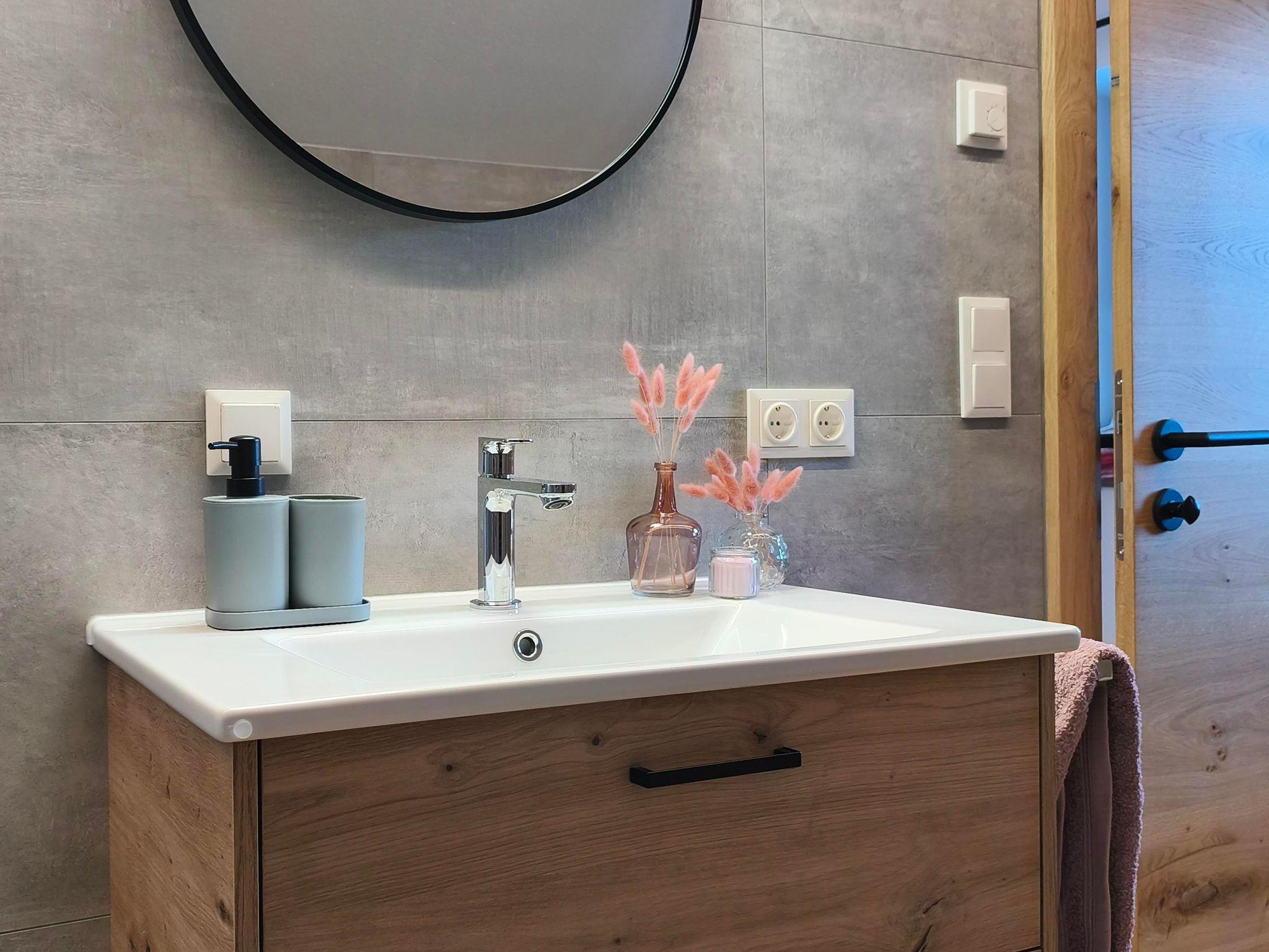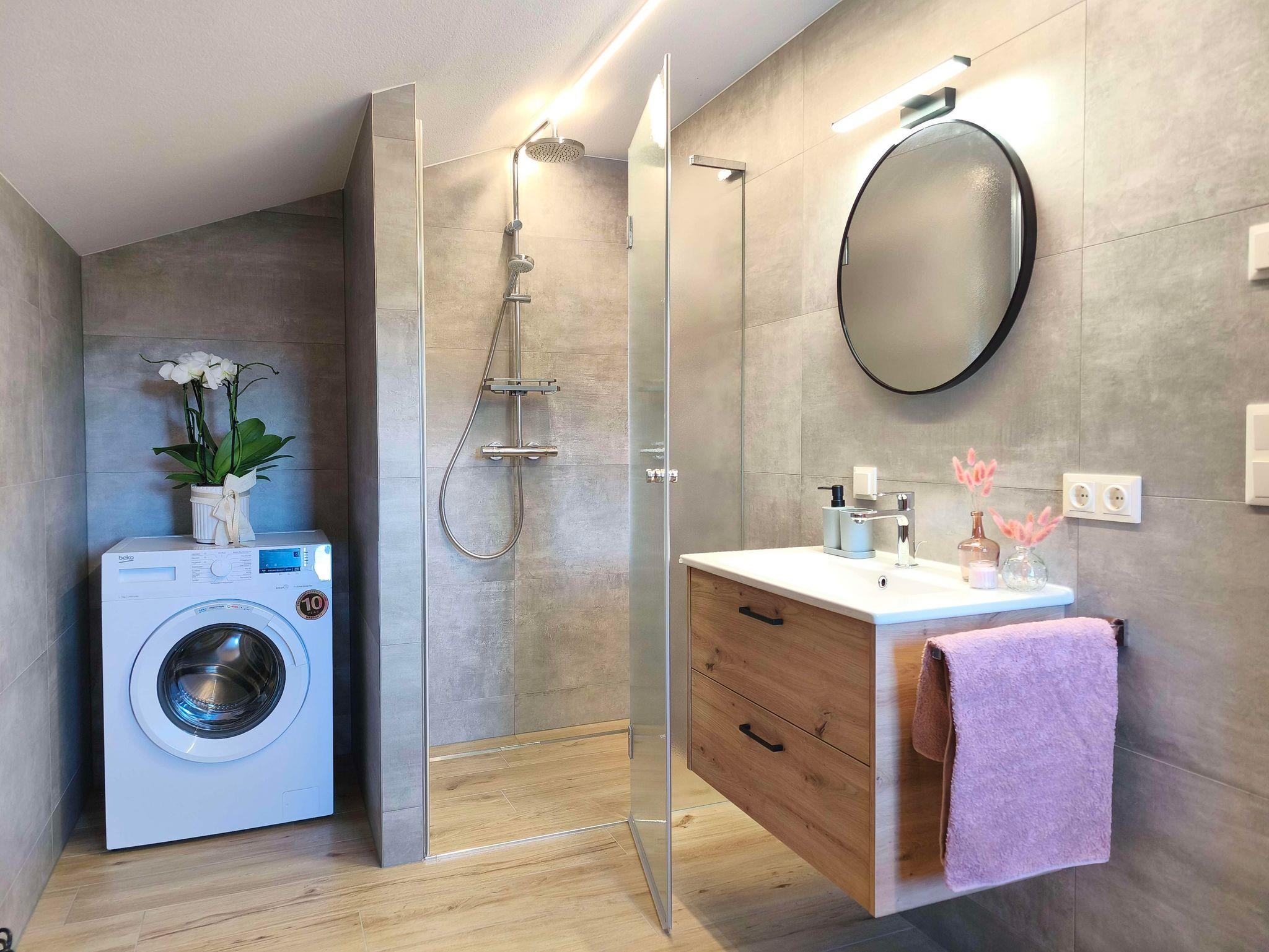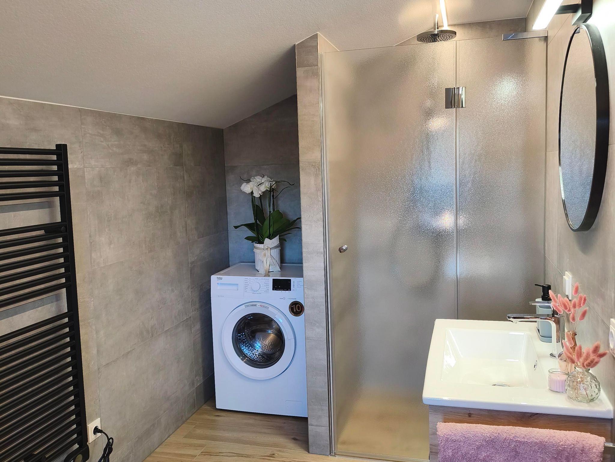 • Badezimmer mit begehbarer Dusche, Handtuchtrockner, Waschmaschine, WC