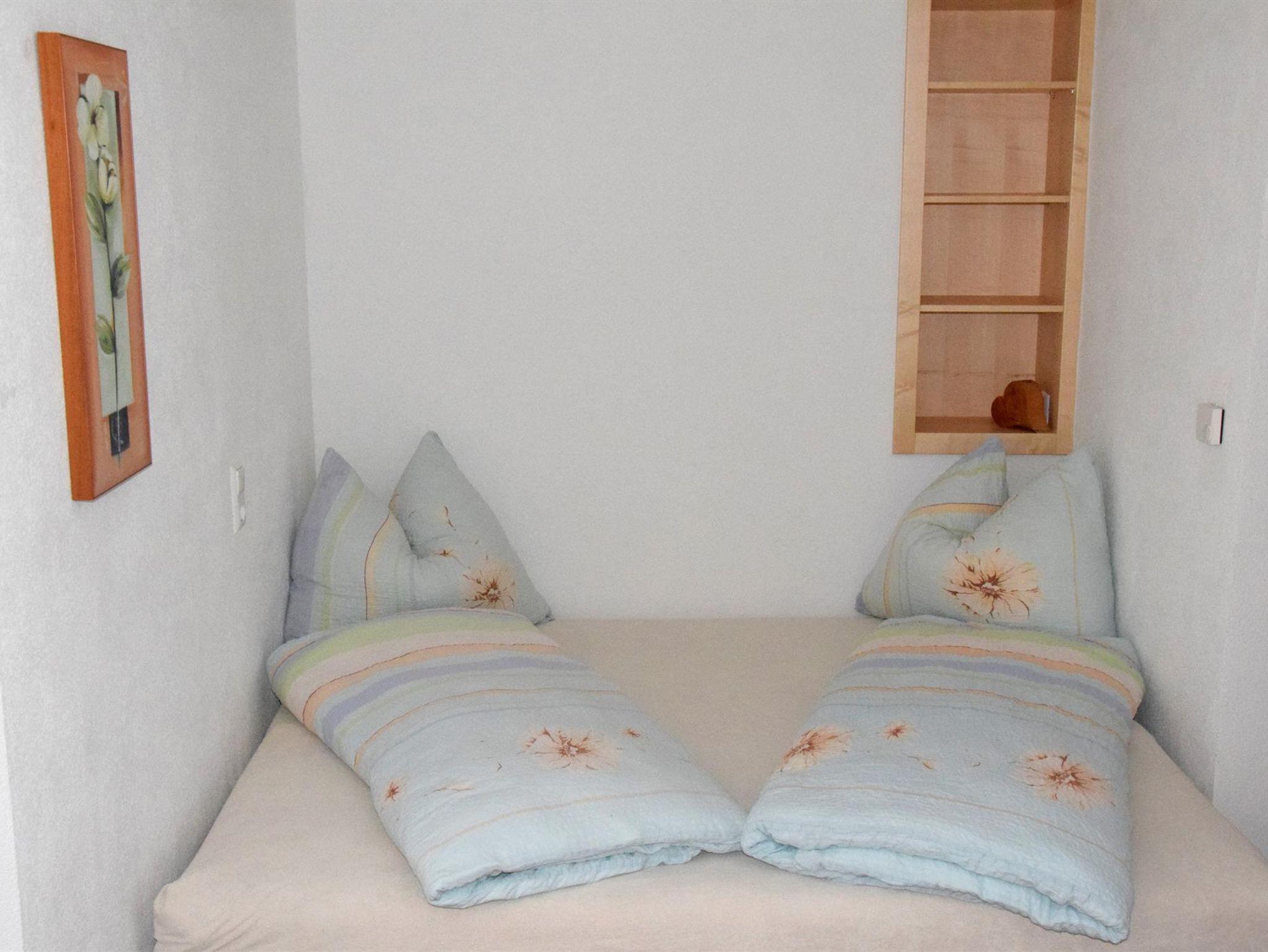 Im abgetrennten Schlafzimmer befindet sich ein Doppelbett.