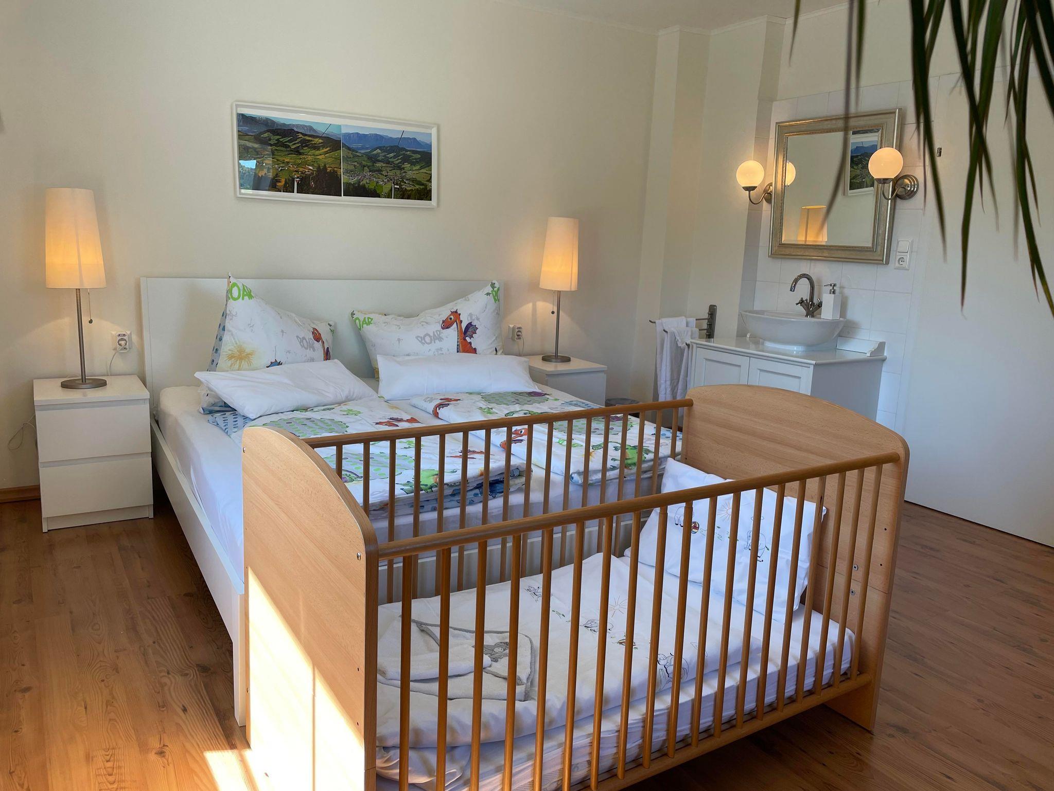 * 2 Schlafzimmer (jeweils ca. 18 m², Doppelbett, Kinderbett etc auf Wunsch verfügbar; 1 Schlafzimmer verfügt über einen Waschtisch; Zusatzmatratze möglich)
