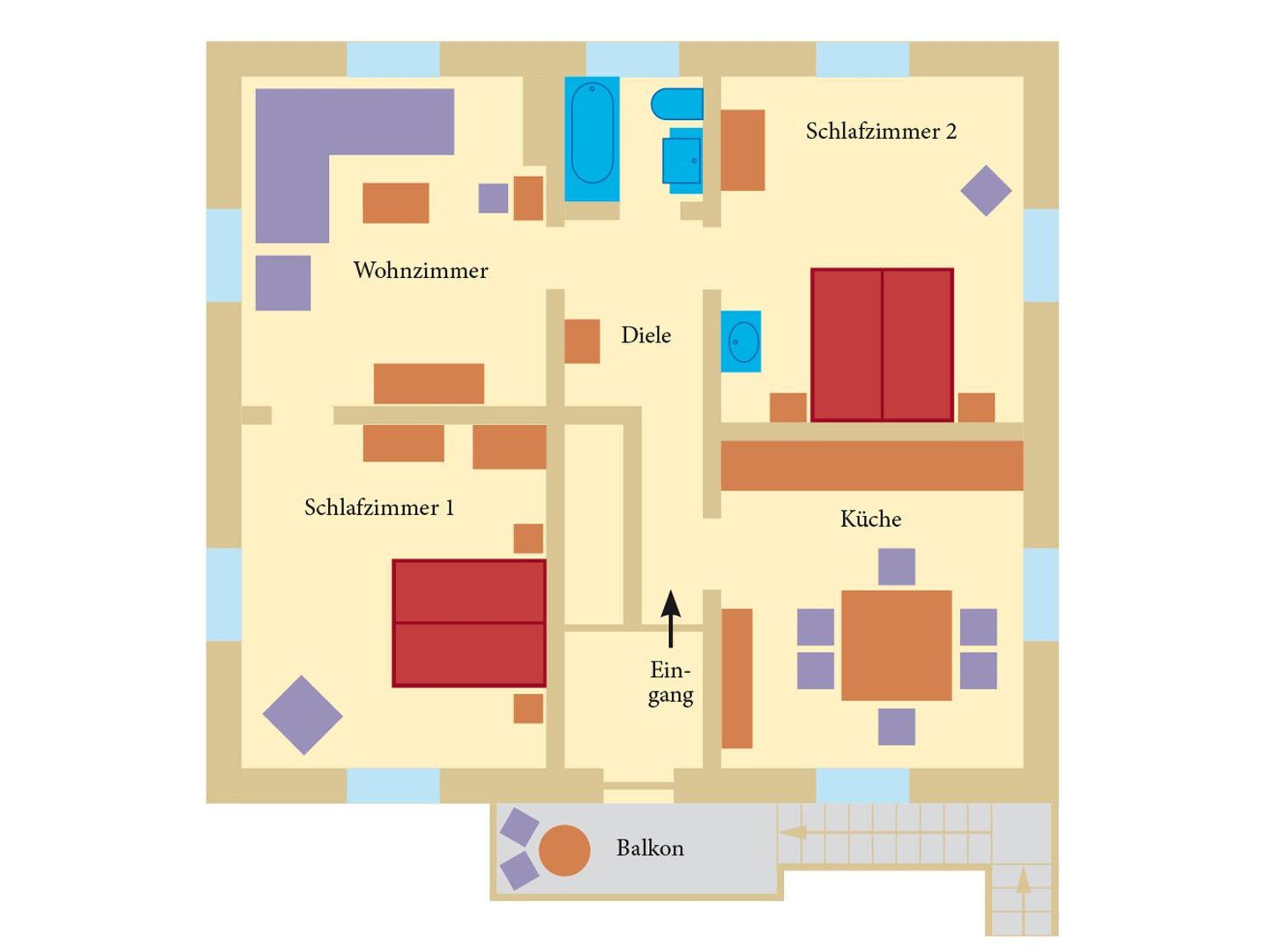 Auf einer Fläche von ca. 80 m² bietet unsere Ferienwohnung für max. 6 Personen reichlich Platz mit folgenden Räumlichkeiten:
