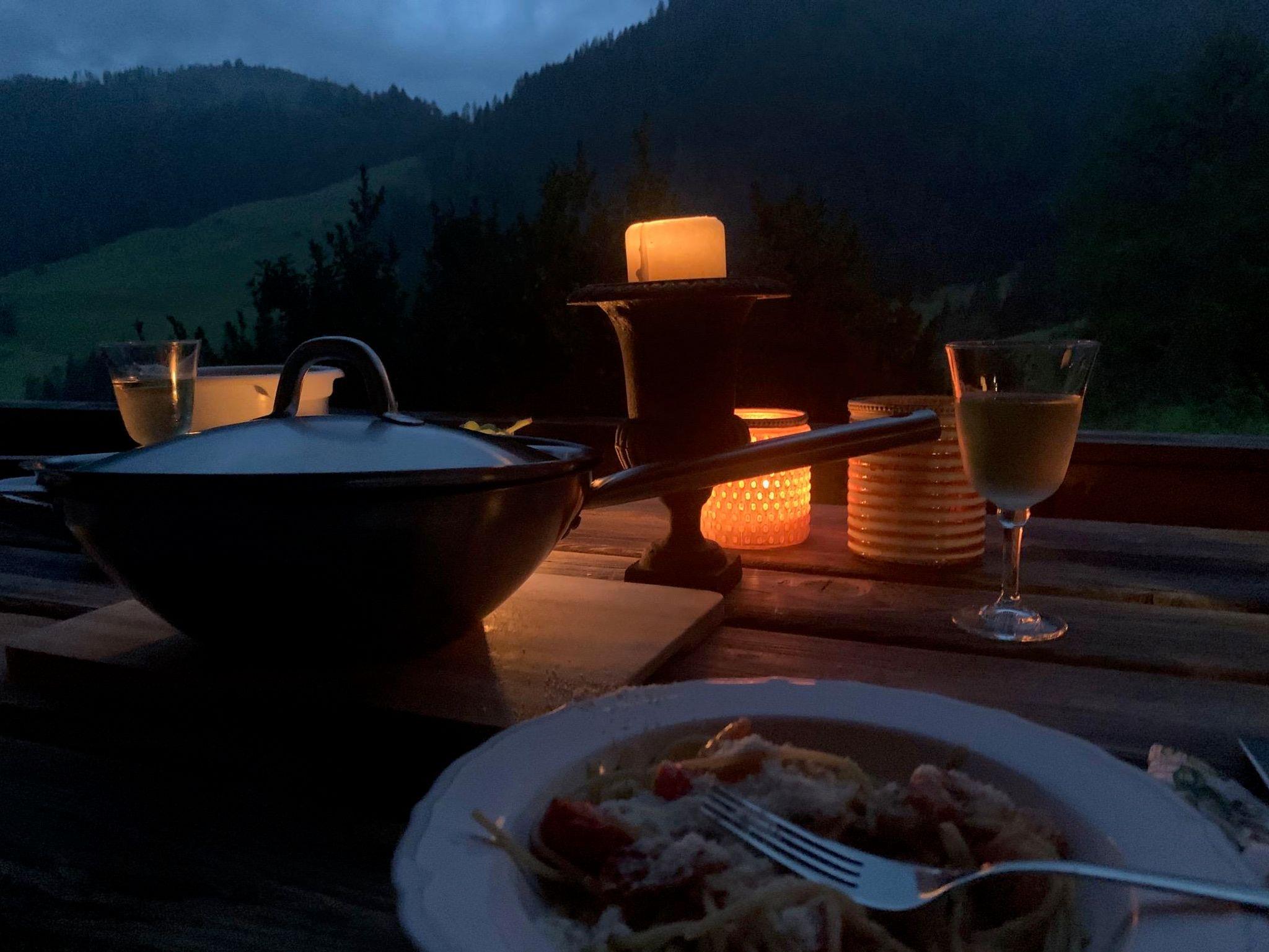 Die Holzterrasse lädt zum Frühstücken bzw. Sterne schauen ein.
