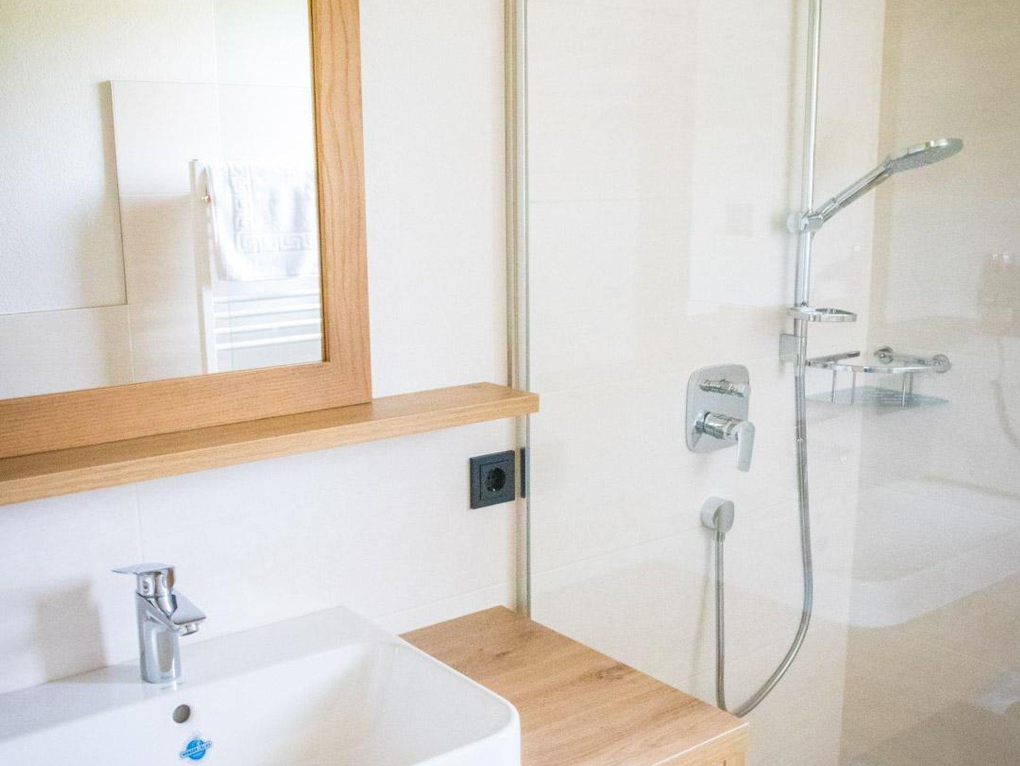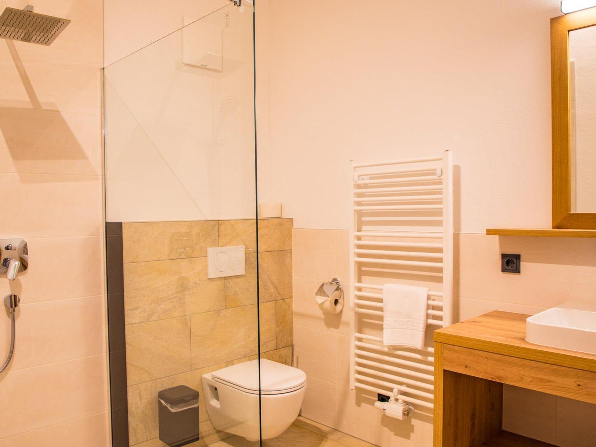 Wohlfühl-Badezimmer mit Dusche und WC, Fliesen-Fußboden, Handtücher und Föhn