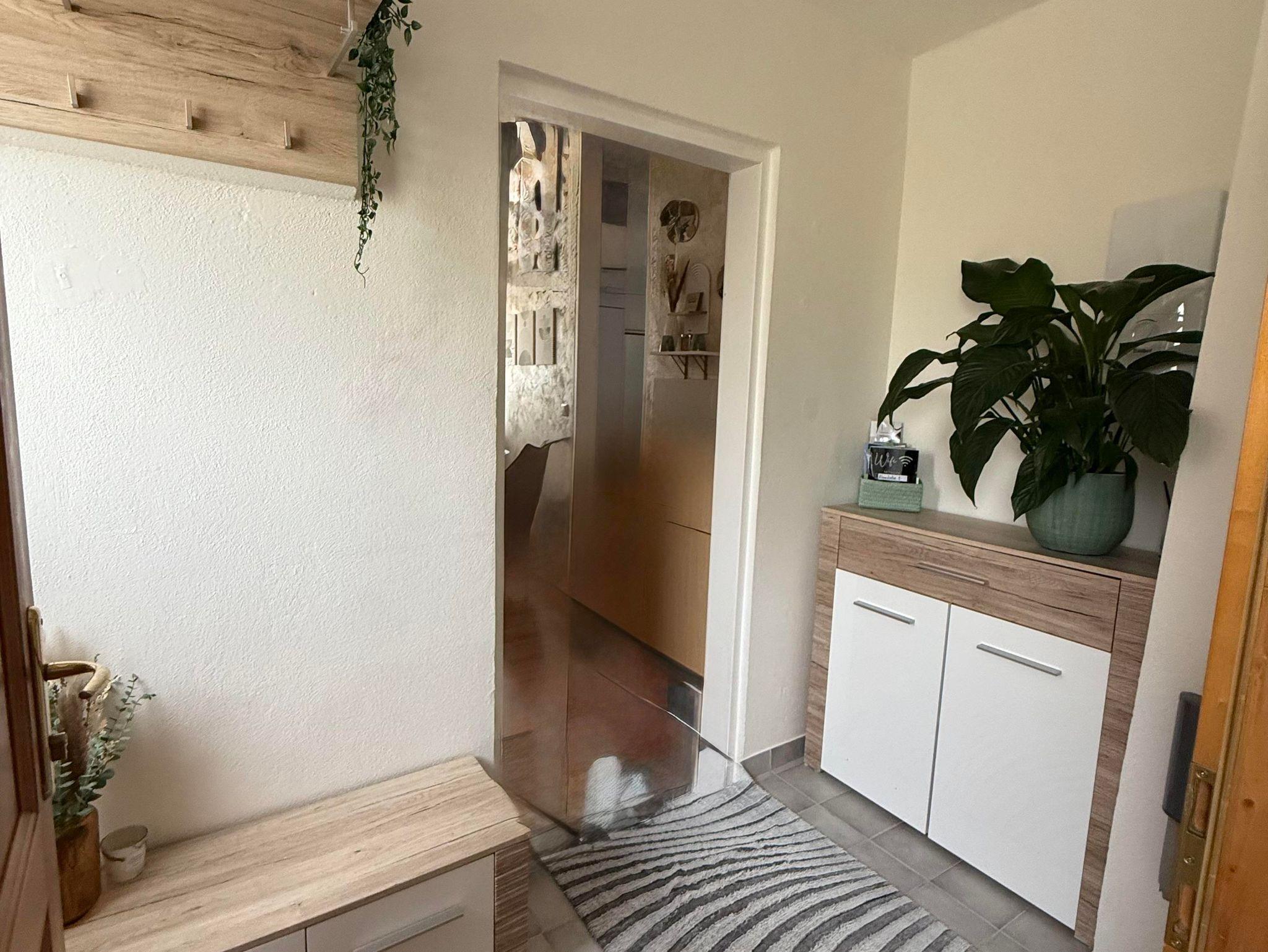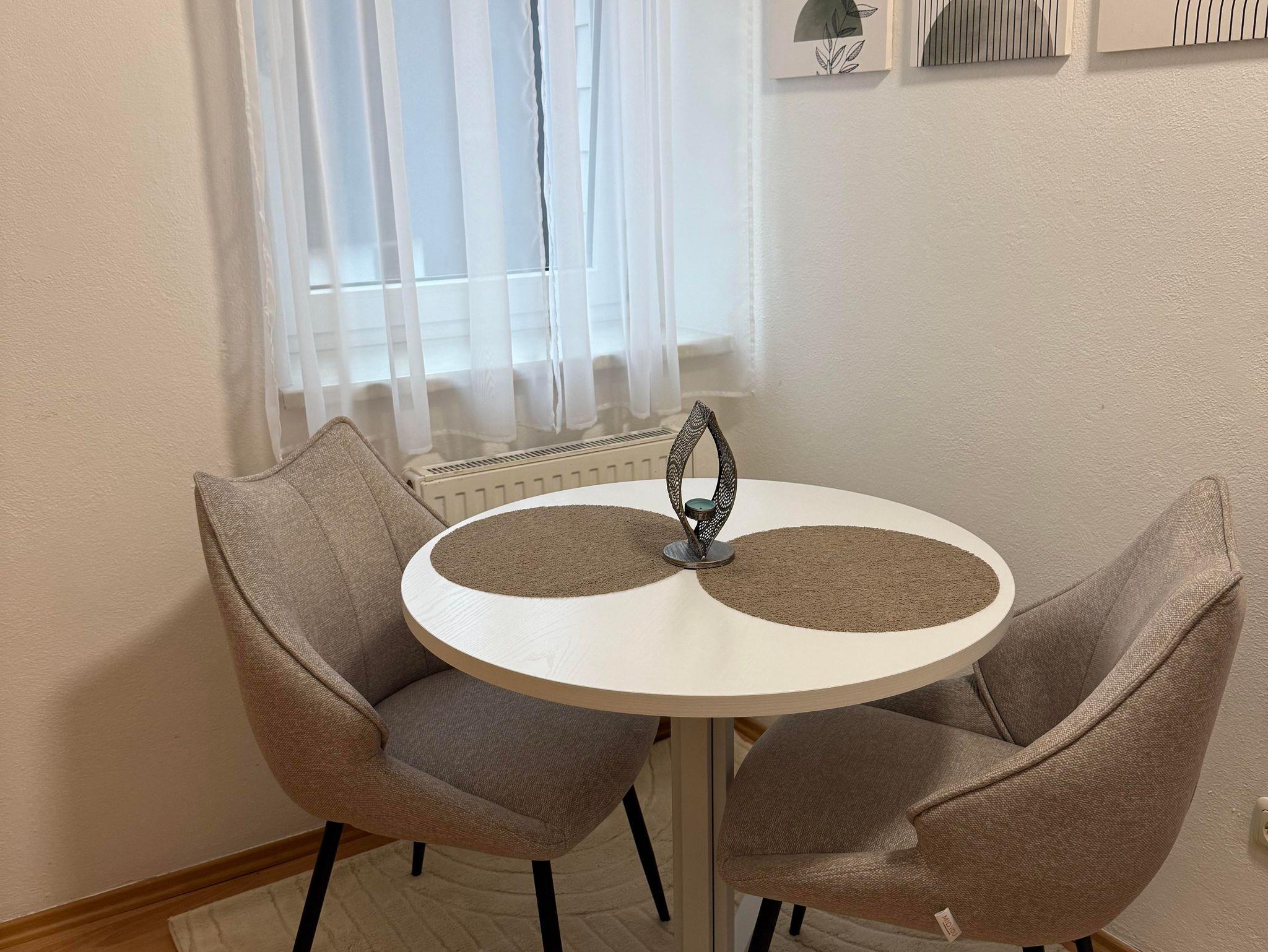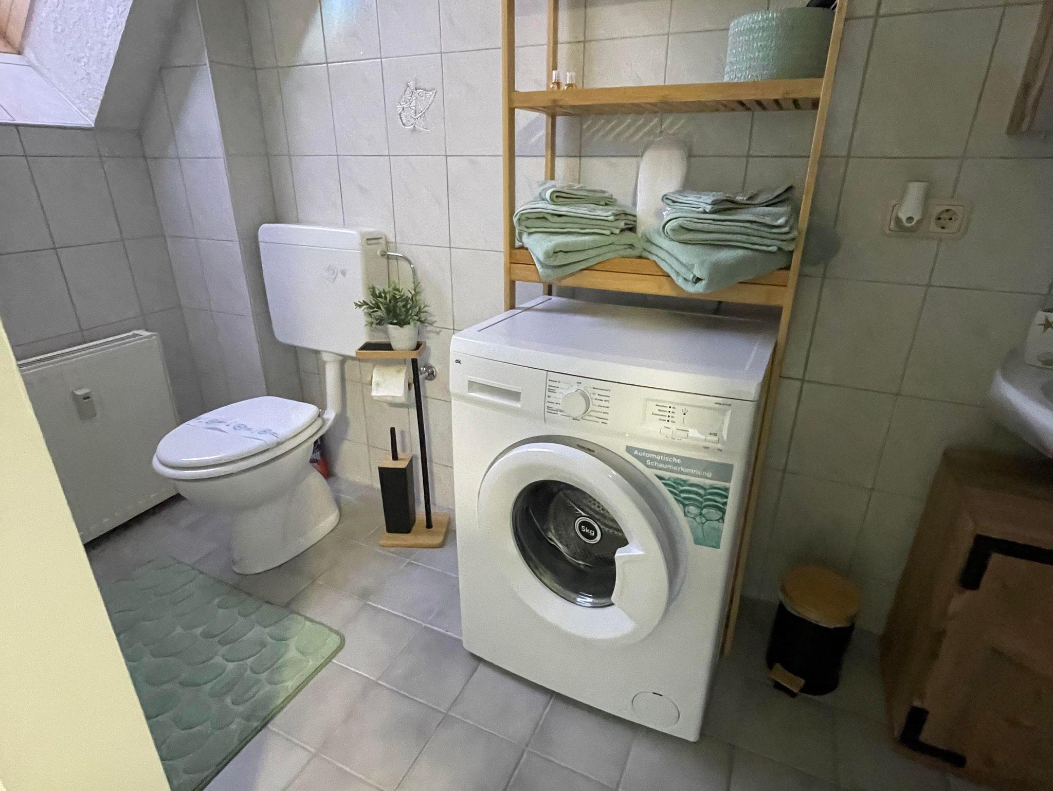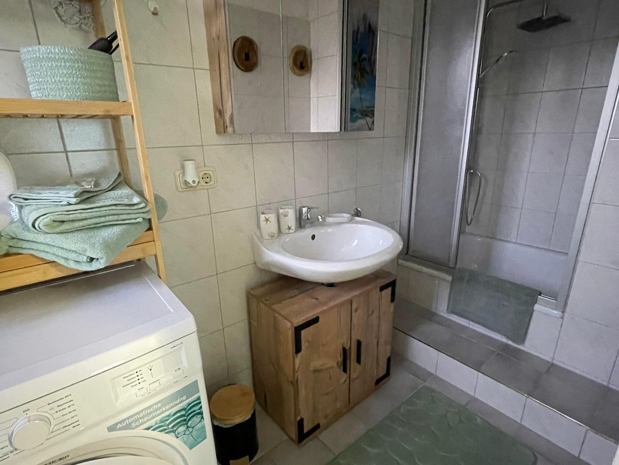 Die Küche ist ausgestattet mit allen notwendigen Annehmlichkeiten, wie einem Kühlschrank, Herd, Kaffeemaschine, Toaster, Wasserkocher und einer Mikrowelle. Eine kleine, einladende Küchenzeile bietet ausreichend Platz zum Kochen und Vorbereiten von Mahlzeiten. Ein kleines Badezimmer mit Dusche rundet die Wohnung ab und sorgt für Bequemlichkeit.