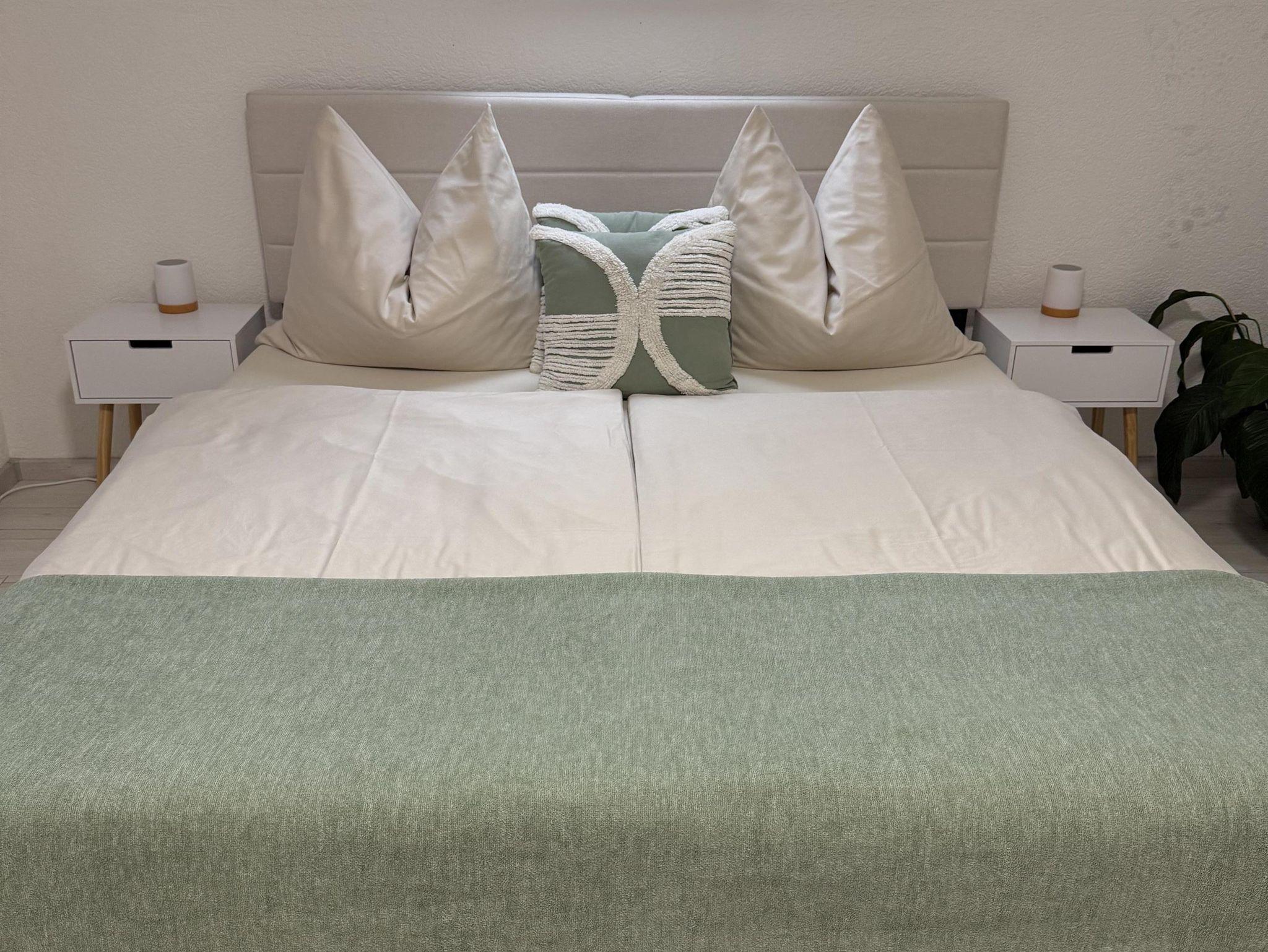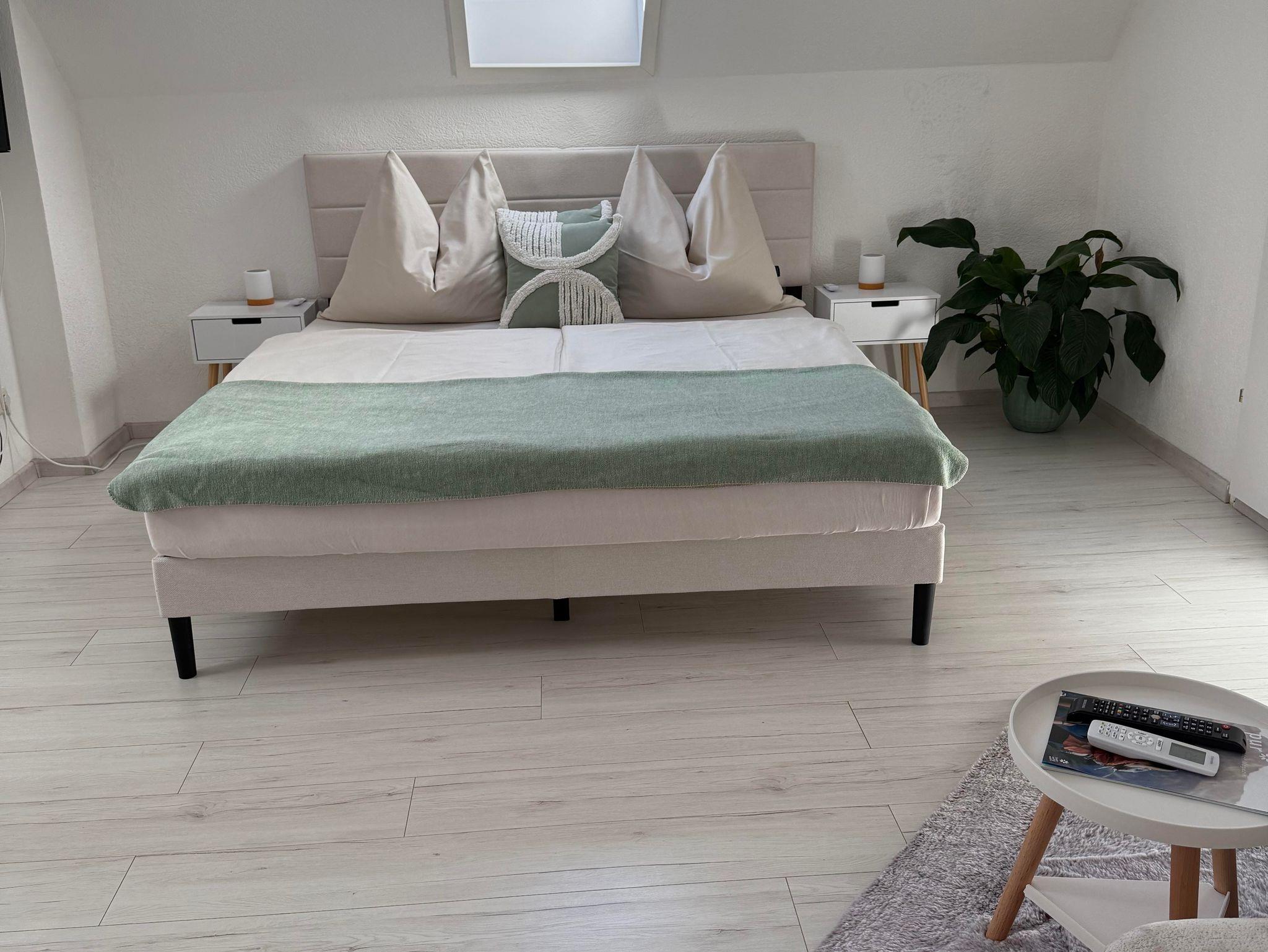 Die kleine Ferienwohnung ist ein stilvolles und funktionales Studio, in dem Schlaf- und Lounge-Bereich harmonisch miteinander verbunden sind. Der Raum ist geschickt gestaltet mit warmen Farben um eine gemütliche Atmosphäre zu schaffen.