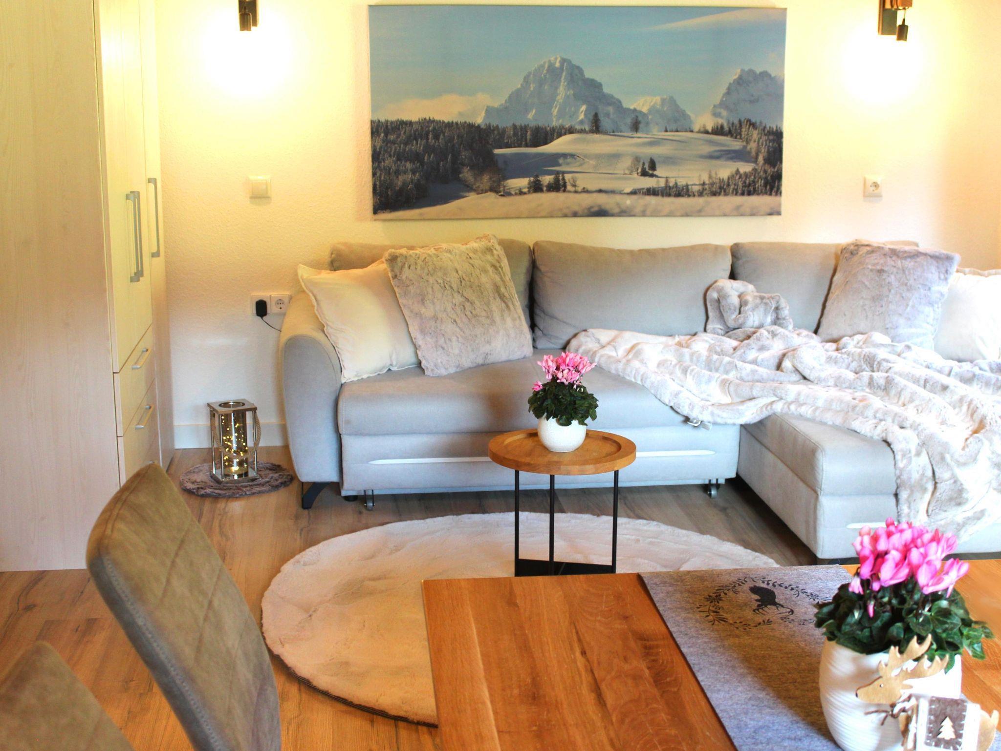 • Gemütliche Wohnecke mit Kuscheldecke und Flachbildfernseher