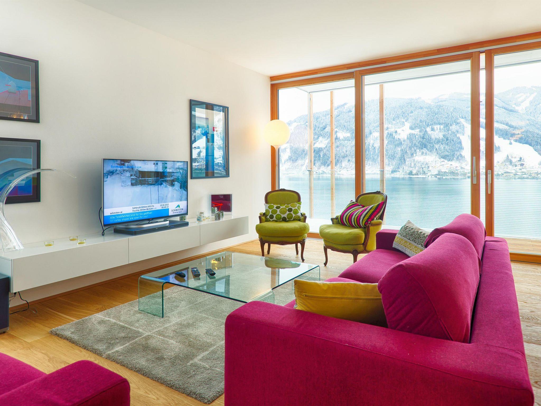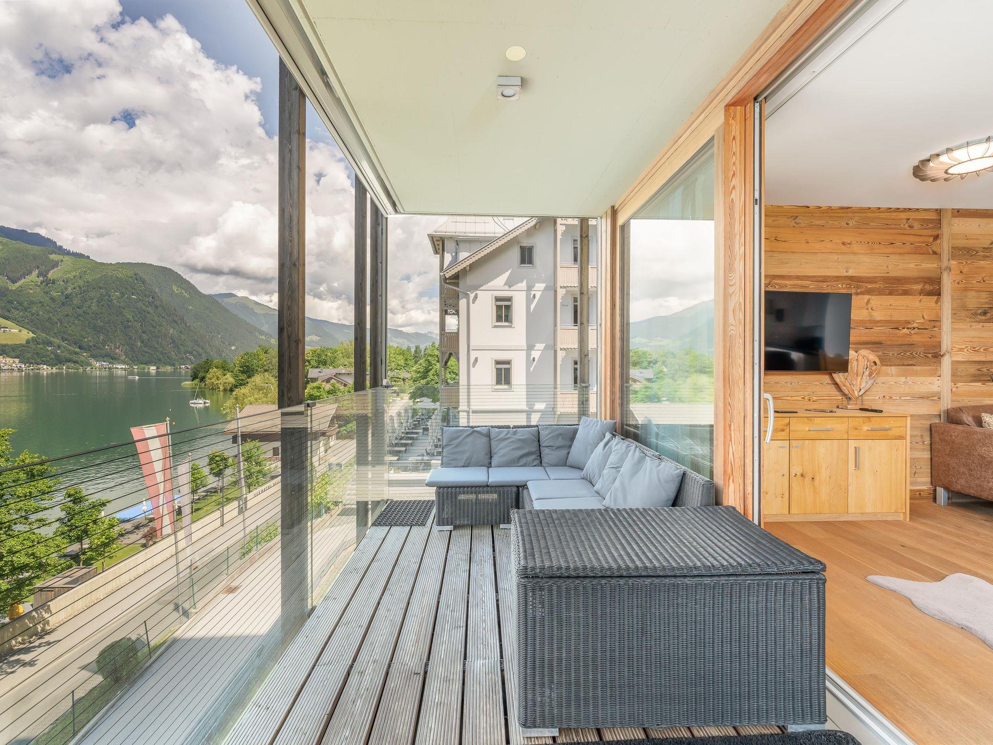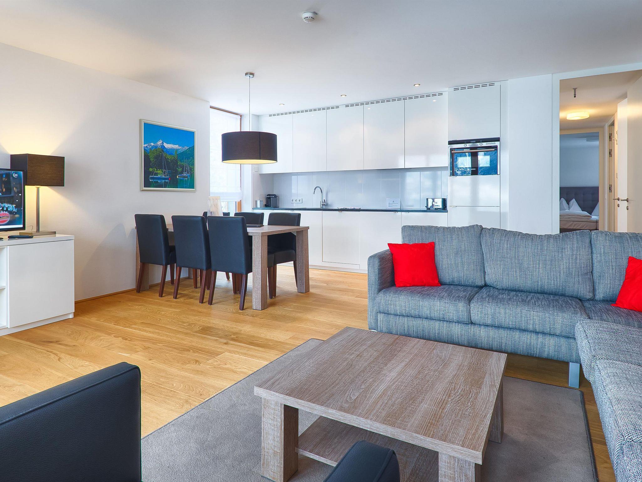 Das neu renovierte Deluxe Apartment mit 85 m2 verfügt über zwei Schlafzimmer, mit jeweils einem Doppelbett, sowie zwei Badezimmer mit Badewanne und Dusche und einem getrennten WC. Das geräumige und großzügige Wohnzimmer im alpenländischen Stil hat einen großen Esstisch und eine offene Designerküche. In der gemütlichen und großzügigen Sitzecke erschließt sich ein wundervoller Blick auf den See und die umliegenden Berge. Von den beiden Balkonen aus genießt man ebenfalls einen herrlichen Blick auf den Zeller See, die Schmittenhöhe und das Kitzsteinhorn.
