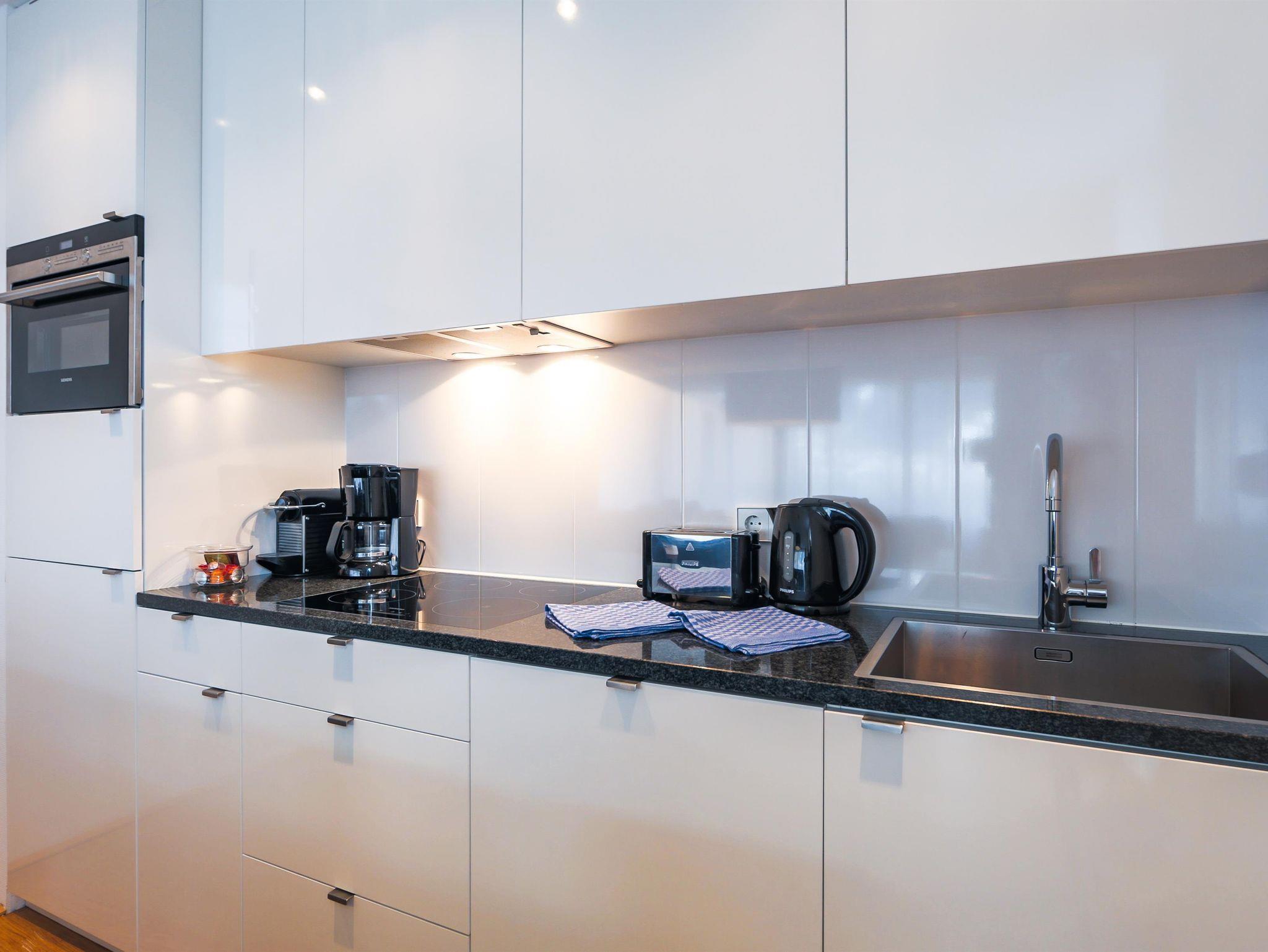 Das Apartment verfügt über drei Schlafzimmer, davon zwei Schlafzimmer mit Doppelbett und ein Schlafzimmer mit zwei Einzelbetten. In dieser Wohnung gibt es zwei Badezimmer mit Badewanne oder Dusche und WC. Das geräumige Wohnzimmer verfügt über einen großen Esstisch und eine offene Designerküche. Der Balkon mit herrlichem Blick auf den See ist vom Wohnzimmer aus zugänglich.