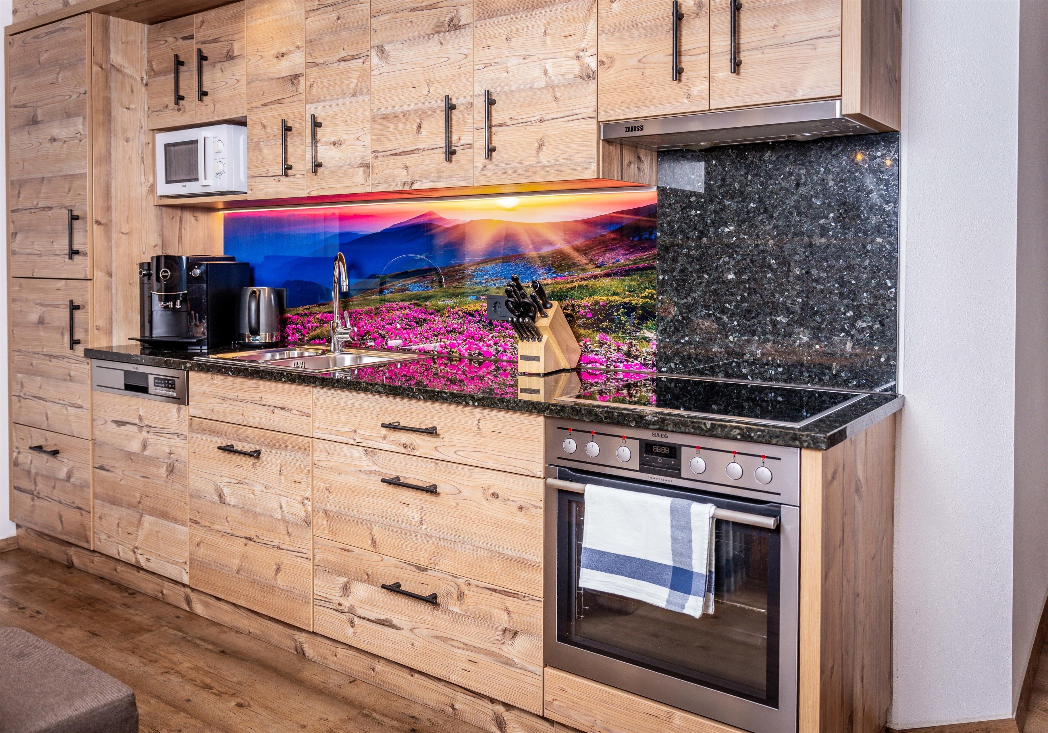 Die große, voll ausgestattete Wohnküche verfügt über einen Kühlschrank mit integriertem Gefrierschrank, Mikrowelle, vollautomatische Kaffeemaschine, Wasserkocher, Geschirrspülmaschine, Ceran-Herd mit Dunstabzug, Backofen, Eierkocher, reichlich Geschirr, Geschirrhandtücher und Fußbodenheizung.