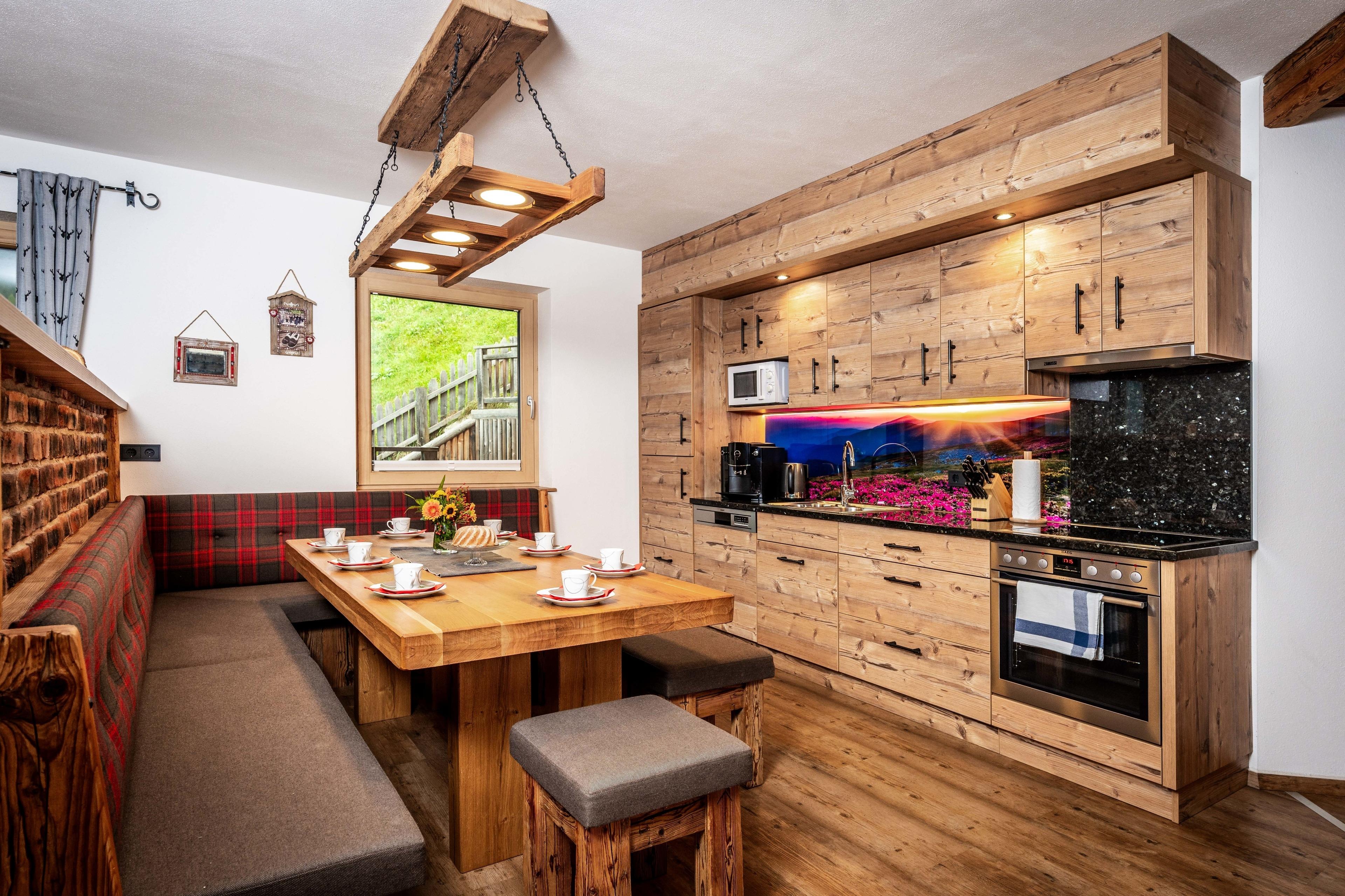... einem im Tiroler Stil eingerichteten Essbereich mit voll ausgestatteter Küche