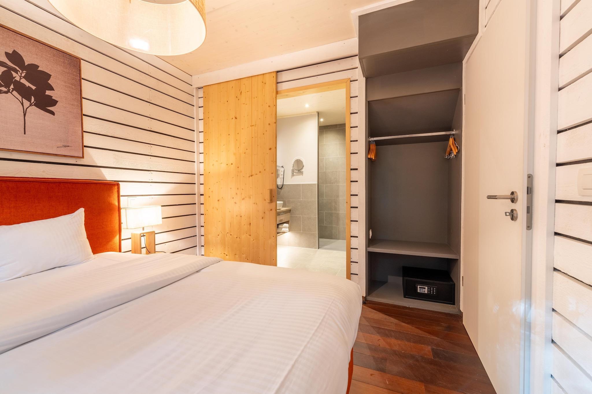 Flygt til naturen i dette hyggelige sommerhus med skovudsigt i det prisbelønnede Your Nature-resort, beliggende i Domaine du Bois de Fouage. Perfekt til 4 gæster, dette charmerende tilflugtssted tilbyder komfort og ro kun 15 km fra Tournai. Stueetagen har et privat soveværelse med en dobbeltseng (160x200 cm), en-suite bruser, håndvask og toilet. Ovenpå på mezzaninen kan du nyde et opholdsrum i åbent plan med en ekstra dobbeltseng, et fuldt udstyret køkken (ovn, køleskab, fryser, opvaskemaskine, elkedel og kaffemaskine), et smart-tv, pejs, spiseplads og adgang til en naturskøn terrasse med udsigt over skoven. Gæsterne har delt adgang til indendørs og udendørs pools, en padelbane, cykelopbevaring, havemøbler og offentlig parkering. Resortet er bilfrit indeni, men golfvogne og cykler kan lejes. Gratis trådløs internetadgang er inkluderet. Kun 250 m væk kan du nyde brunch på La Maison eller udforske vandrestier, wellness-behandlinger og nærliggende vartegn som Castle Antoing og Tumulus du Trou de Billemont. Bemærk: Svømning i søen og fiskeri er ikke tilladt.